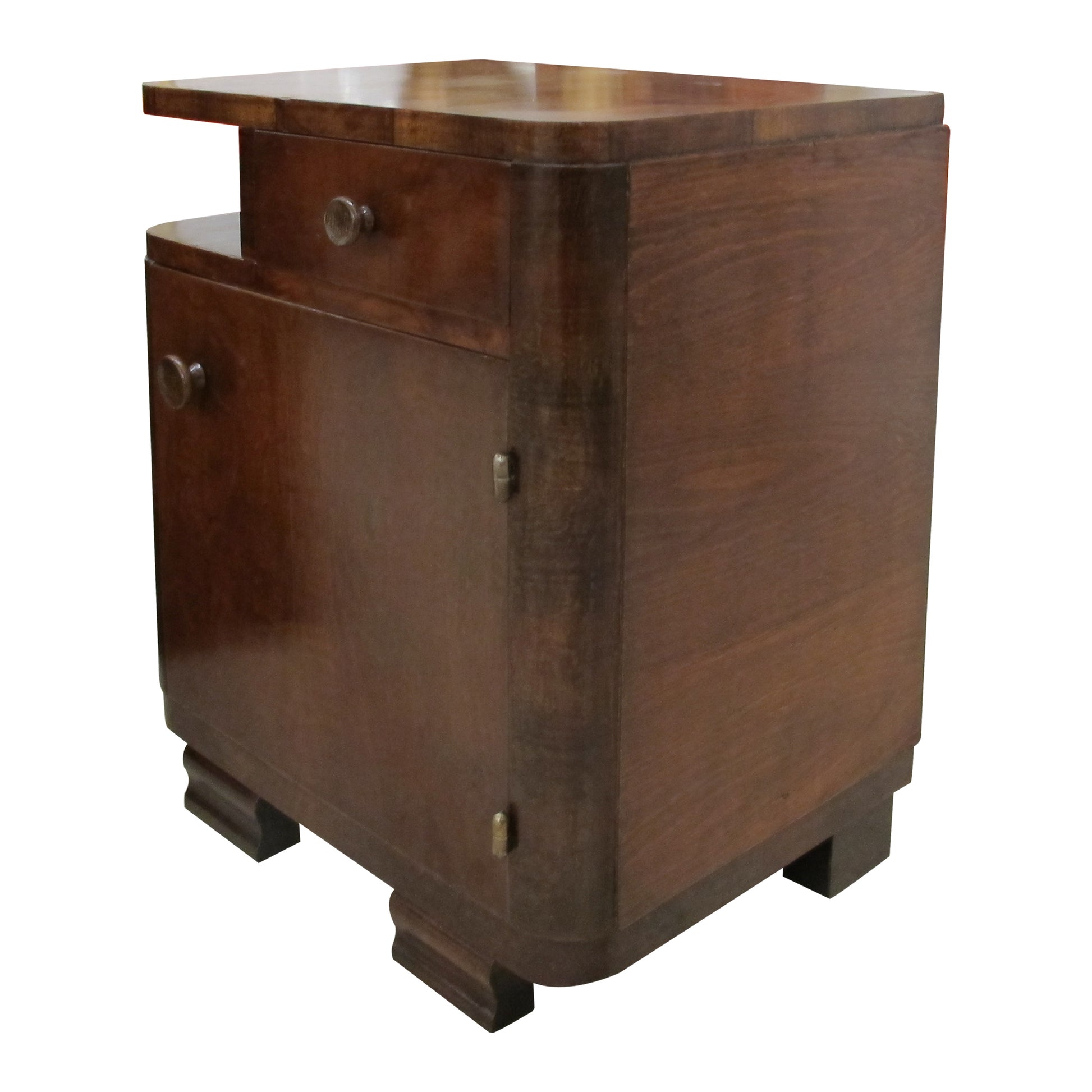 A pair of French Art Deco bedside tables finished in walnut veneer. Each piece features a single drawer beneath a stepped top and a spacious lower compartment for storage. The design includes rounded edges, solid block feet, and simple wooden knobs. A well-made, practical set with classic Art Deco lines.