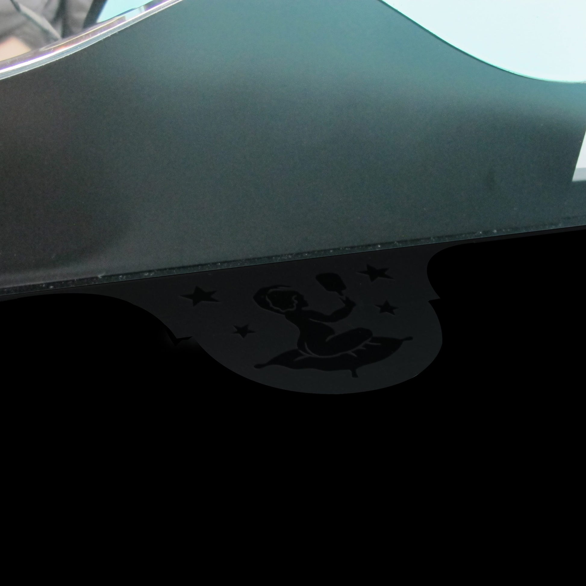 1940s dressing table/coiffeuse with a black etched glass top, its original triptych mirror and brass handles.