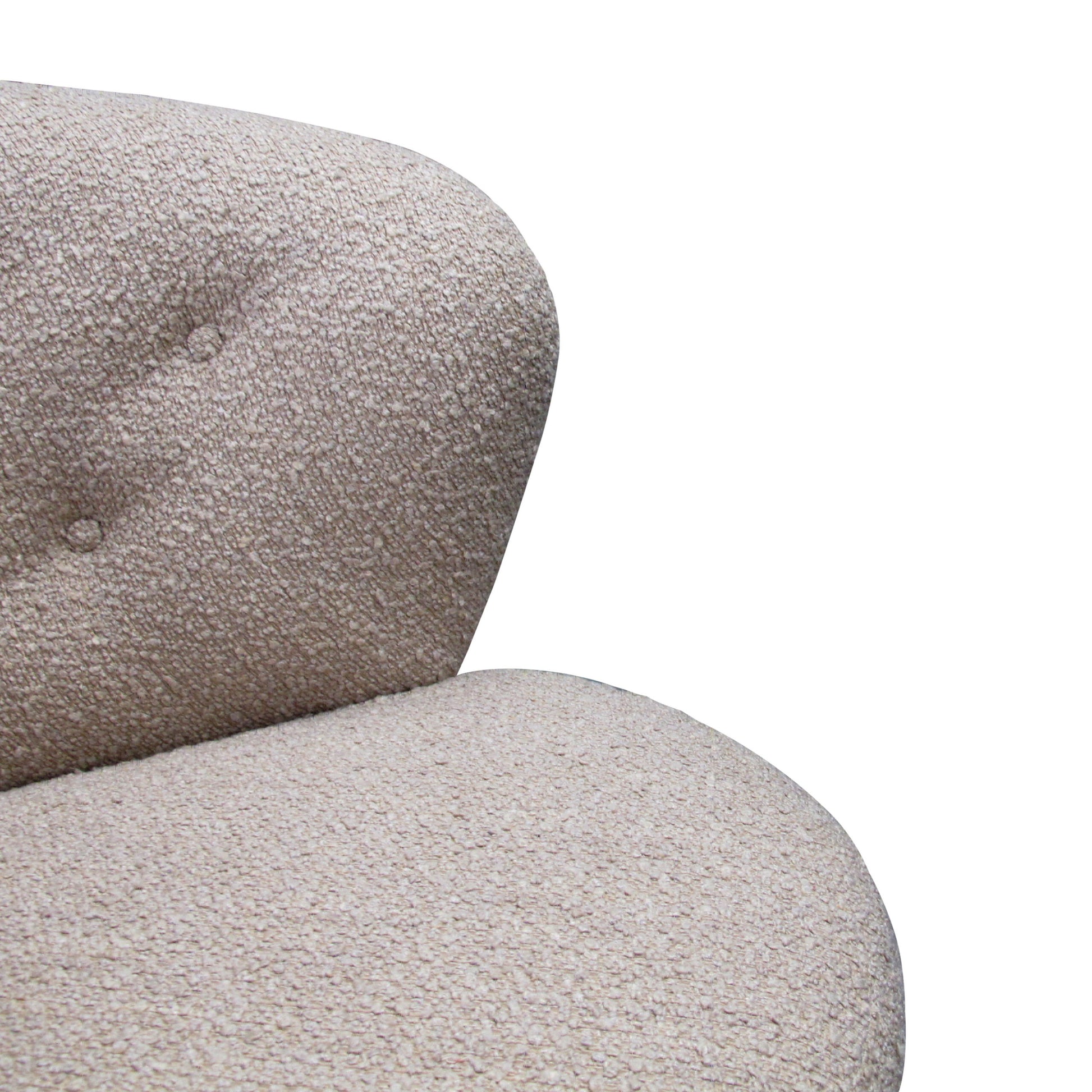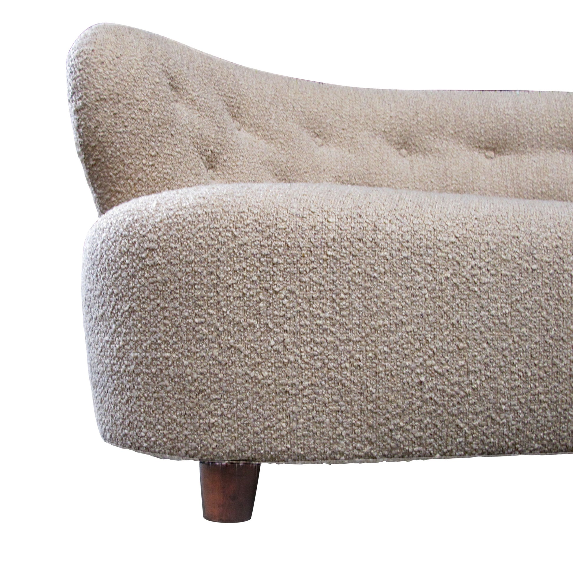 This comfortable large sofa is a classic Danish modern design from the 1940s. It has a simple, elegant design with clean lines and a curved back. The oak frame is sturdy and well-made, and the new short-pile boucle fabric upholstery is soft and inviting.