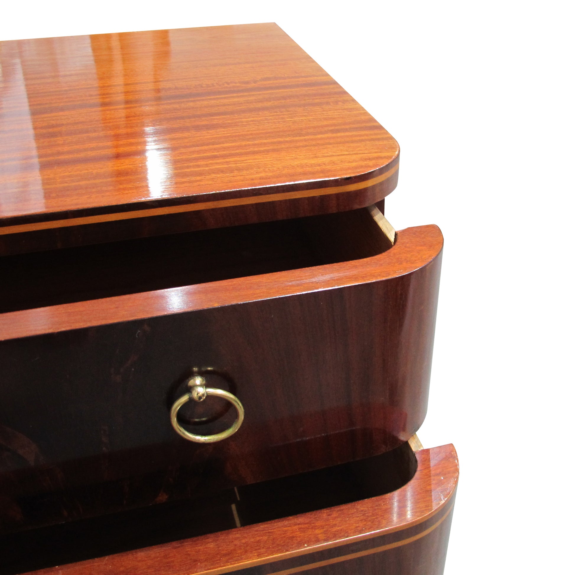 This elegant 1940s Swedish chest of drawers showcases a timeless design of mid-century Scandinavian furniture by Axel Larsson. Featuring a rich flamed mahogany wood veneer with a satin finish, the piece is accented by delicate inlaid details highlighting its streamlined form. The chest has gracefully curved edges, giving it a soft and sophisticated appearance, while the three spacious drawers provide ample storage. The chest of drawers has been recently re-polished and is in great condition.