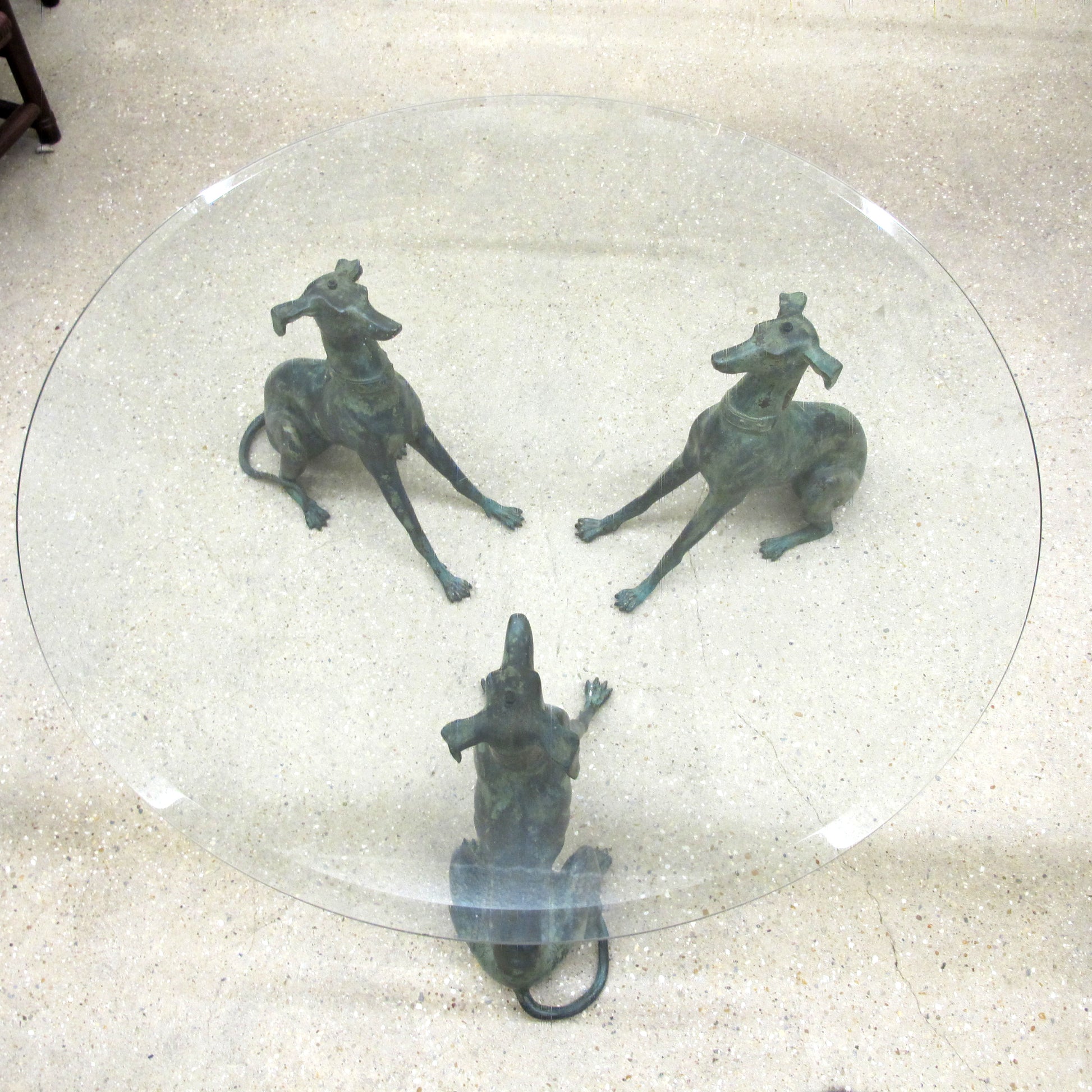1950s Belgian coffee table is a remarkable fusion of elegance and artistry. It features a round bevelled glass top supported by three finely sculpted bronze whippets with lifelike detail with a sense of grace and a touch of vintage charm,