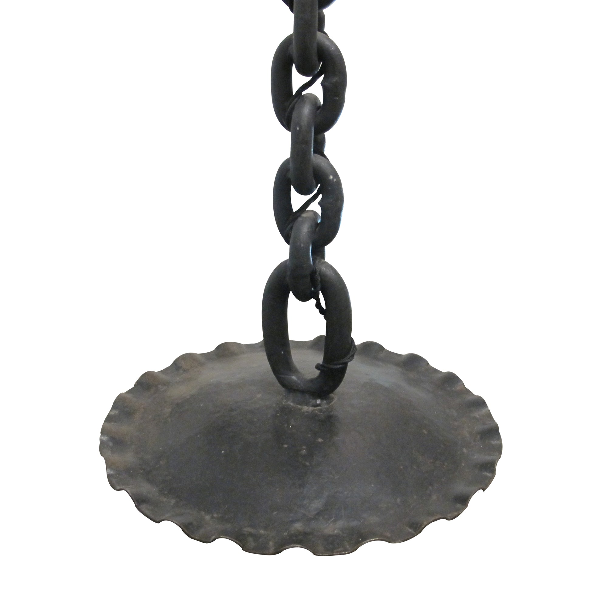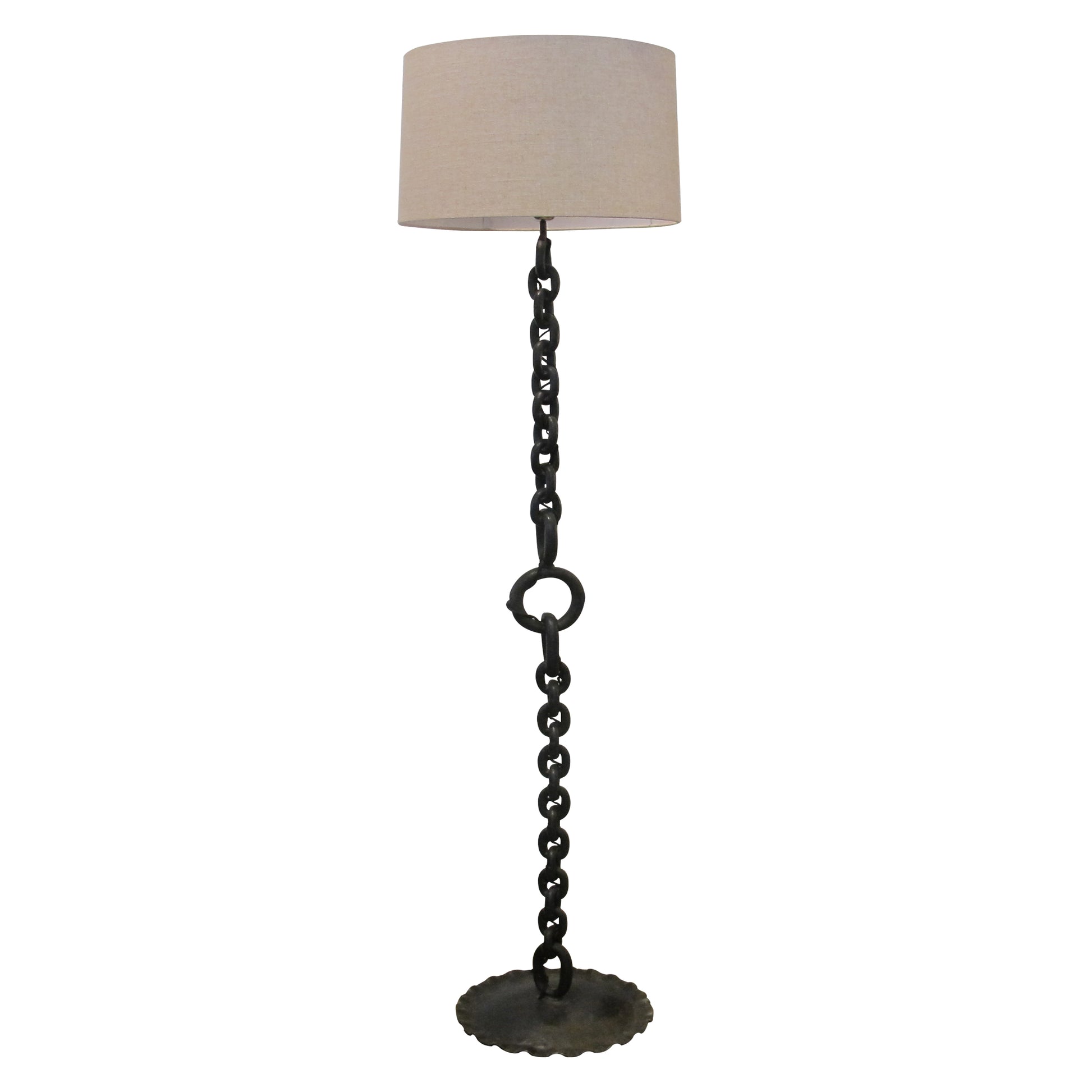 This is a Belgian naval chain link floor lamp from the 1950s. Made from heavy iron, the base and stem are constructed using authentic maritime chain links, giving it a strong industrial character. A circular iron ring connects the upper and lower sections of the chain, adding a distinct visual element. The lamp is topped with a simple linen shade that casts a warm, even light. The base is scalloped iron, providing stability and a subtle decorative touch. This piece combines utilitarian materials with clean design, making it suitable for industrial, vintage, or nautical-inspired interiors.