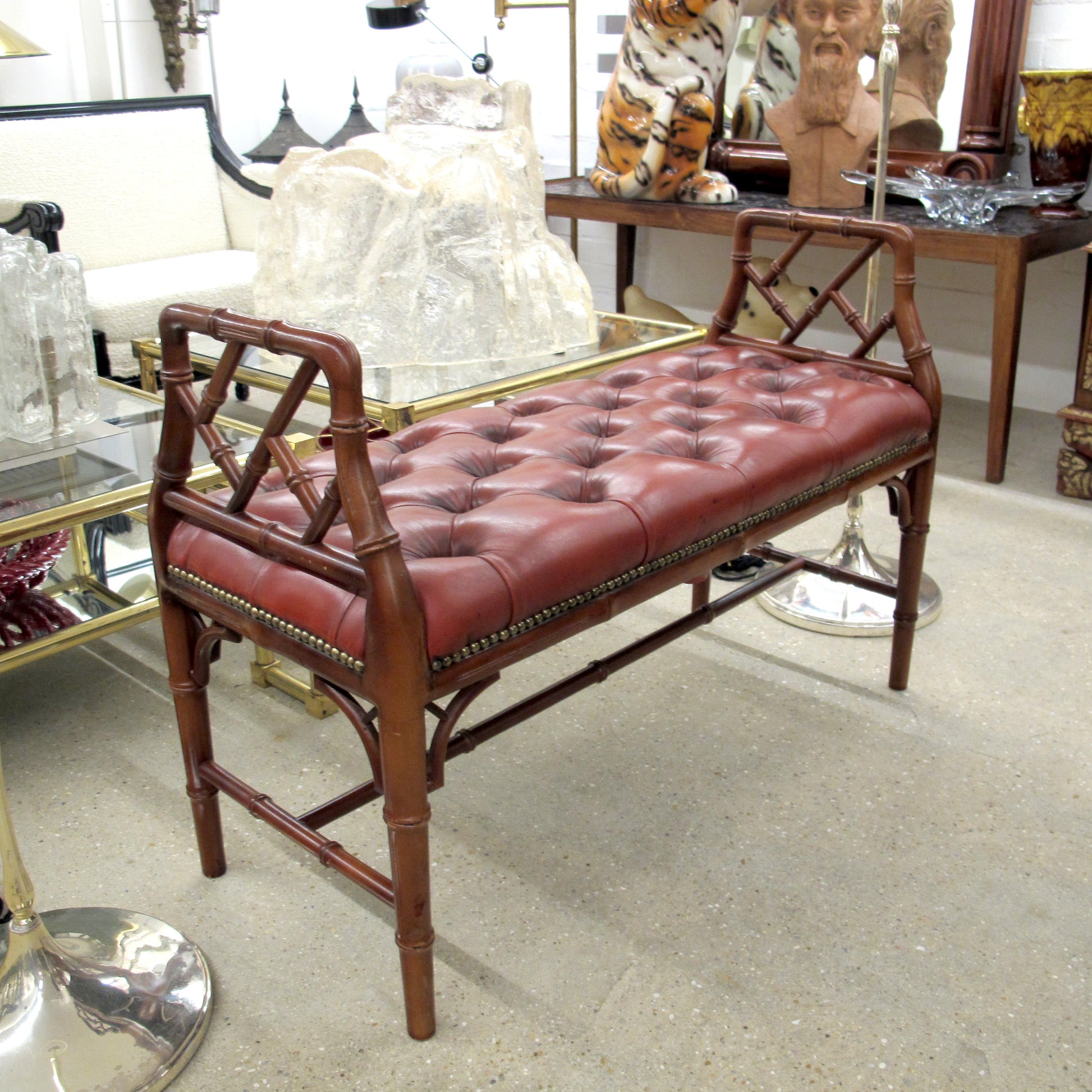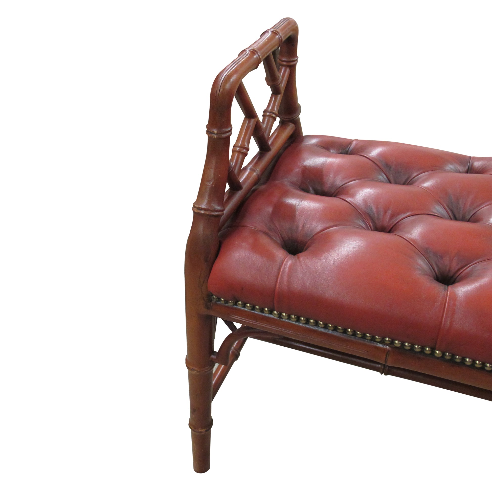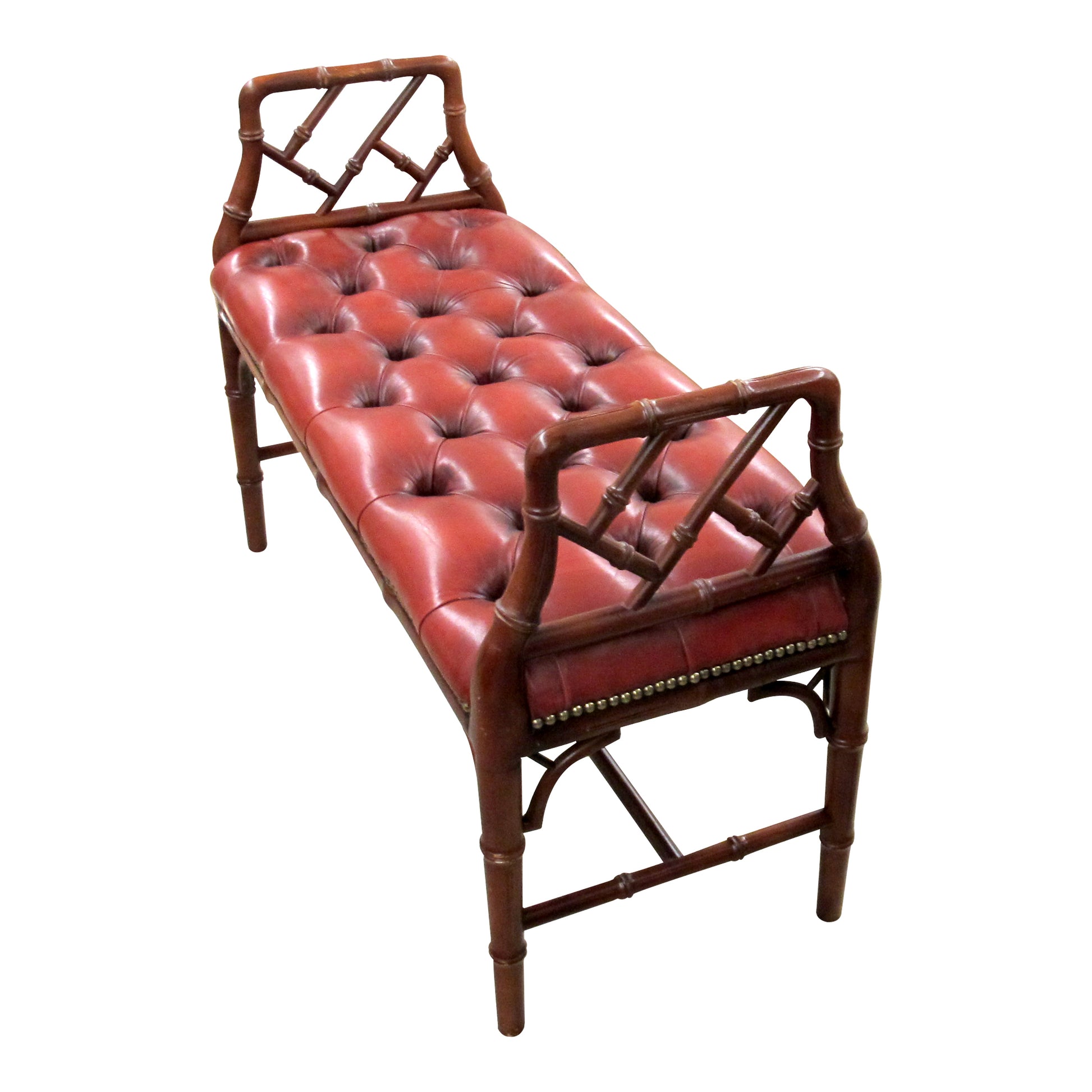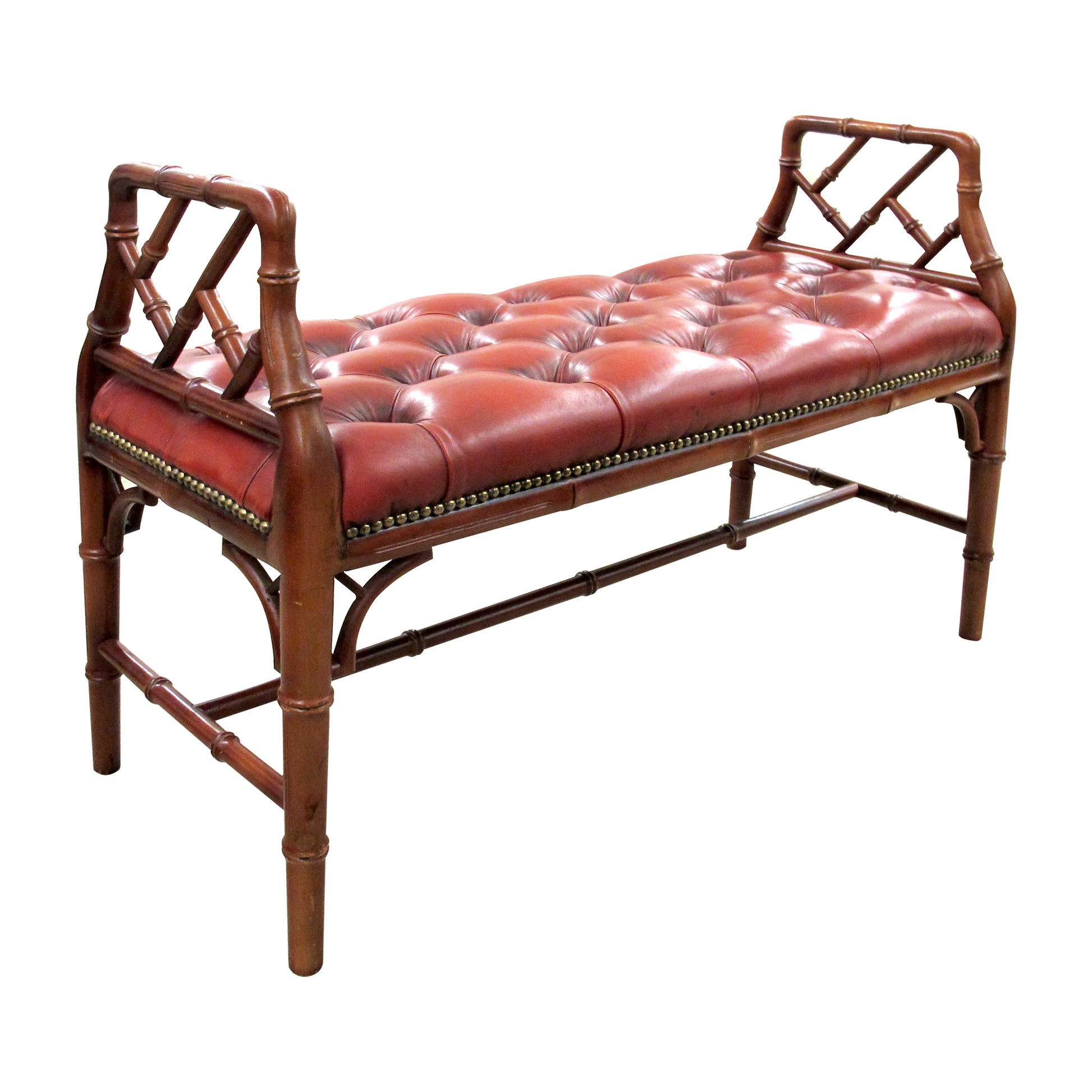 An English mid-century bench, circa 1950, with faux-bamboo hardwood frame and stretcher supports. Upholstered in button-tufted oxblood red leather with brass nail head trim. Raised open arms with lattice detail. Solid and decorative, suitable for halls, bedrooms, or living areas.