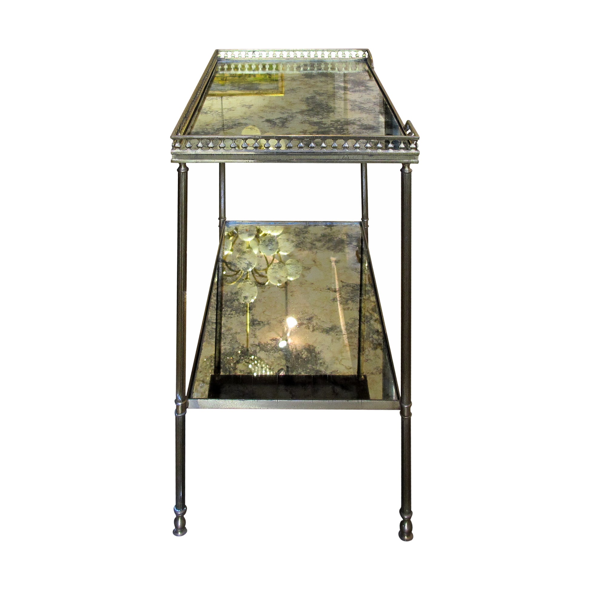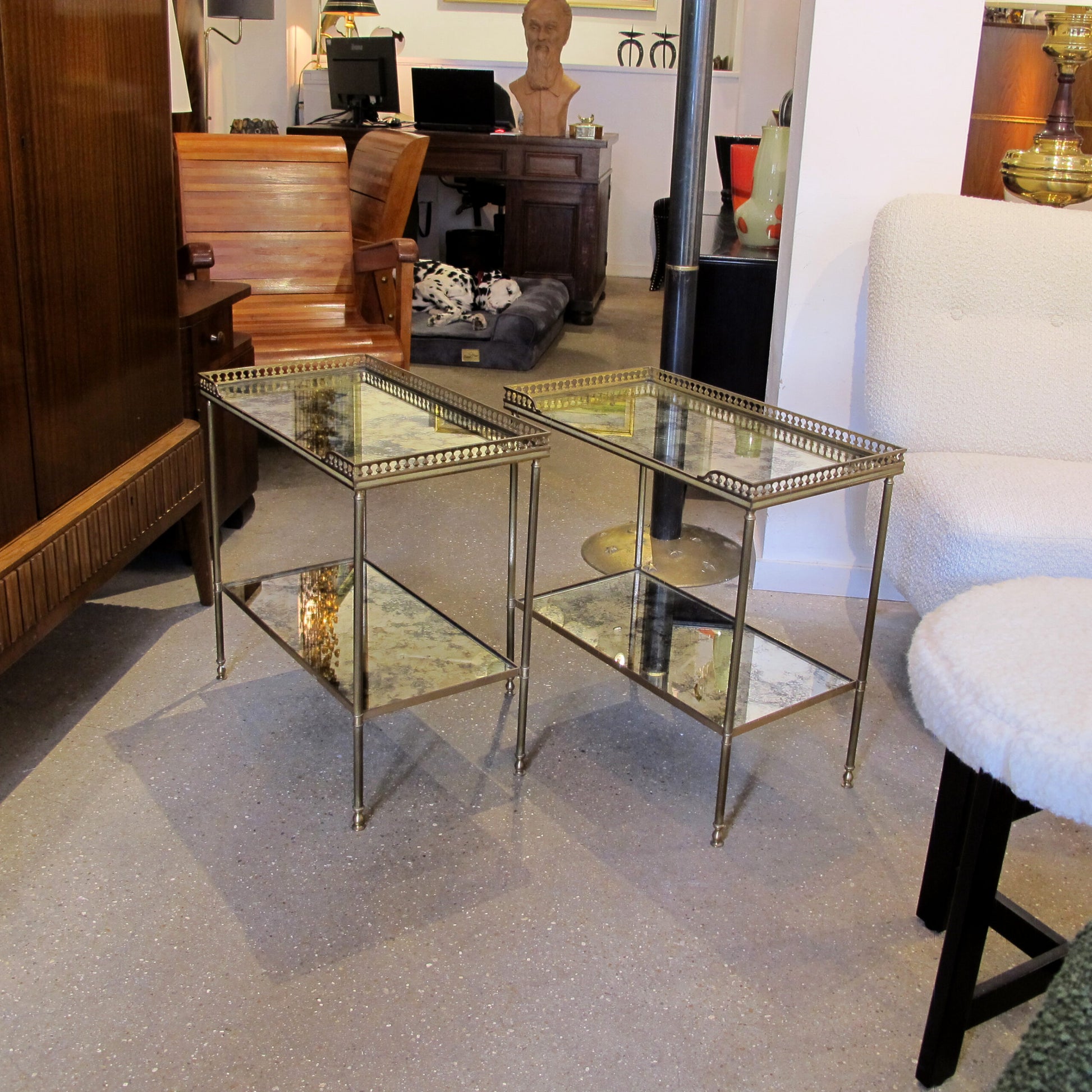 An elegant pair of French two-tier brass side tables by Maison Bagues and dating from the 1950s. Each table features a rectangular top and a lower shelf with antiqued mirrors, enhancing the tables’ vintage charm. The gallery trim is in perfect condition.
