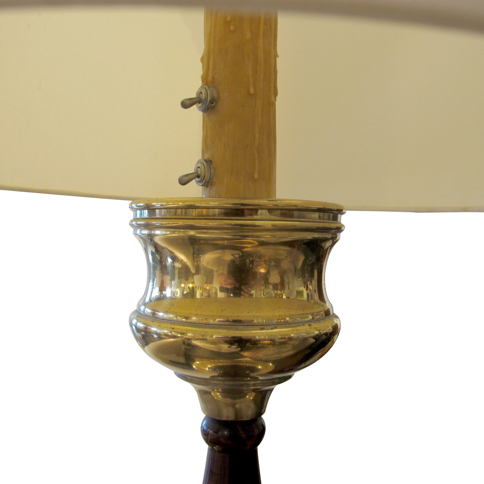 Elegant pair of very large English table lamps made of brass and mahogany. Each lamp features striking brass columns with a beautiful patina commensurate with age and complemented by rich mahogany accents, adding depth and contrast to the design. The lamps are presented with their original cylinder lampshades. The lights are on a two-way switch, allowing you to use the lamps with one light bulb or two light bulbs to suit your atmosphere.