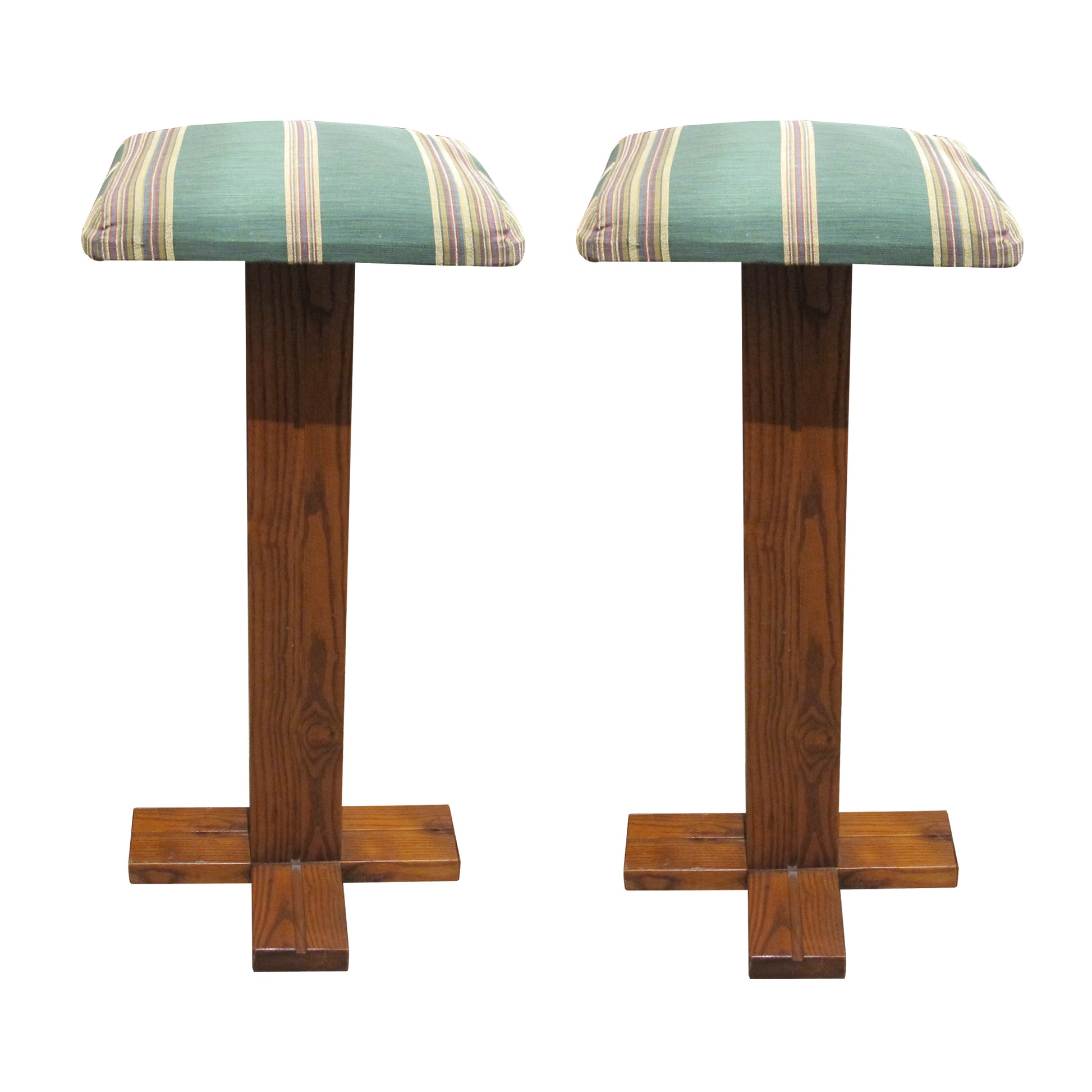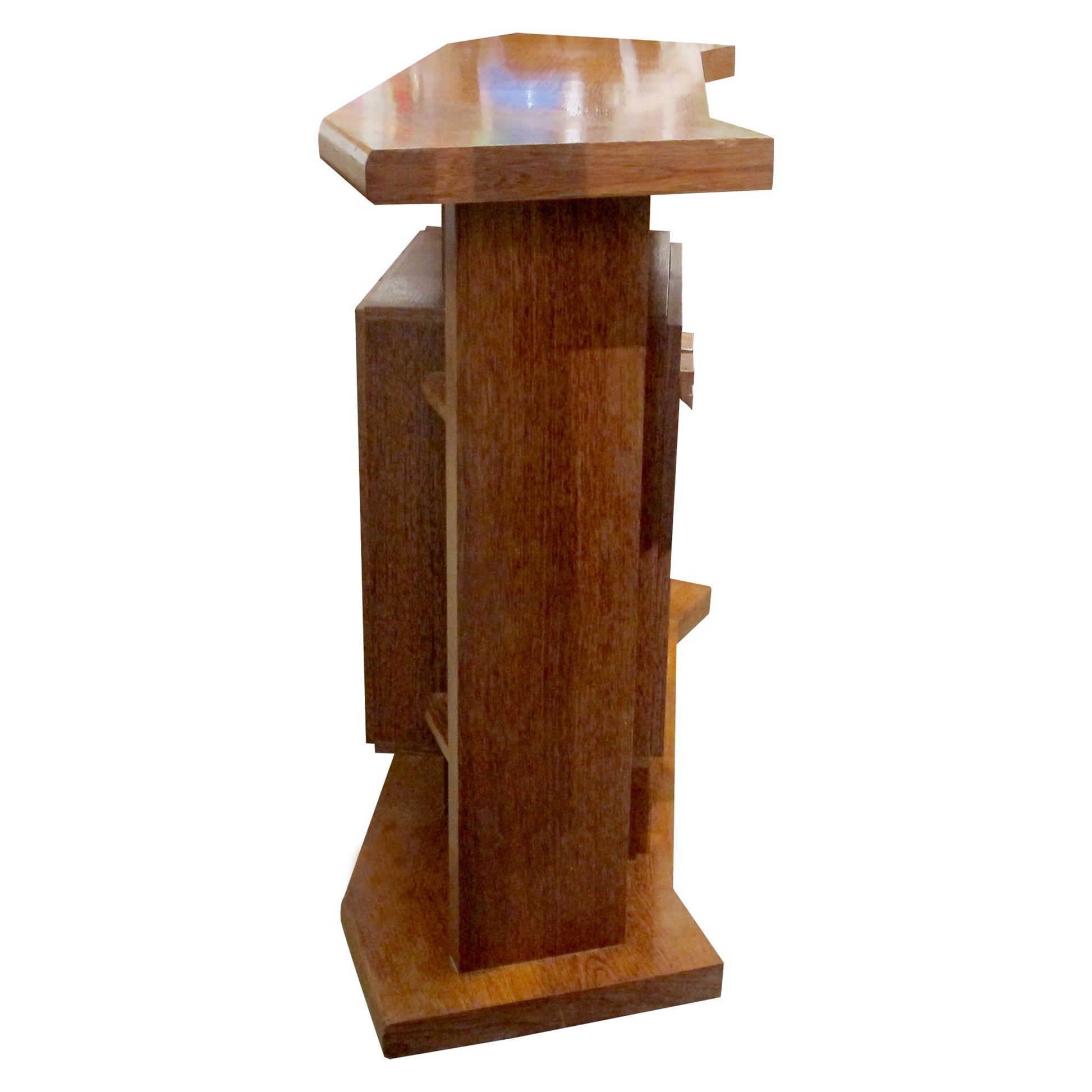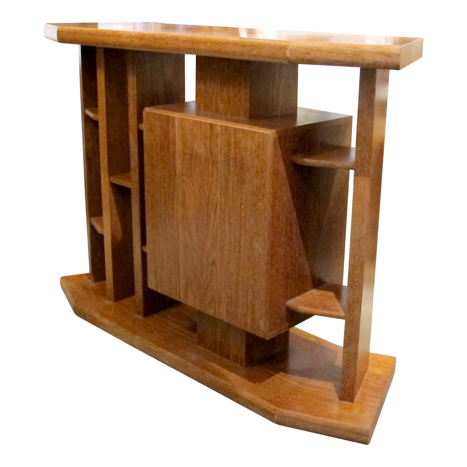 Made in solid oak with a warm, even tone, the piece has a clean, architectural design typical of mid-century European furniture. A rectangular top sits above an open framework with vertical supports and fixed shelving. The central cupboard has a pair of doors with stepped oak handles and provides enclosed storage, while the surrounding shelves offer space for bottles, glassware, or display. The shaped plinth base gives the piece stability and a strong, defined outline. The overall design is practical and well-proportioned, suitable for use as a drinks bar, storage unit, or room divider. The bar is accompanied by a pair of matching oak stools, designed to complement the unit's form and scale.