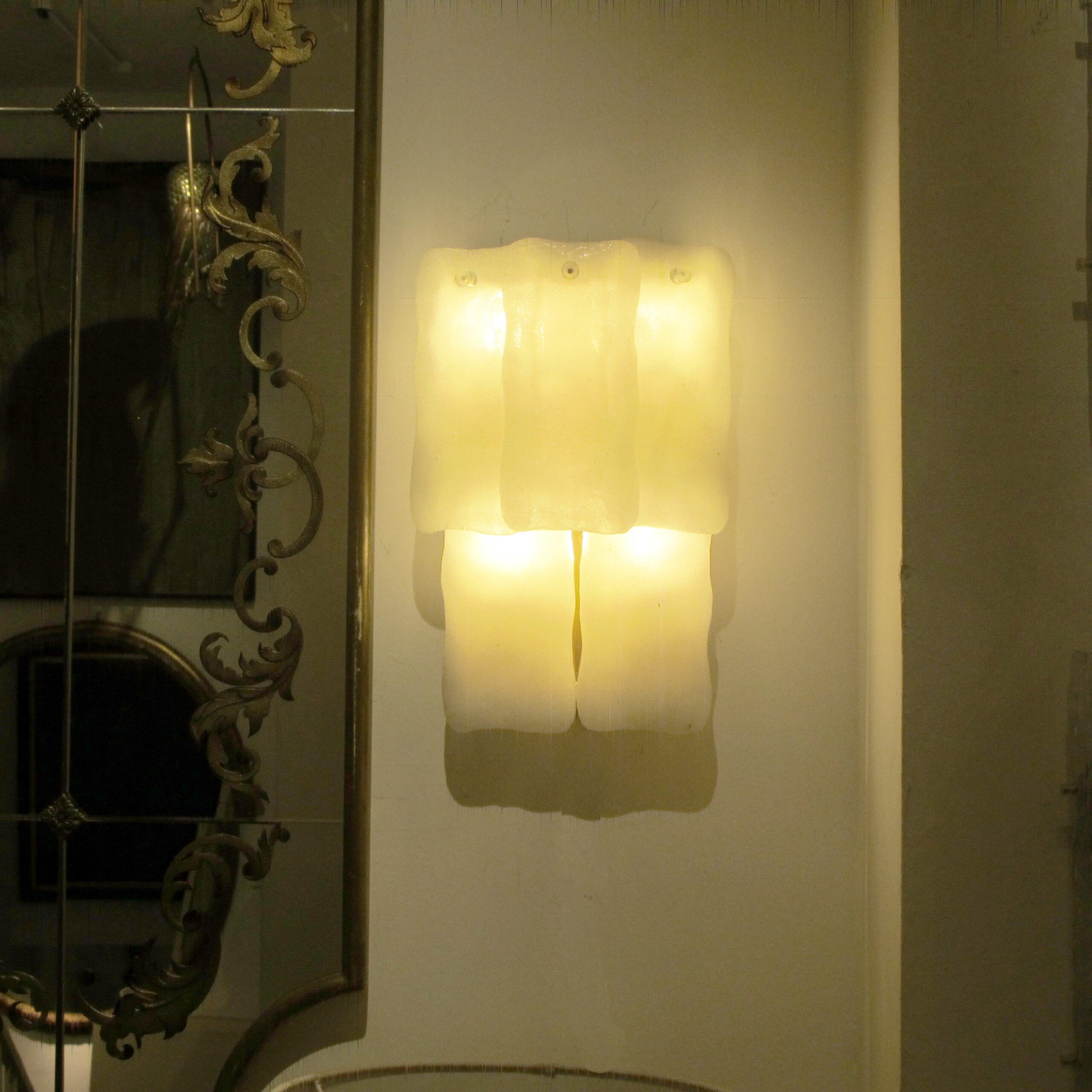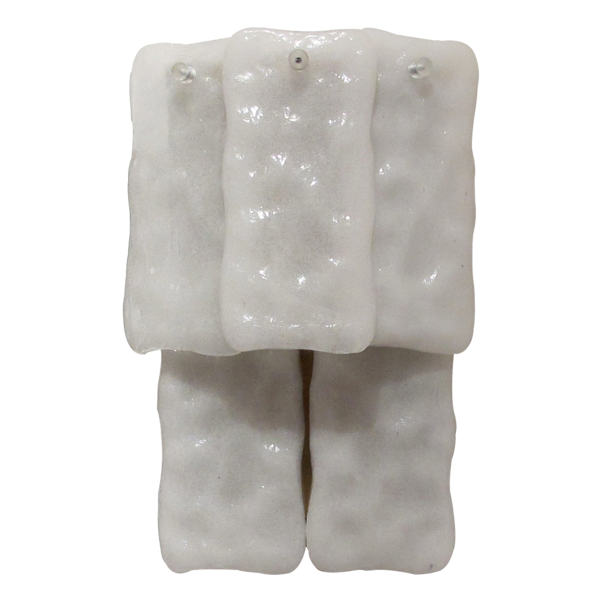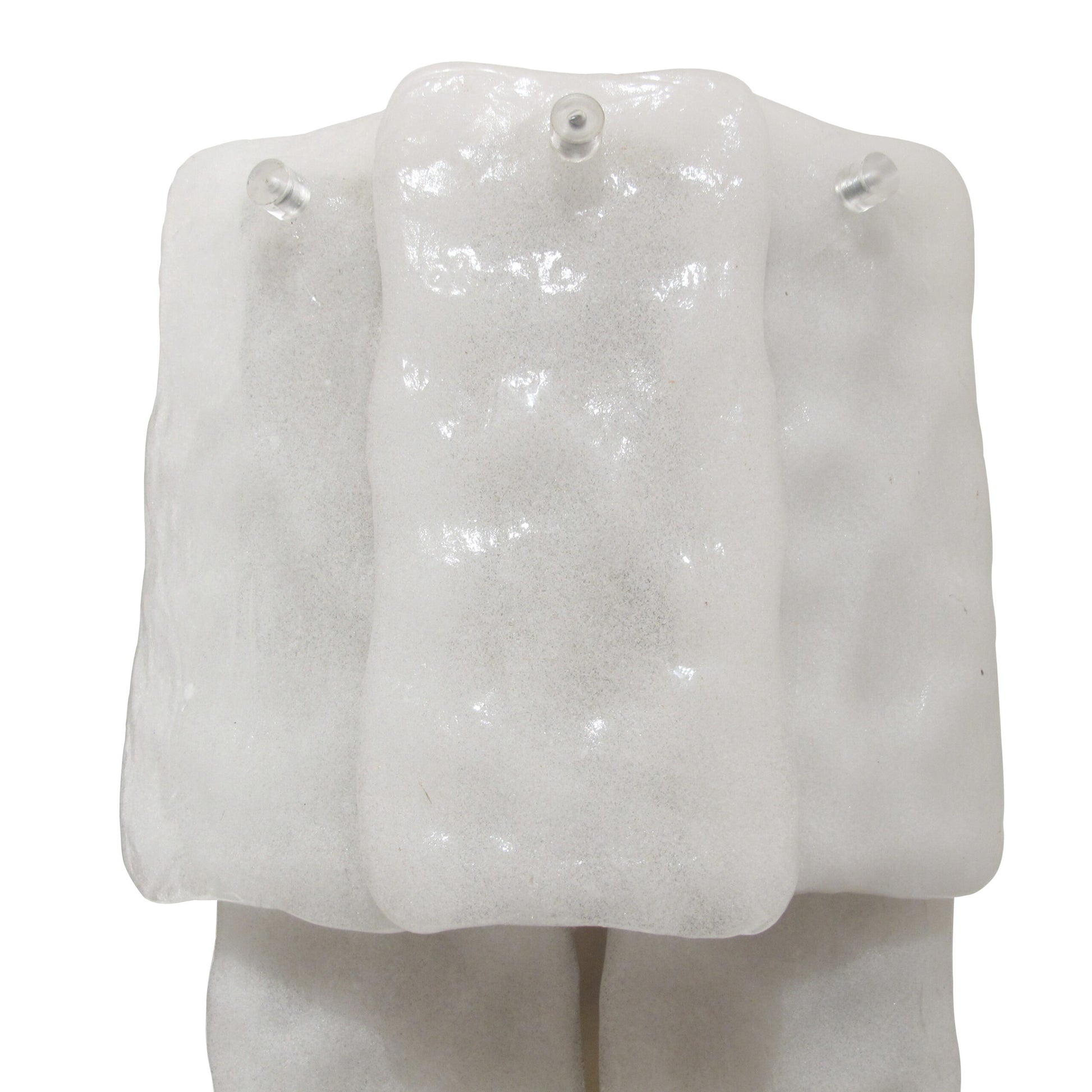 This pair of two-tier wall lights was crafted by J.T. Kalmar, an Austrian designer, during the 1960s. The lights feature Murano frosted, ice-textured glass panes arranged in a geometric pattern, creating a layered, sculptural effect. The textured glass captures and diffuses light beautifully, giving a soft, ambient glow. Their original lucite bolts hold the glass panes together on the frame.