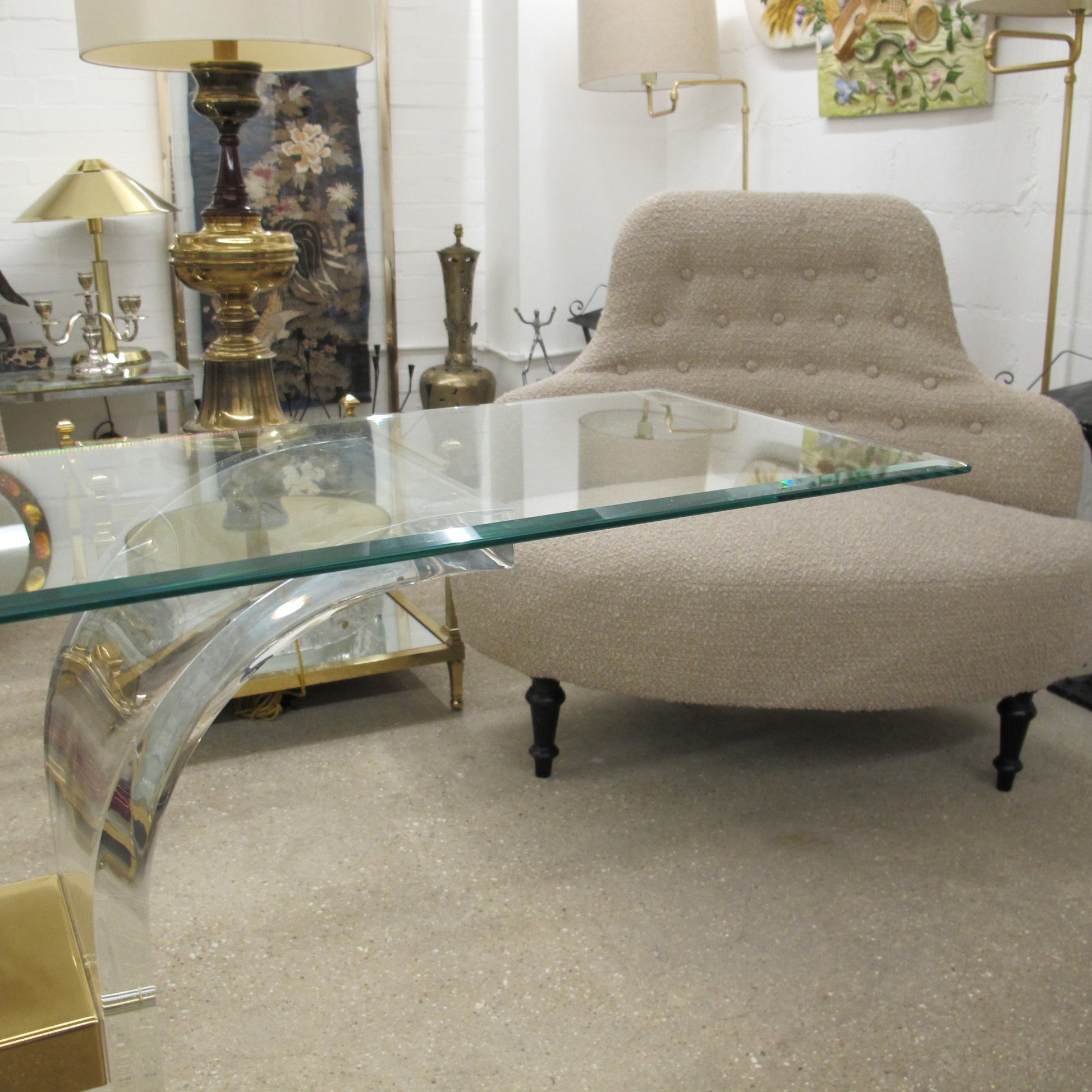 This elegant Belgian 1970s Perspex/Lucite console table boasts a sculptural design featuring a thick, original rectangular bevelled glass top. The piece is supported by a curved arched Lucite base with elegant brass detailing. The combination of transparent Perspex and warm brass accents creates a sophisticated contrast, giving the table an airy yet luxurious presence.