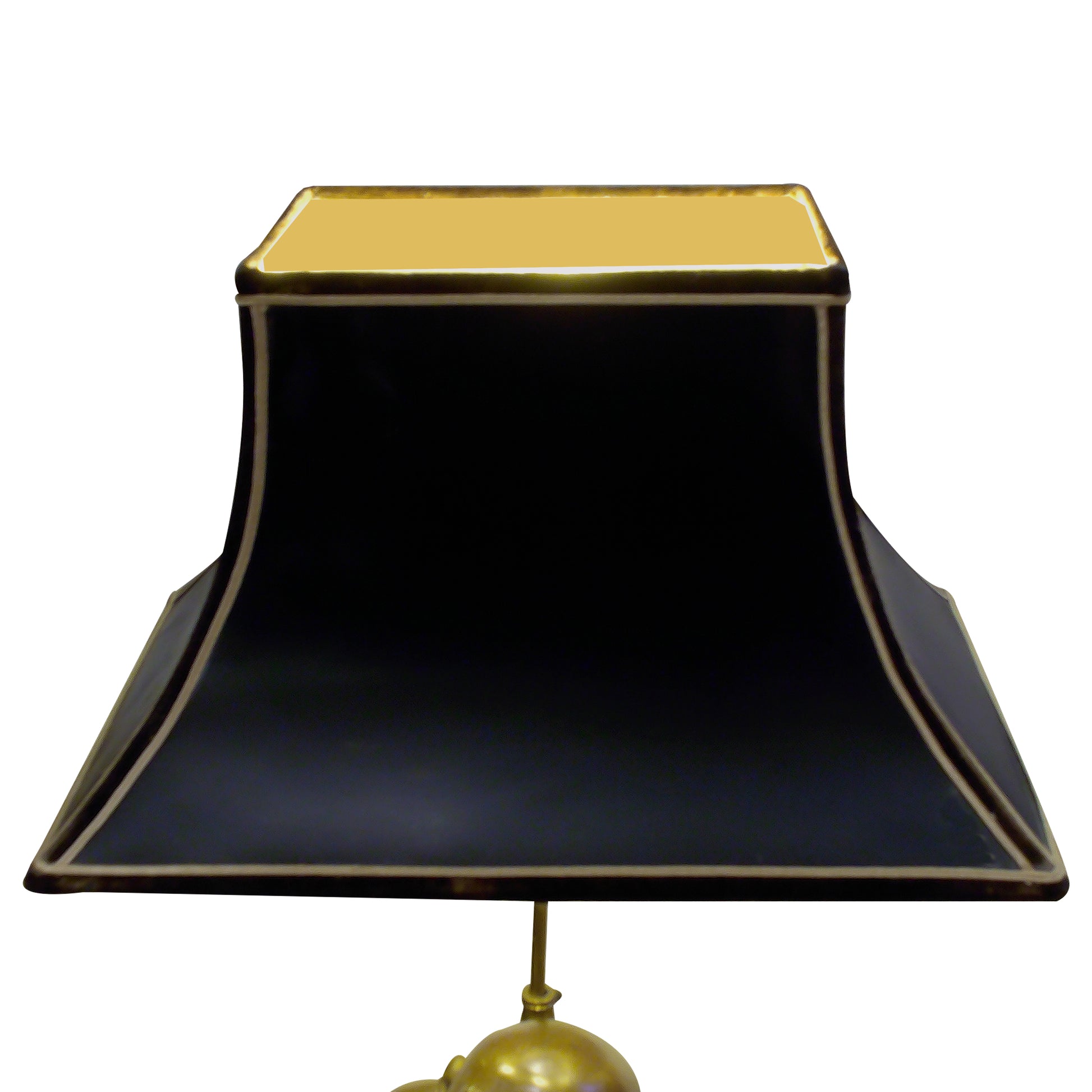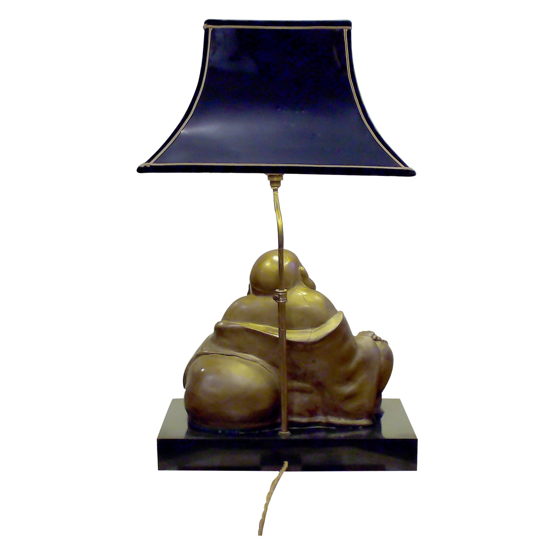 A striking French mid-century table lamp featuring a finely cast bronze Buddha figure resting in a relaxed, joyful pose atop a black marble plinth. The original pagoda-style lampshade, finished in black with a luxurious gold lining, creates a warm and elegant glow when illuminated. The shade is adjustable, allowing for customized lighting angles.