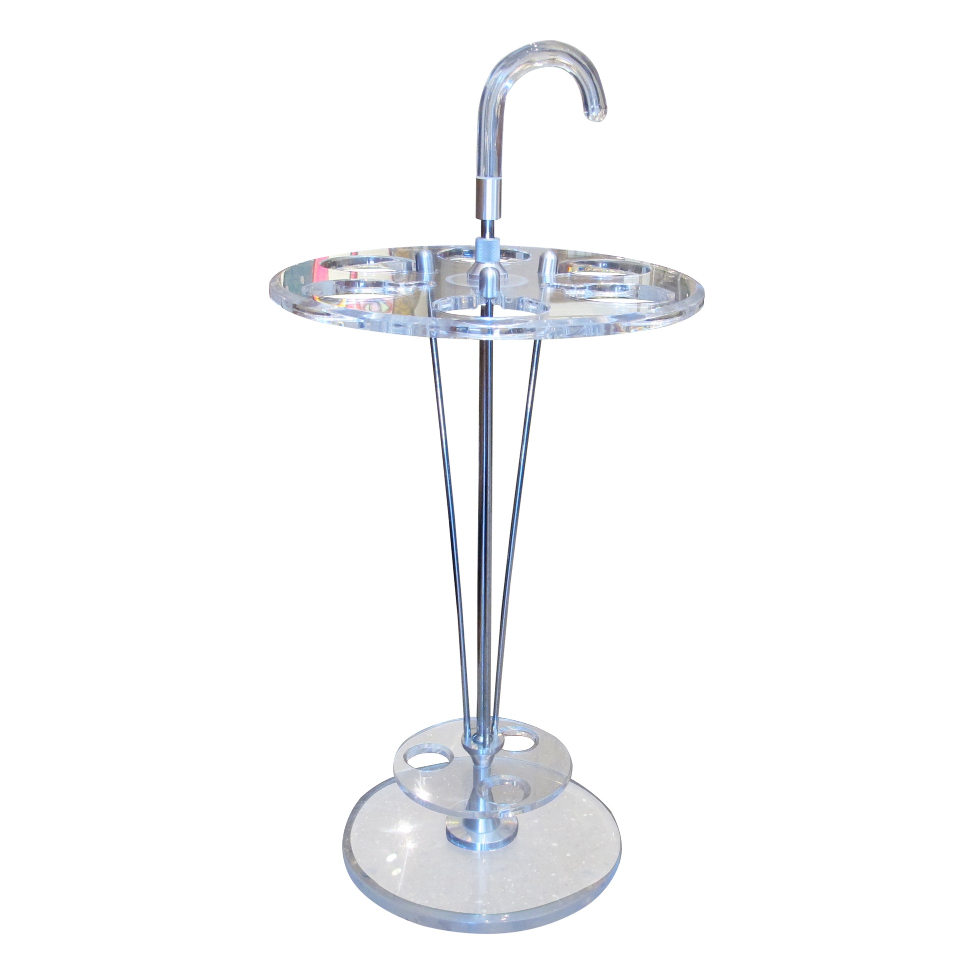 Stylish French umbrella stand from the 1970s, made in clear Perspex/lucite with chrome details. The design features four umbrella holders arranged around a central chrome stem with a curved handle, combining practicality with a sleek modern look.