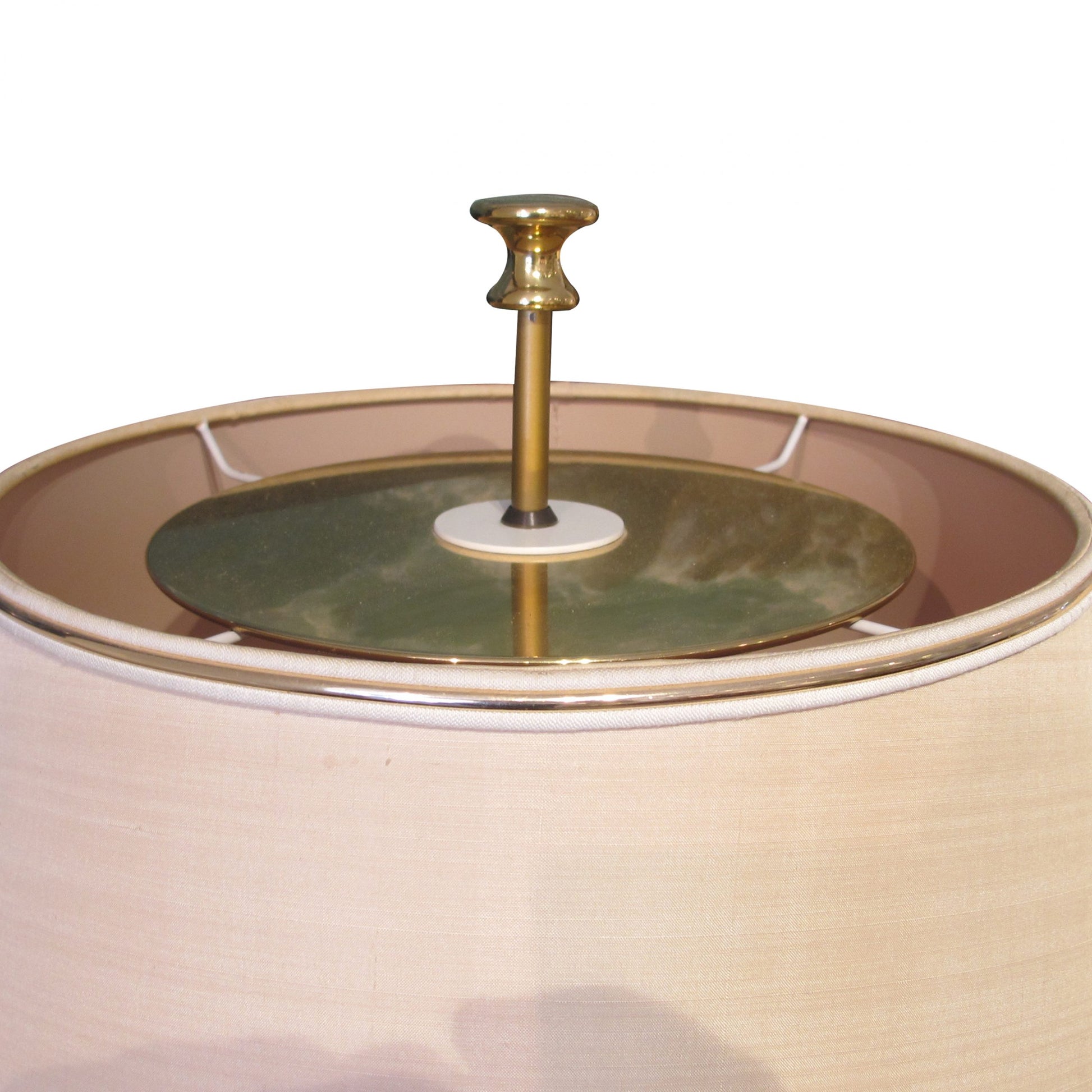 A large Italian pair of Lucite and brass table lamps with their original shades are in great condition. This is a timeless elegant design; the lamps are presented on a brass base with a thick acrylic square and a tubular stem. Once the lamps are lit, The cream shades change to a soft pink tone.