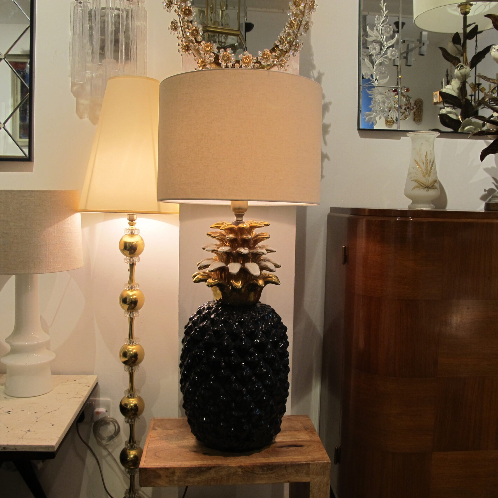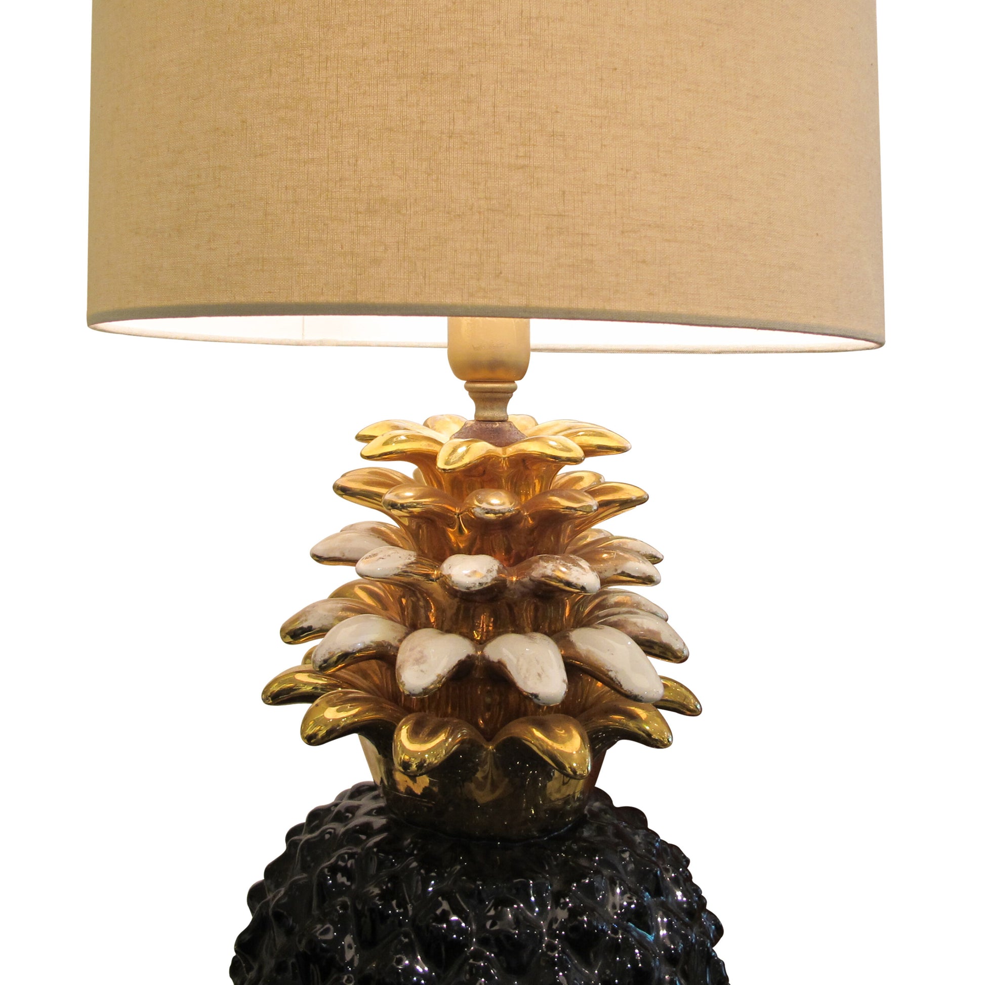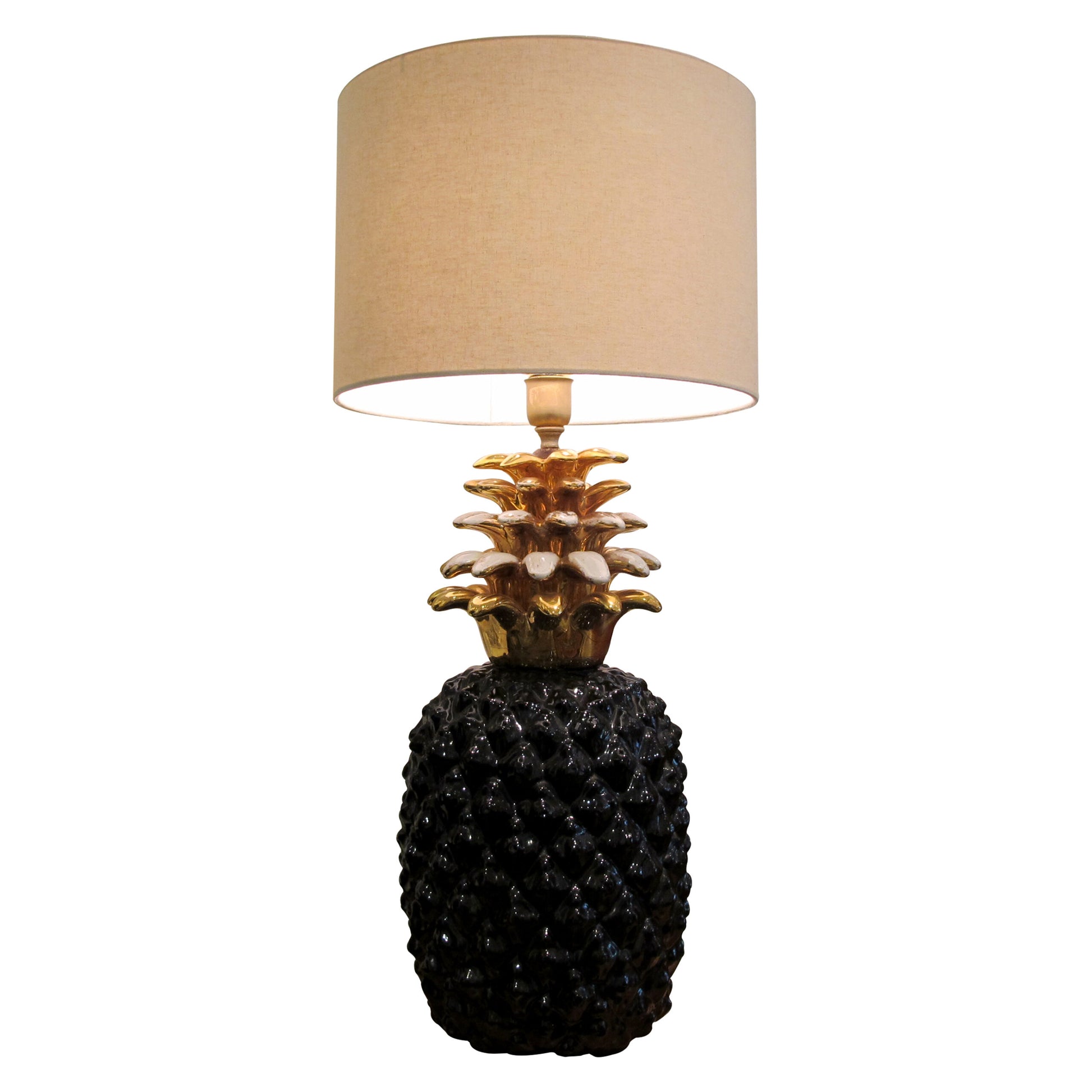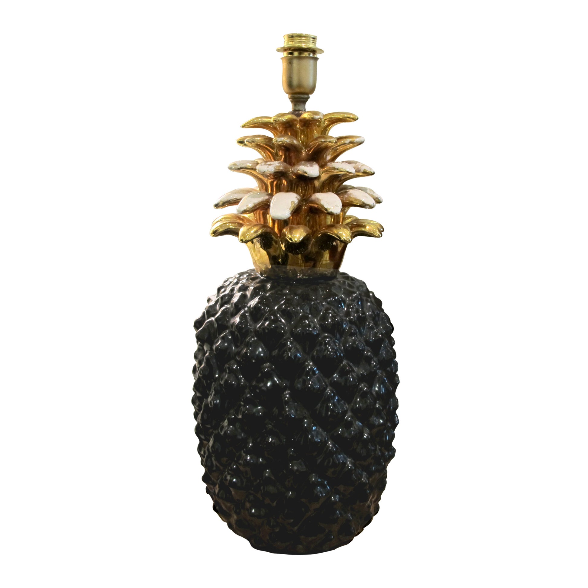 Highly decorative very large French black and gold ceramic pineapple table manufactured by Maison Lancel in the 1970s. The gold pineapple leaves have acquired a beautiful patina commensurate with age. The lamp is newly rewired to the UK standard.