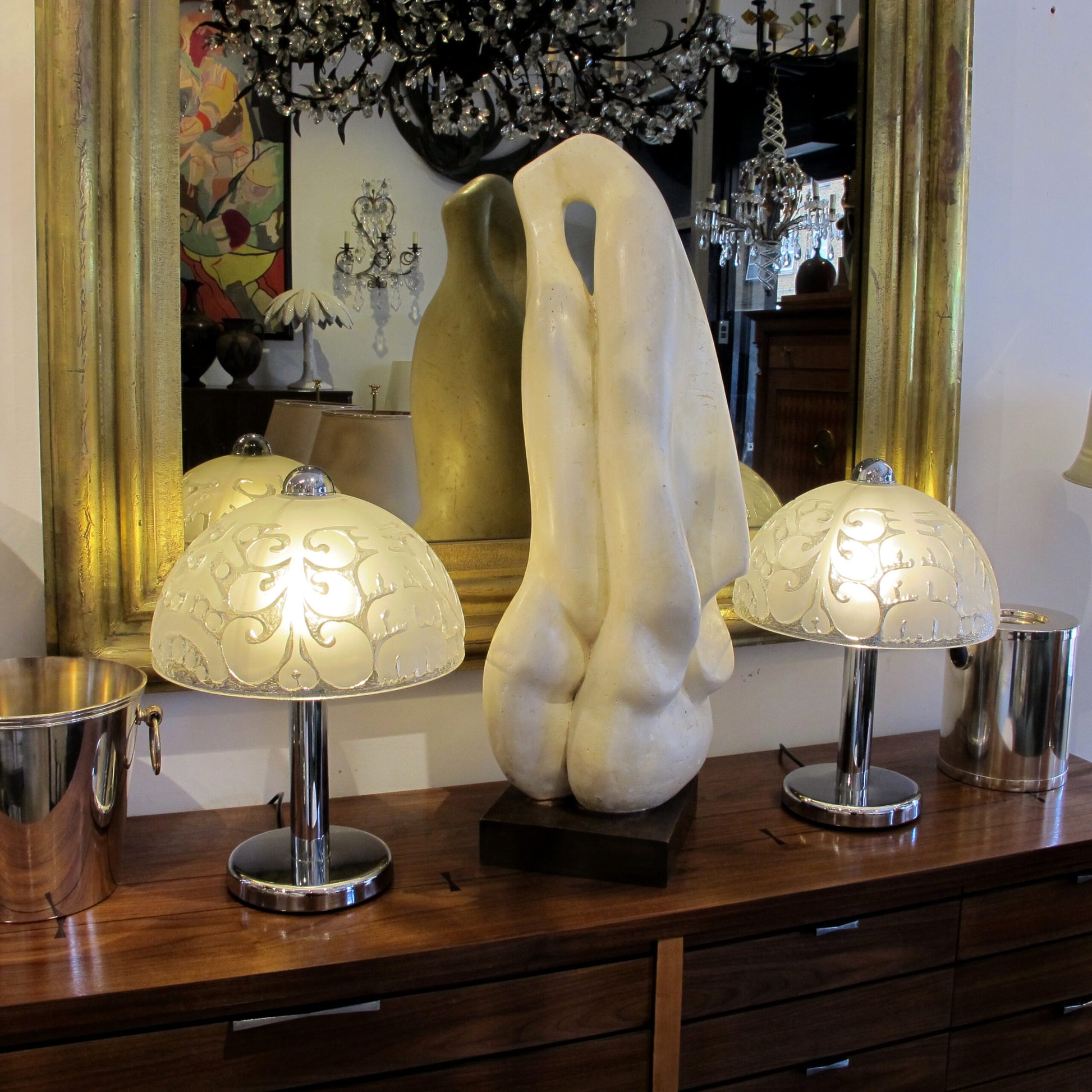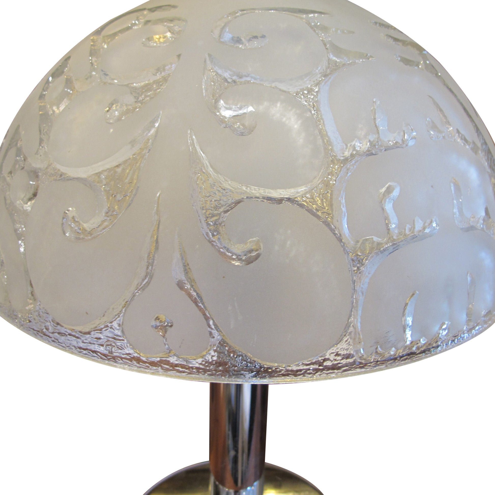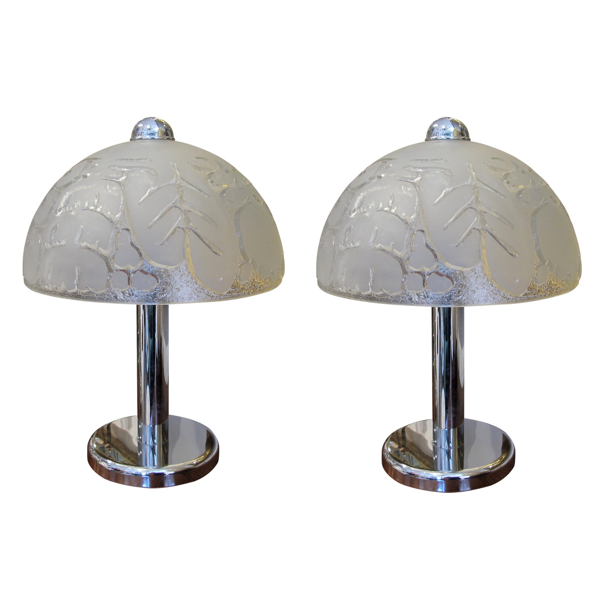 Elegant pair of 1970s chrome table lamps with glass dome shades. Each lamp features a sleek and polished chrome base that supports a large, dome-shaped shade made of frosted glass. The shades are textured with a leaf design, adding a subtle organic element to the modern silhouette. These lamps are perfect for adding ambient lighting to a living room, bedroom, or office, while also serving as striking decorative pieces.