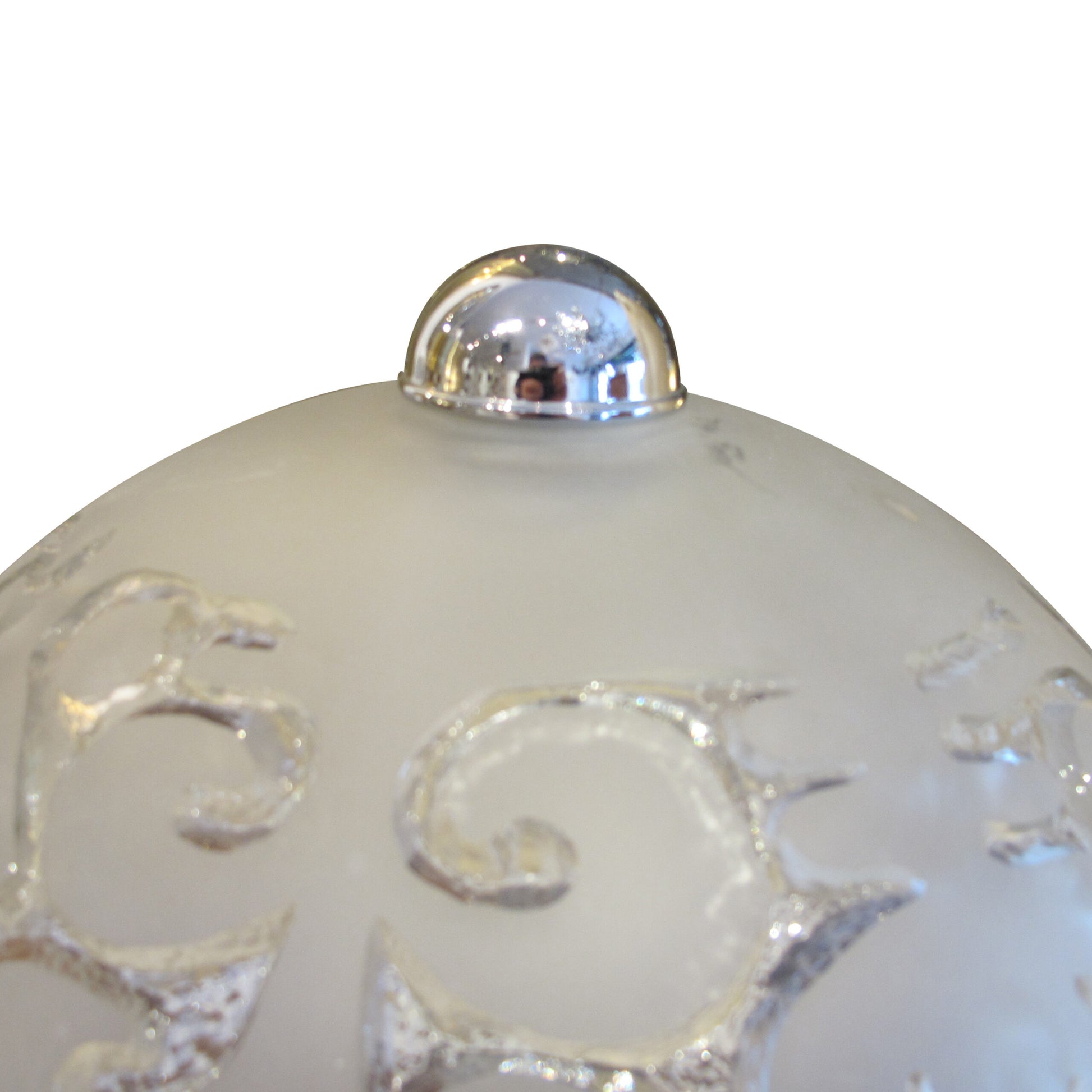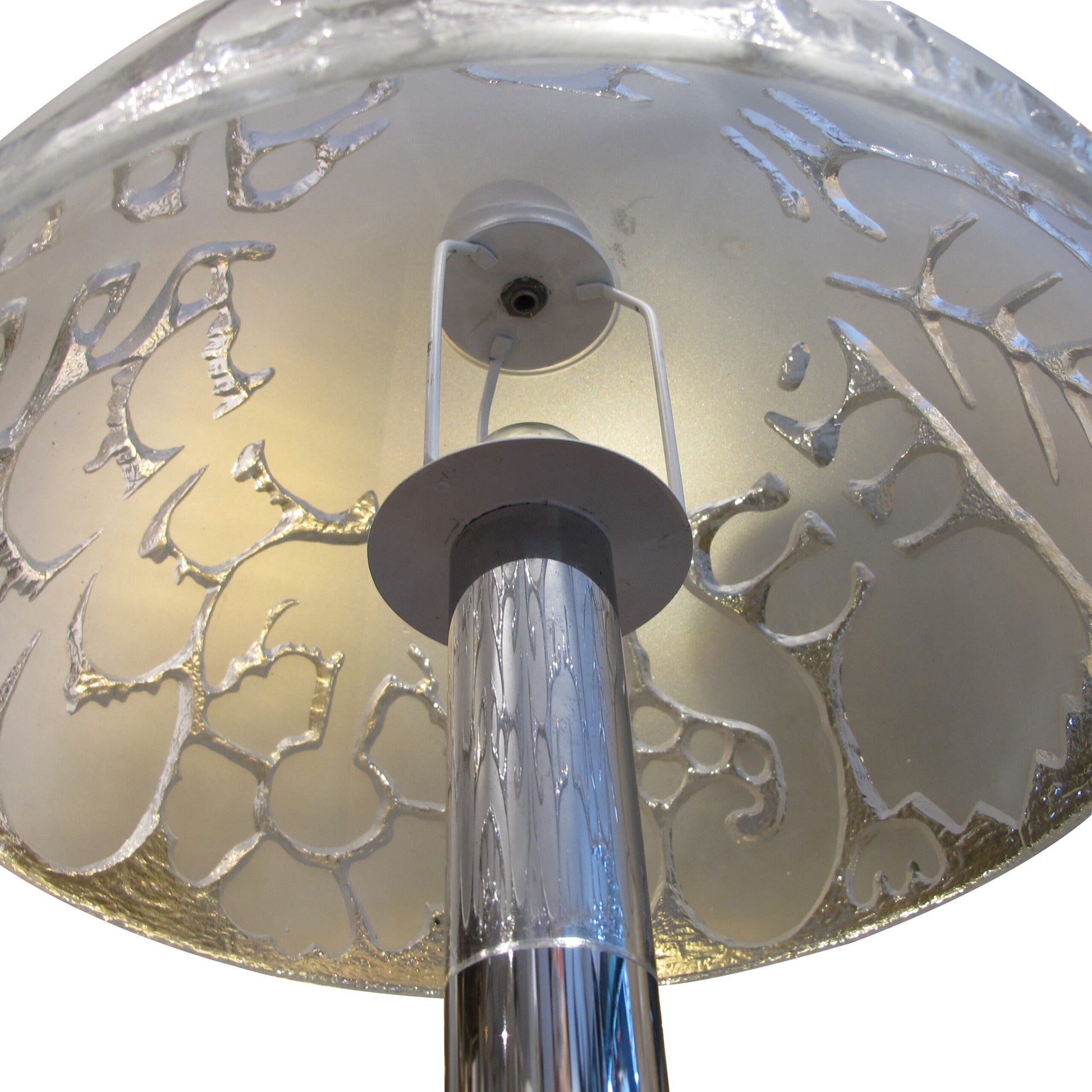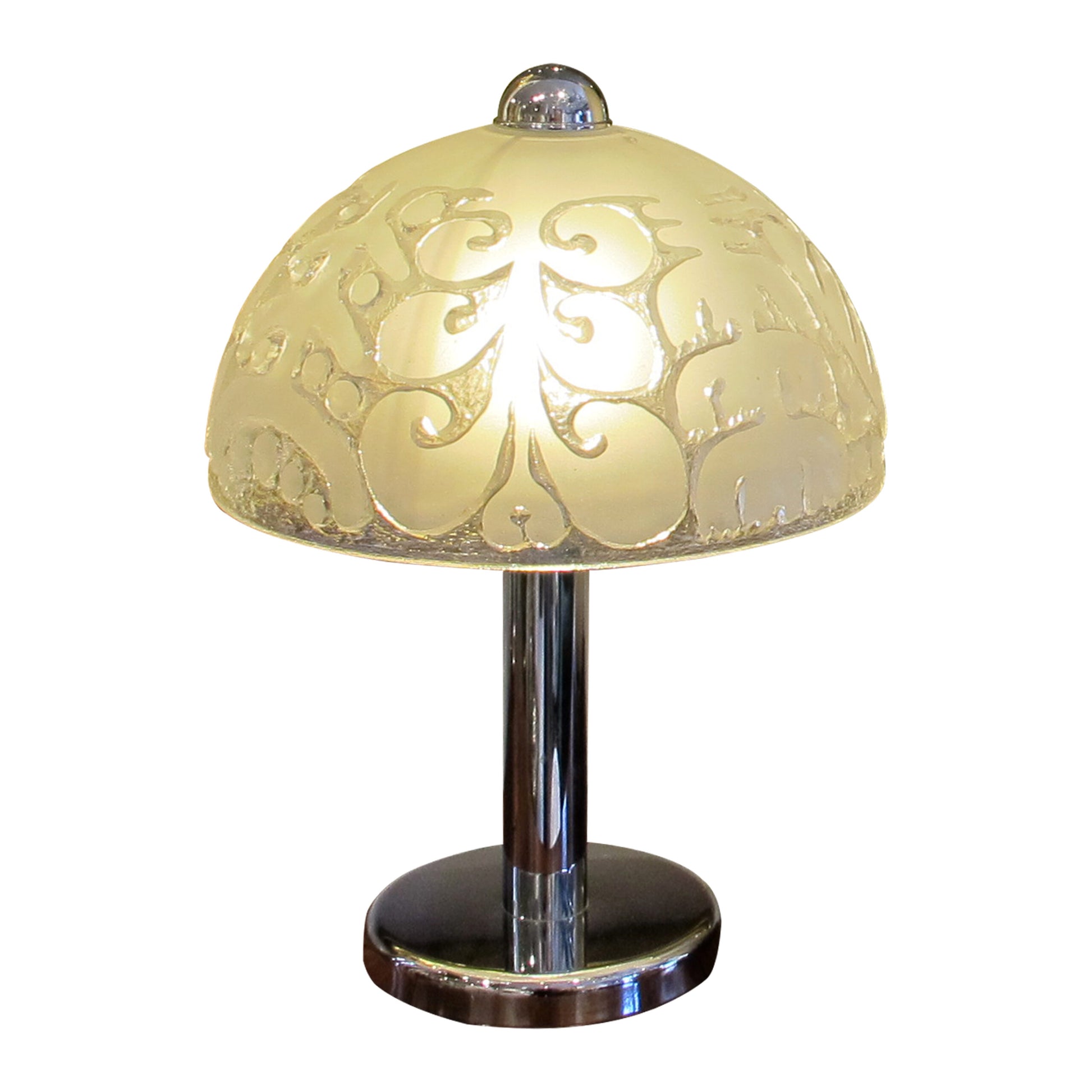 Elegant pair of 1970s chrome table lamps with glass dome shades. Each lamp features a sleek and polished chrome base that supports a large, dome-shaped shade made of frosted glass. The shades are textured with a leaf design, adding a subtle organic element to the modern silhouette. These lamps are perfect for adding ambient lighting to a living room, bedroom, or office, while also serving as striking decorative pieces.