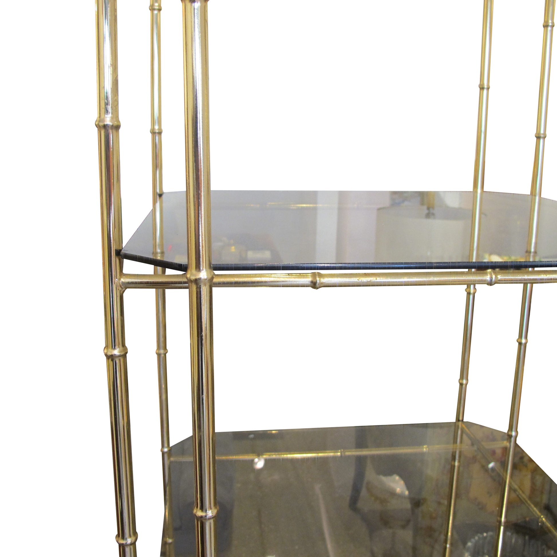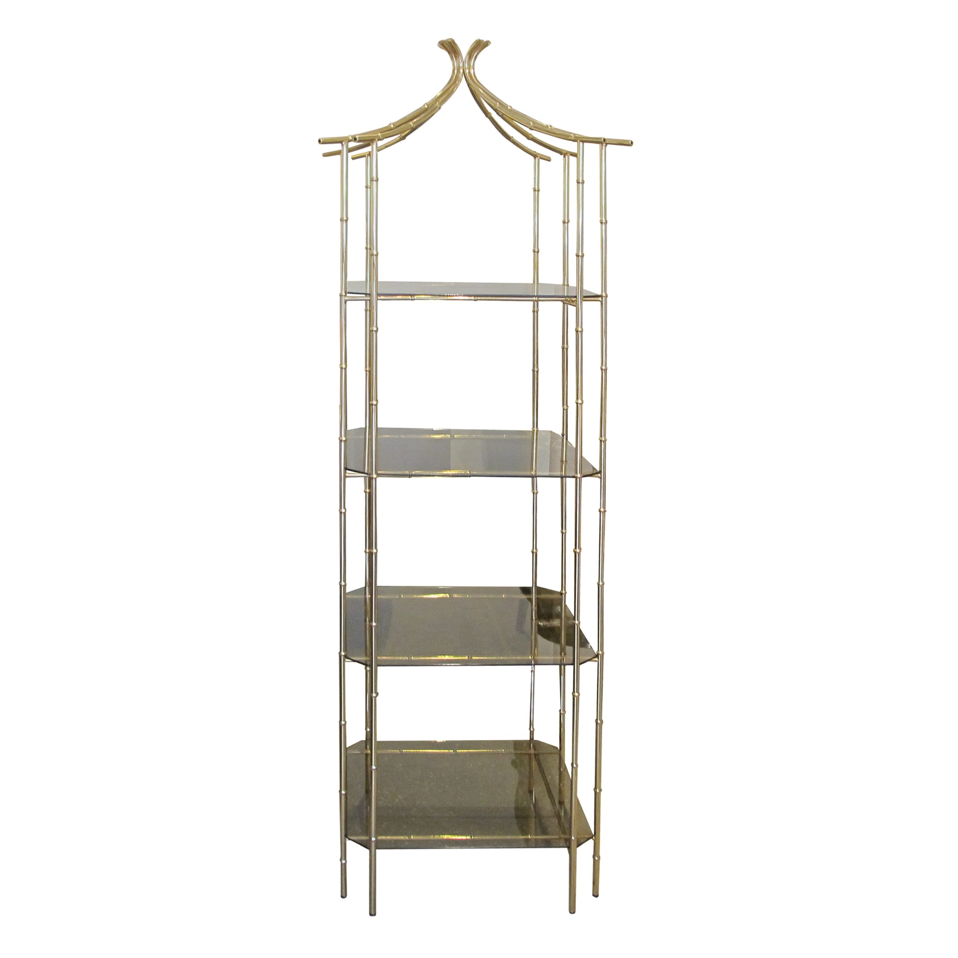 This elegant Belgian tall pagoda four-tier shelving unit features a sophisticated faux bamboo brass frame. Each of the four shelves is made from smoked glass, the unit’s open design and tiered structure make it perfect for displaying decorative items, books, or plants, offering style and functionality to any living space.
