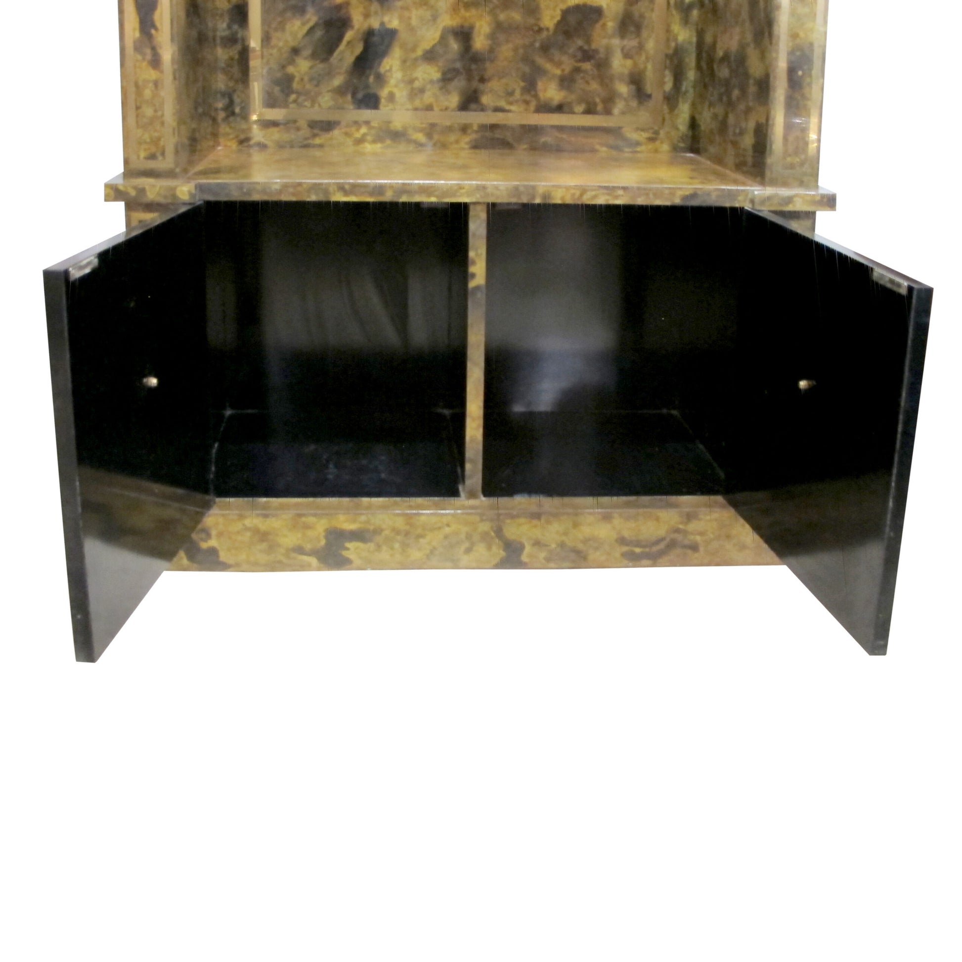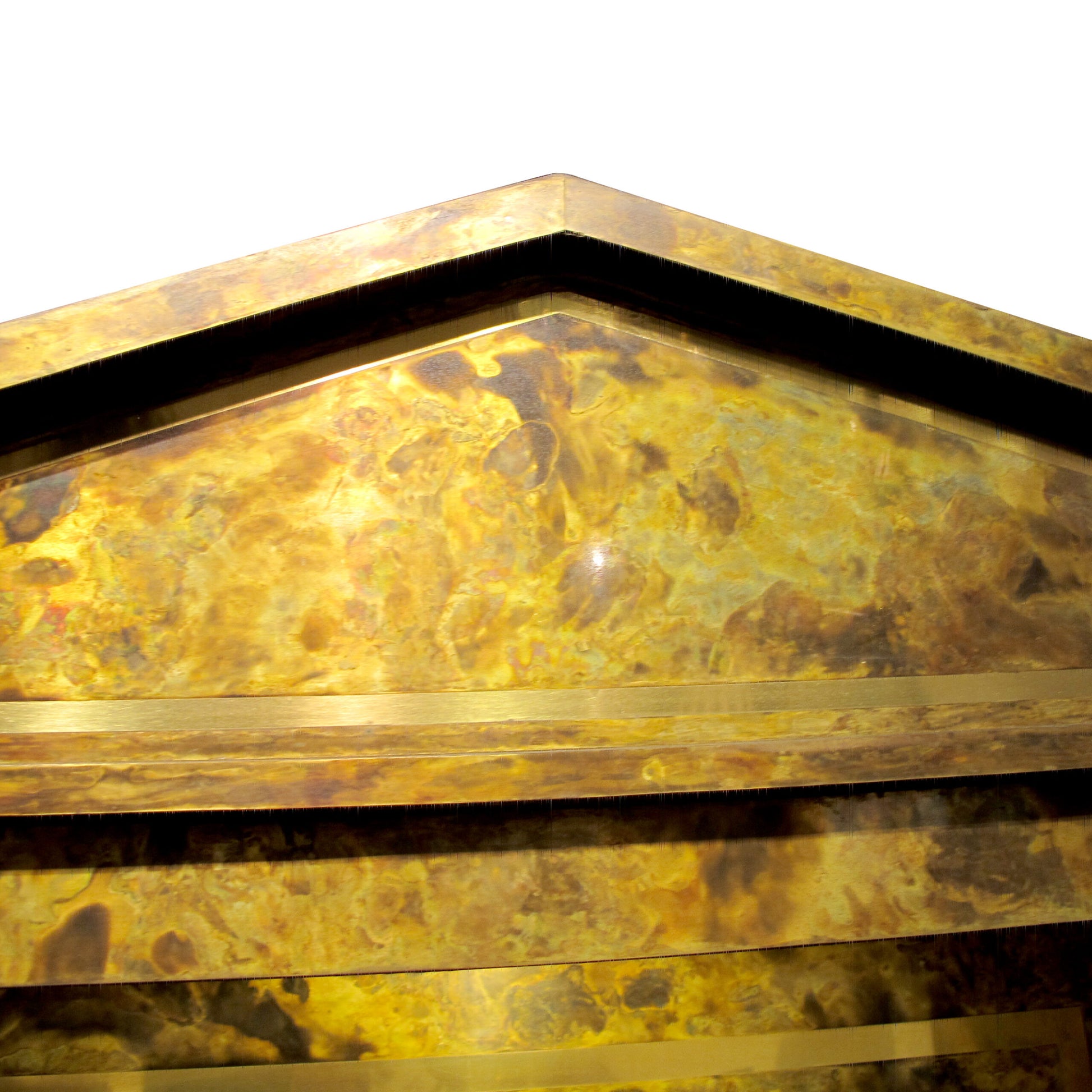 This is a Spanish display cabinet, from the 1970s, it features a striking combination of brass and copper sheets, giving it a rich, mottled effect that enhances its overall aesthetic. The upper section of the vitrine is equipped with two glass shelves, perfect for displaying decorative items, and is illuminated by an internal light that highlights the contents elegantly. The top section is framed by a triangular pediment, adding a classic architectural touch to the design. The lower part of the cabinet contains two doors with geometric patterns and brass ring pulls, providing additional storage space.