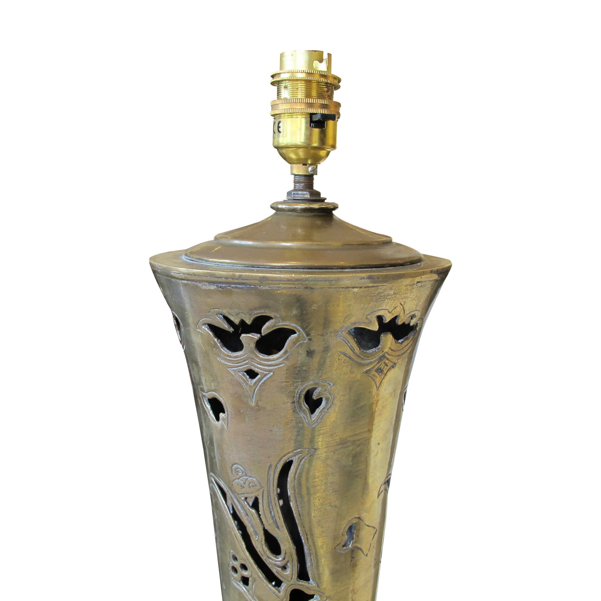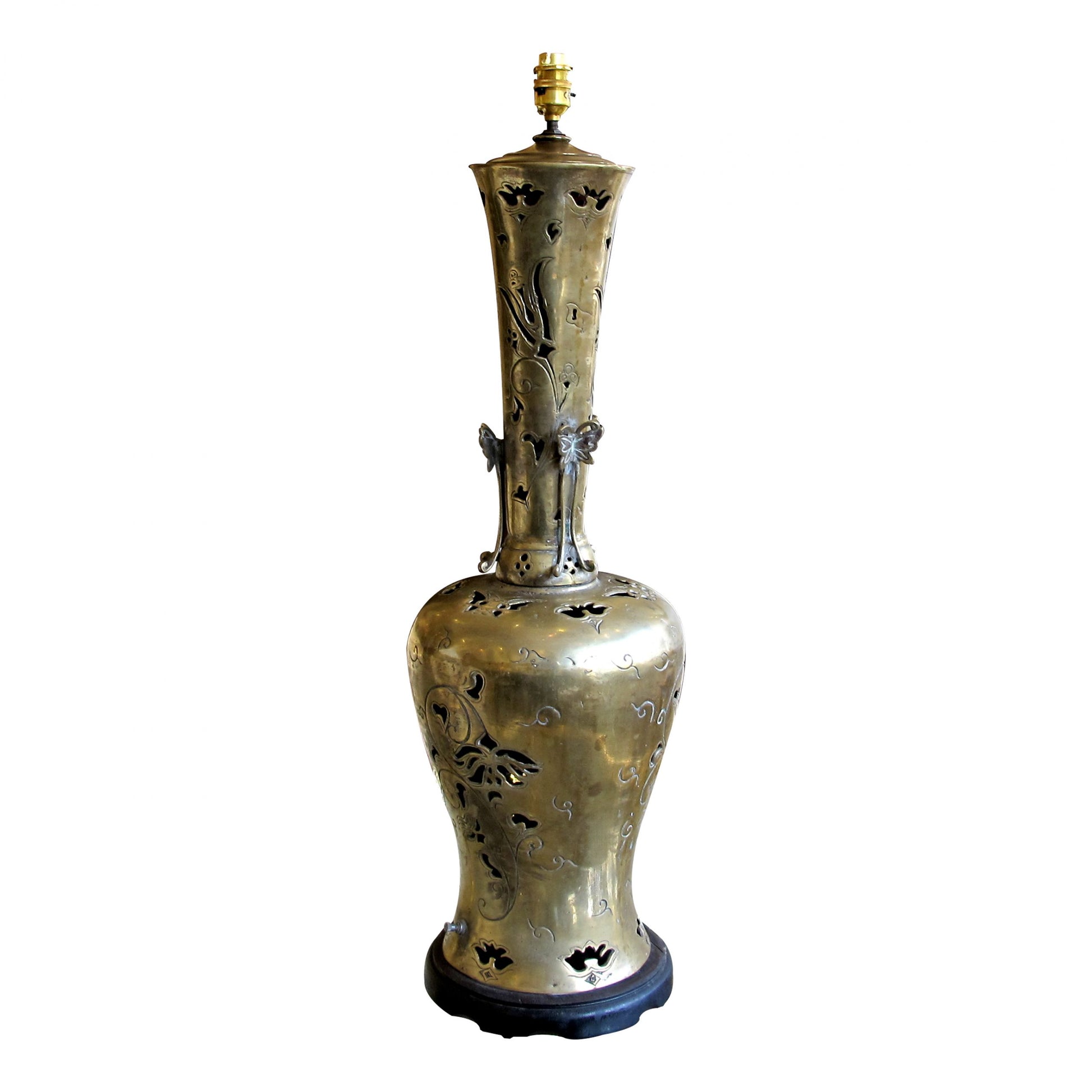 This is a rare large brass table lamp from around 1930. The lamp has generous and elegant curves and boast delicate flower and butterflies’ carvings, the neck of the lamp shows three brass butterflies in relief. The lamp is presented on a black carved circular wooden base.
