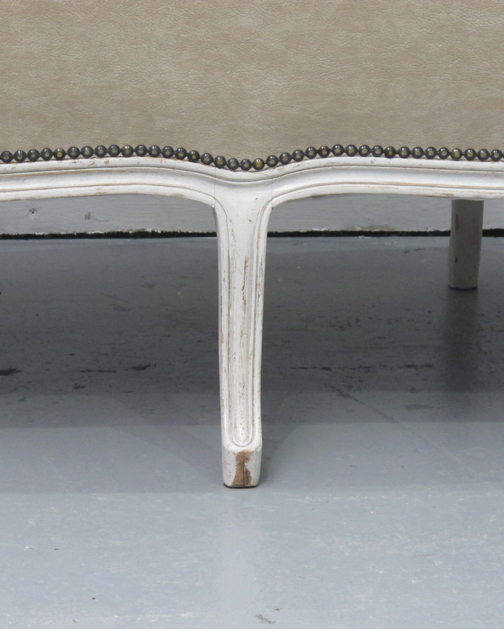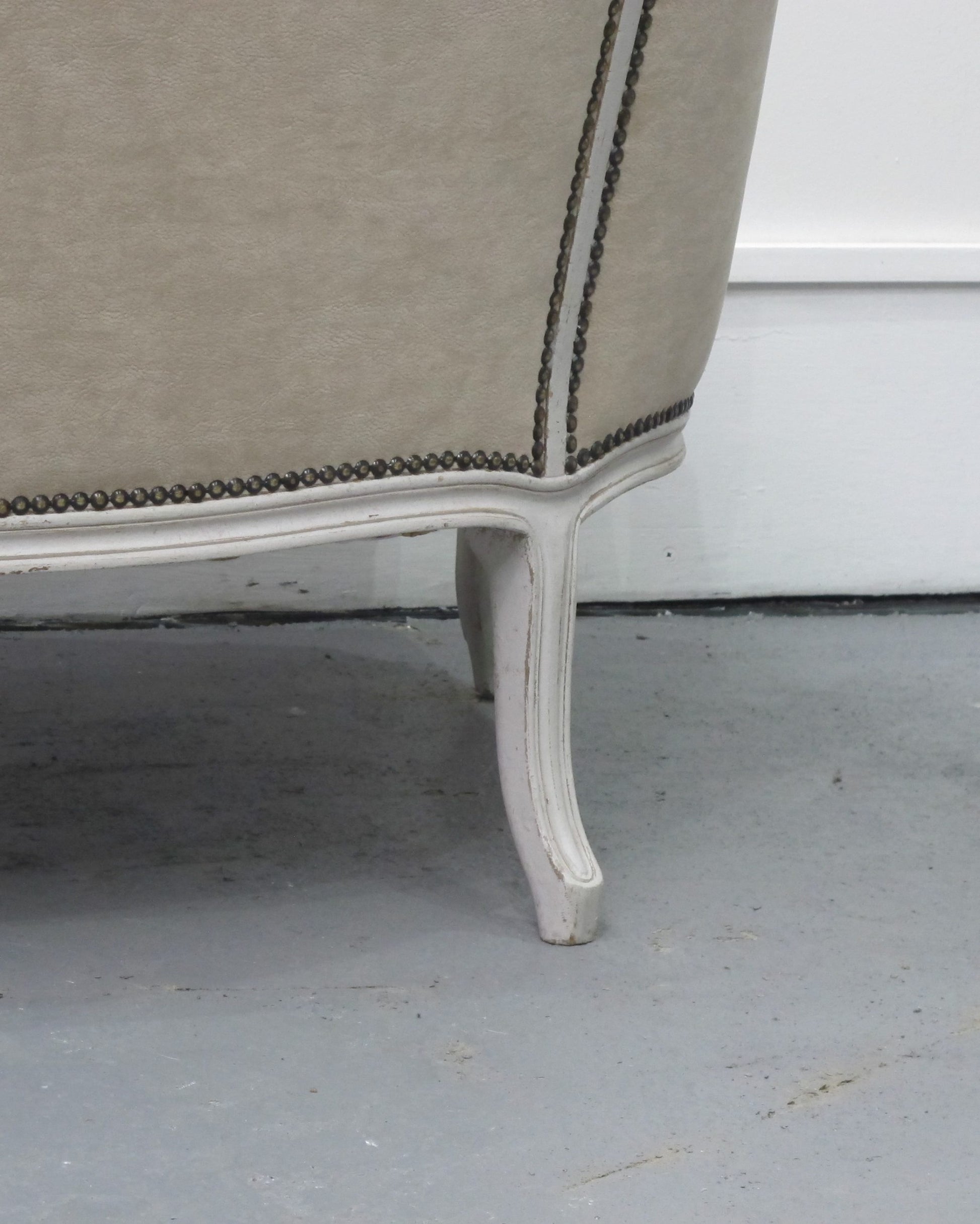 very resistant and easy to clean. The frame and the elegant scrolling legs are painted in a light grey colour.