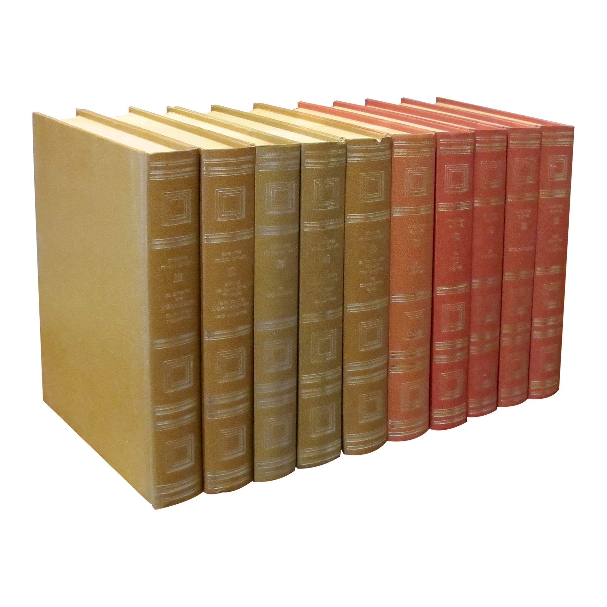A handsome set of ten vintage early 1970s French literary works, attractively bound in uniform decorative hardback editions with gilt-stamped spines and geometric covers. The collection includes five volumes by Marcel Aymé in red bindings (La Jument Verte, Le Vin de Paris, La Vouivre, Travellingue, Les Tiroirs de l’Inconnu) and five by Pierre Mac Orlan in gold bindings (À Bord de l’Étoile Matutine, Sous la Lumière Froide, Le Chant de l’Équipage, La Bandera, La Tradition de Minuit). Each volume measures approximatelylibrary book. H23.5 cm x W18 cm x D3–4 cm. A fine literary set and a striking addition to any library or collection of French literature.