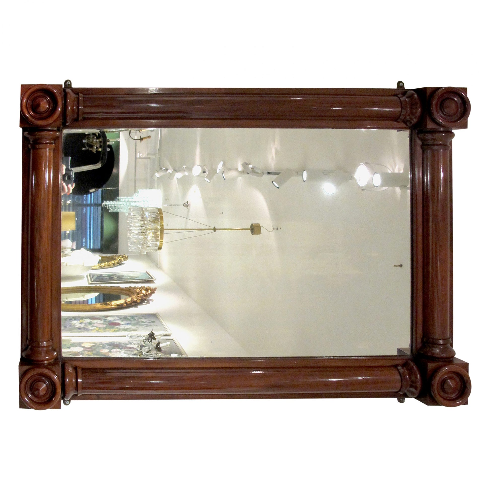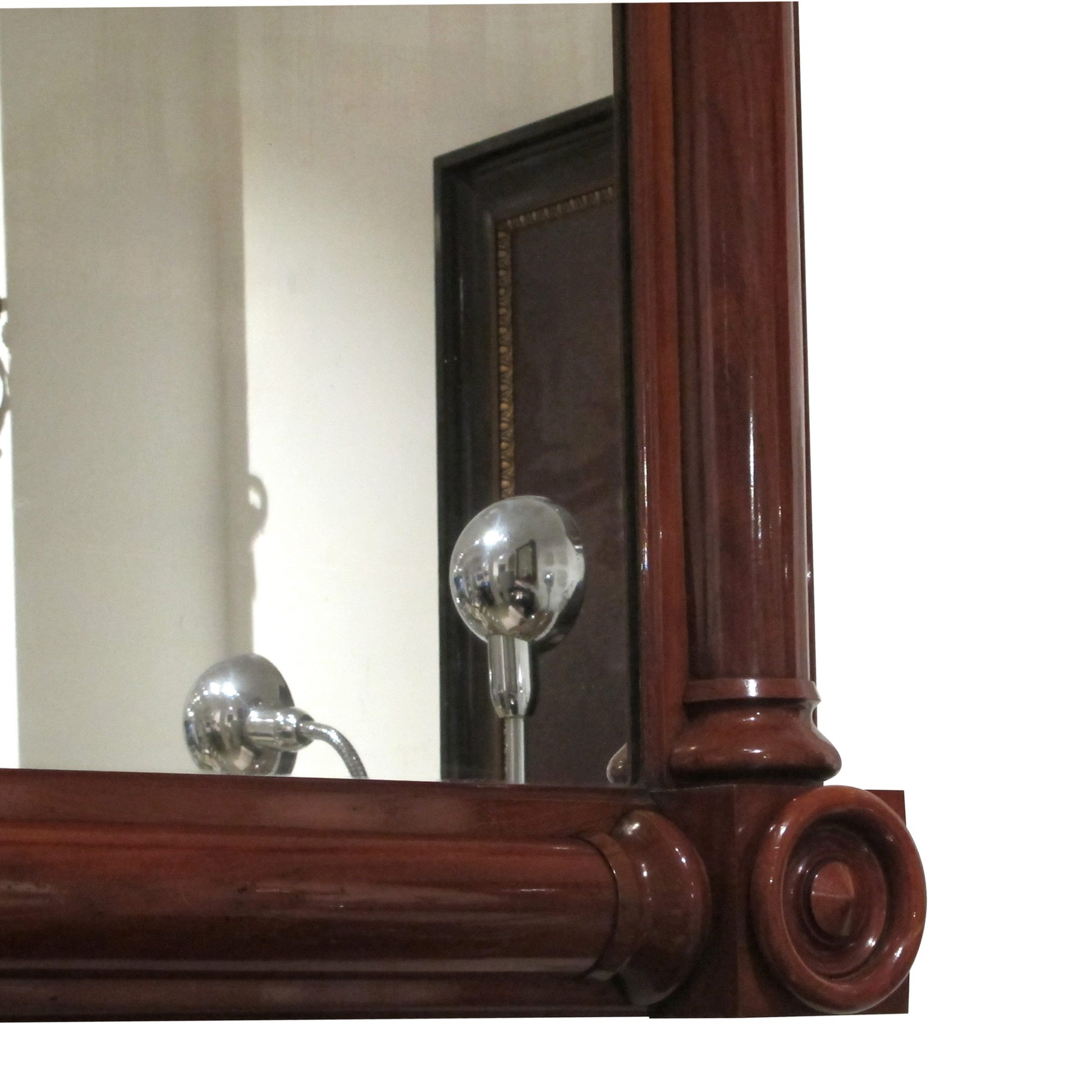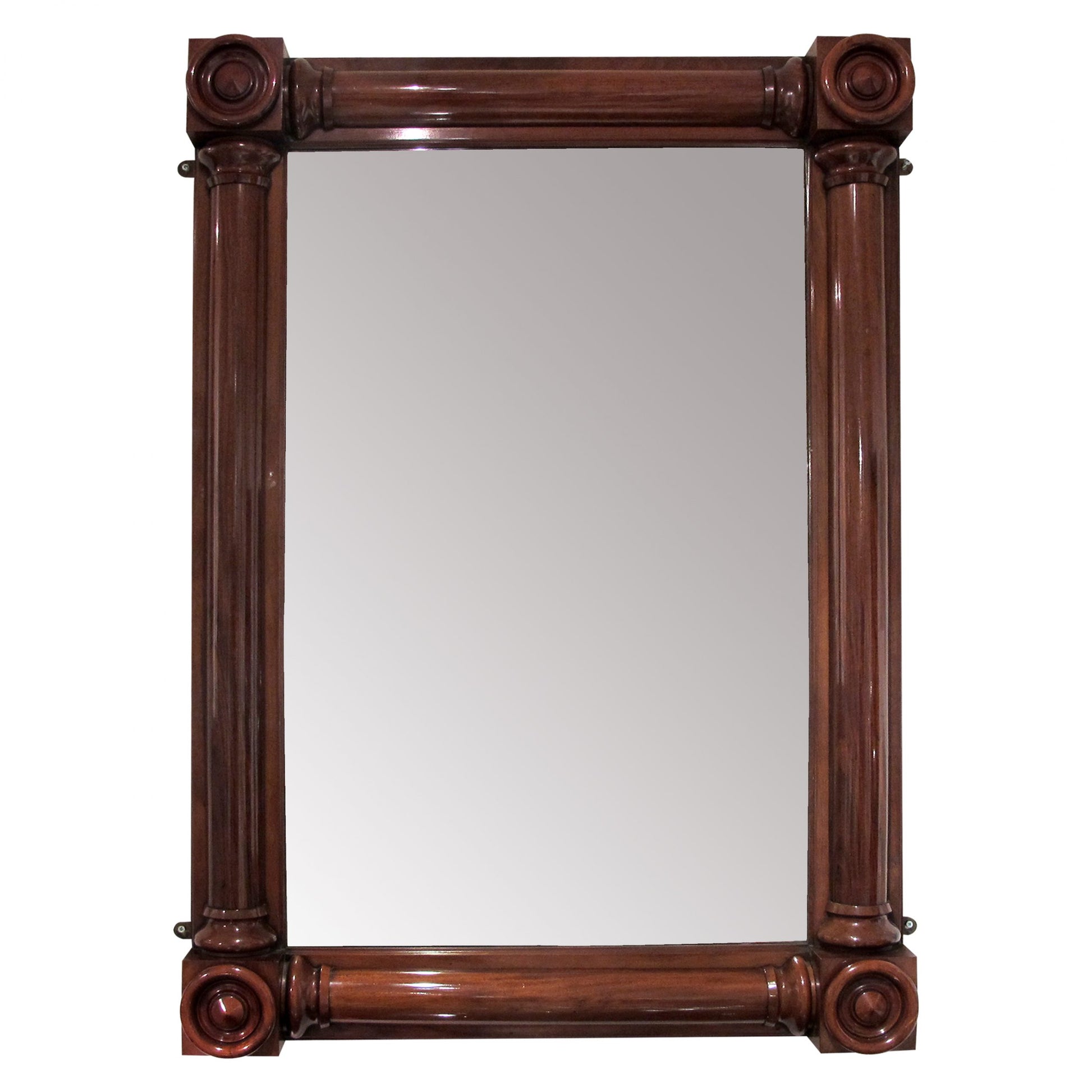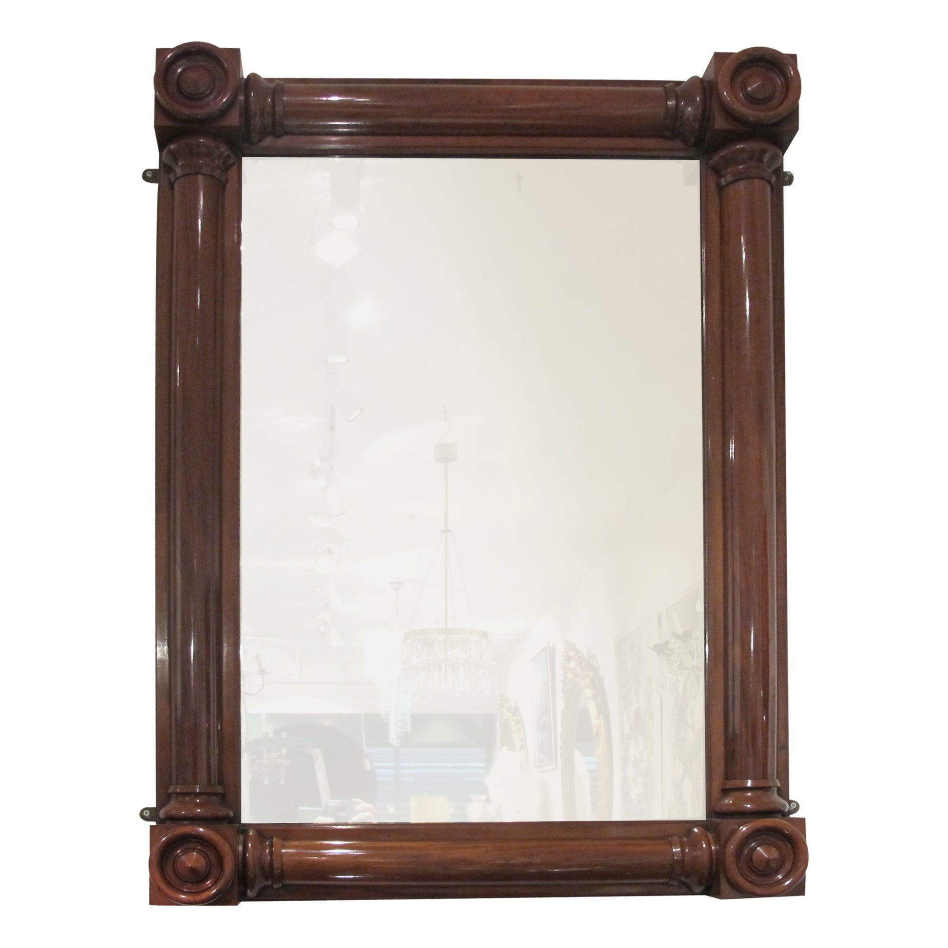This is a majestic structural mahogany William the IV mirror, 1830s. The symmetry of the mirror allows it to stand alone, over a mantel or in landscape position. The original glass shows barely noticeable signs of foxing adding character to the overall look of the mirror. The mirror is framed with elegant carved wood monumental columns and round carved reliefs on each corner. The mirror is in excellent condition.