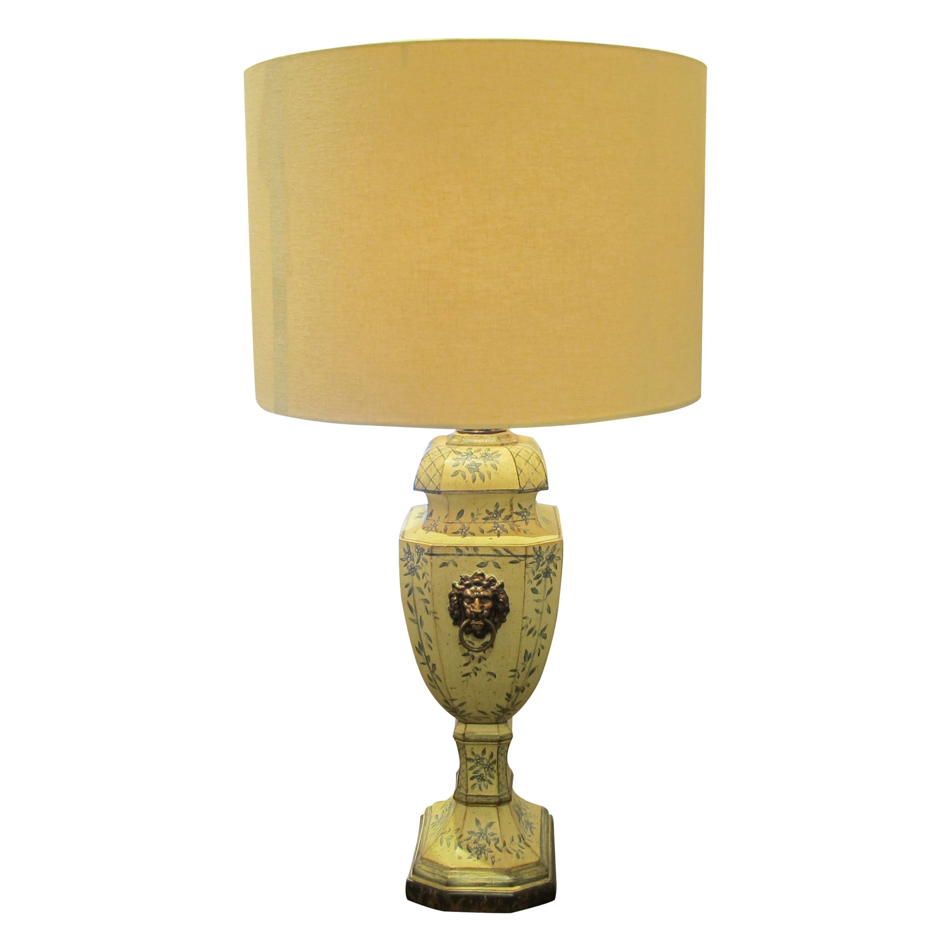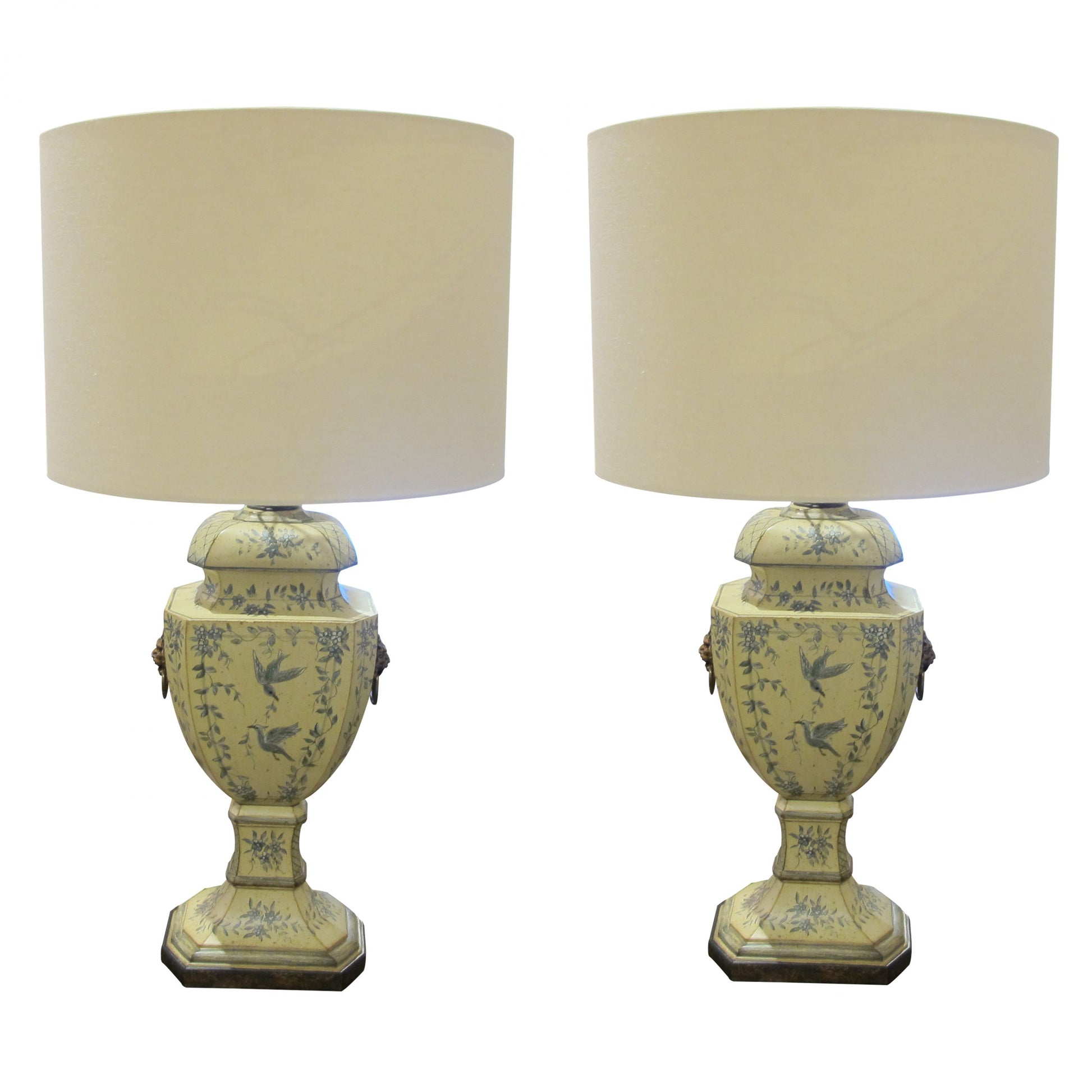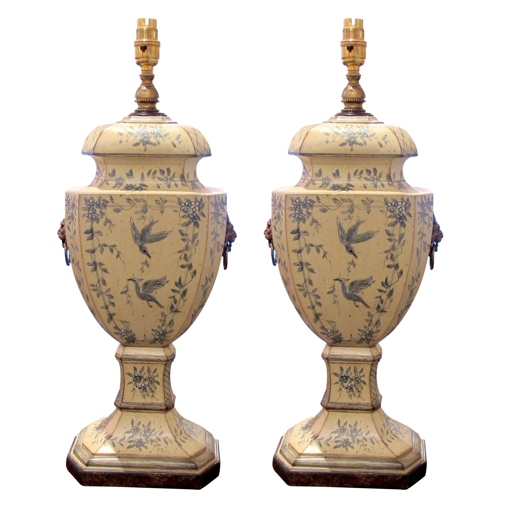 Pair of elegant mid-century French hand painted toleware table lamps with bronze coloured lion heads with a ring either side of the lamps. The lamps have a pale cream patina and decorated with a light blue hand painted leaf, flowers and flying birds. The lamps are in great condition will be a great addition to any room. The lampshades are not sold with the lamps