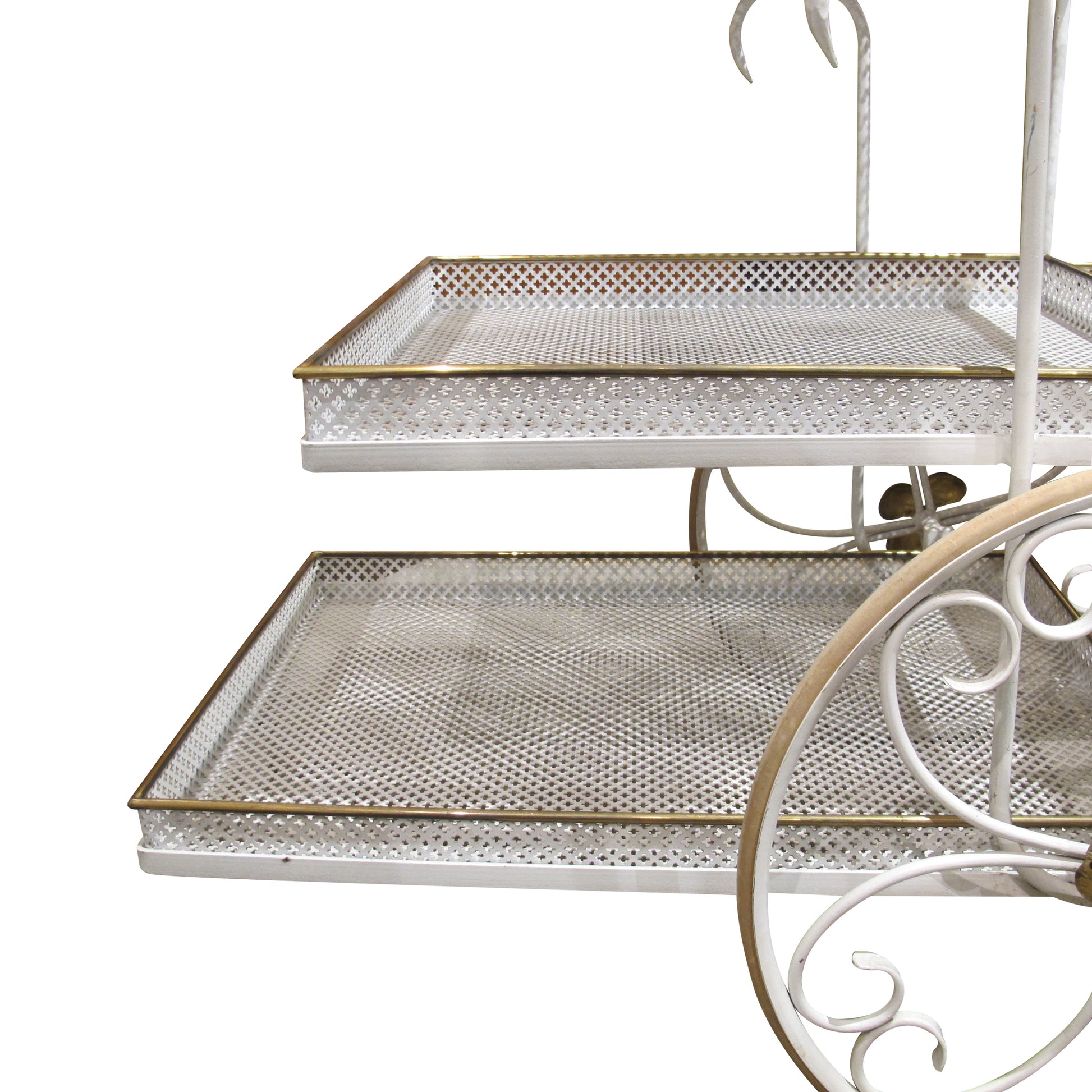 A beautifully designed three-tier serving trolley in the style of Mathieu Matégot, showcasing the refined craftsmanship and sculptural metalwork characteristic of French mid-century design. The trolley features three perforated metal trays, each bordered with elegant brass trims, all removable for convenient serving. Its graceful wrought-iron frame is finished in white, accented by large decorative wheels with scrolling motifs and brass flower hubs. Smoothly rolling and well-balanced, this piece serves as a perfect serving cart or bar trolley.