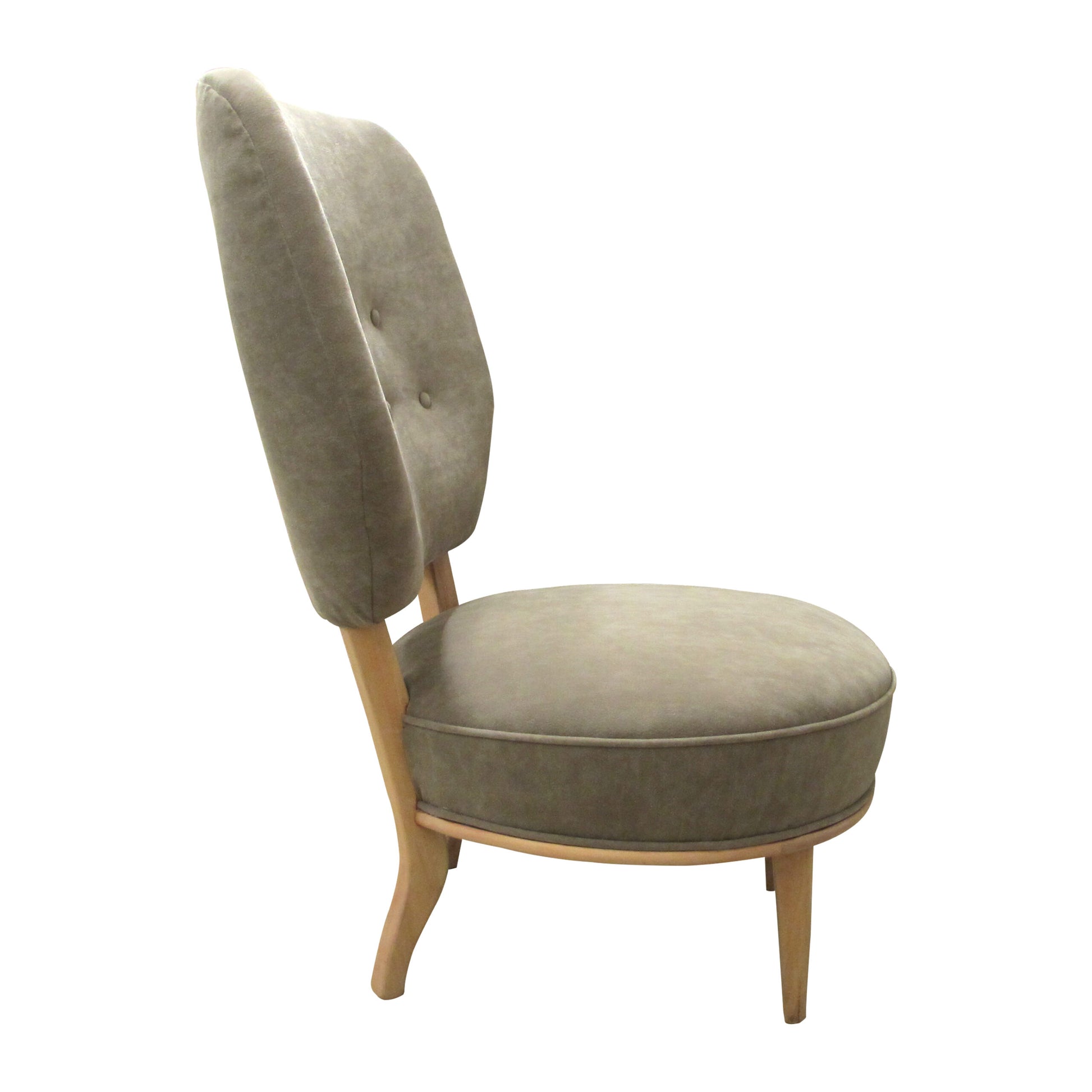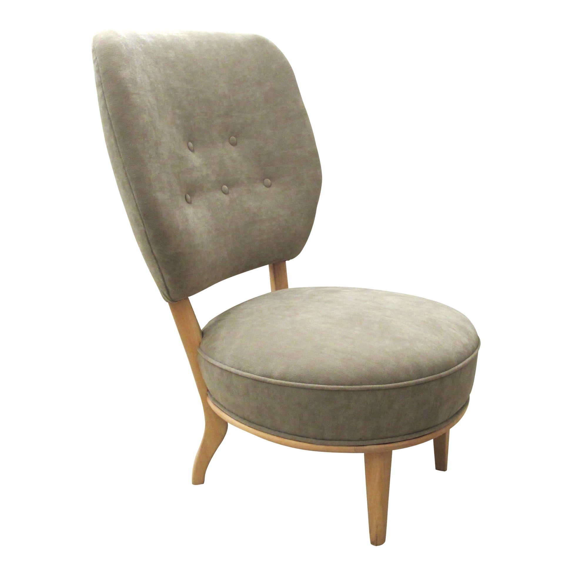 Mid-Century elegant His and Her’s pair of easy chairs with a large comfortable backrest and a smooth birch wood frame with elegant curves, “His” chair is 3 cm higher than “Hers”. The chairs have been re-upholstered in a suede-like washable durable fabric.
