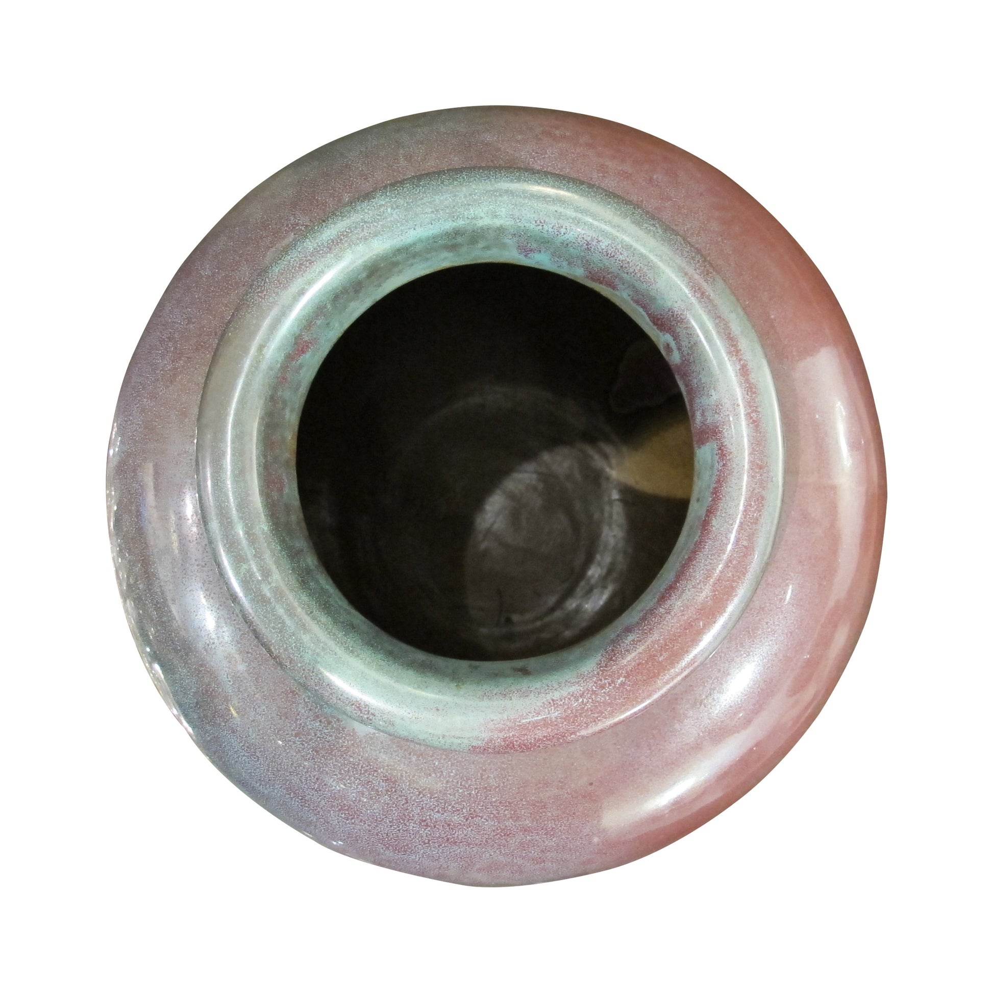 This large glazed ceramic vase was made in West Germany in the 1940s. It features a bold green and red mottled glaze with a smooth, glossy finish. The simple, rounded form and heavy ceramic body make it a versatile decorative piece, suitable for displaying flowers or as a standalone accent.