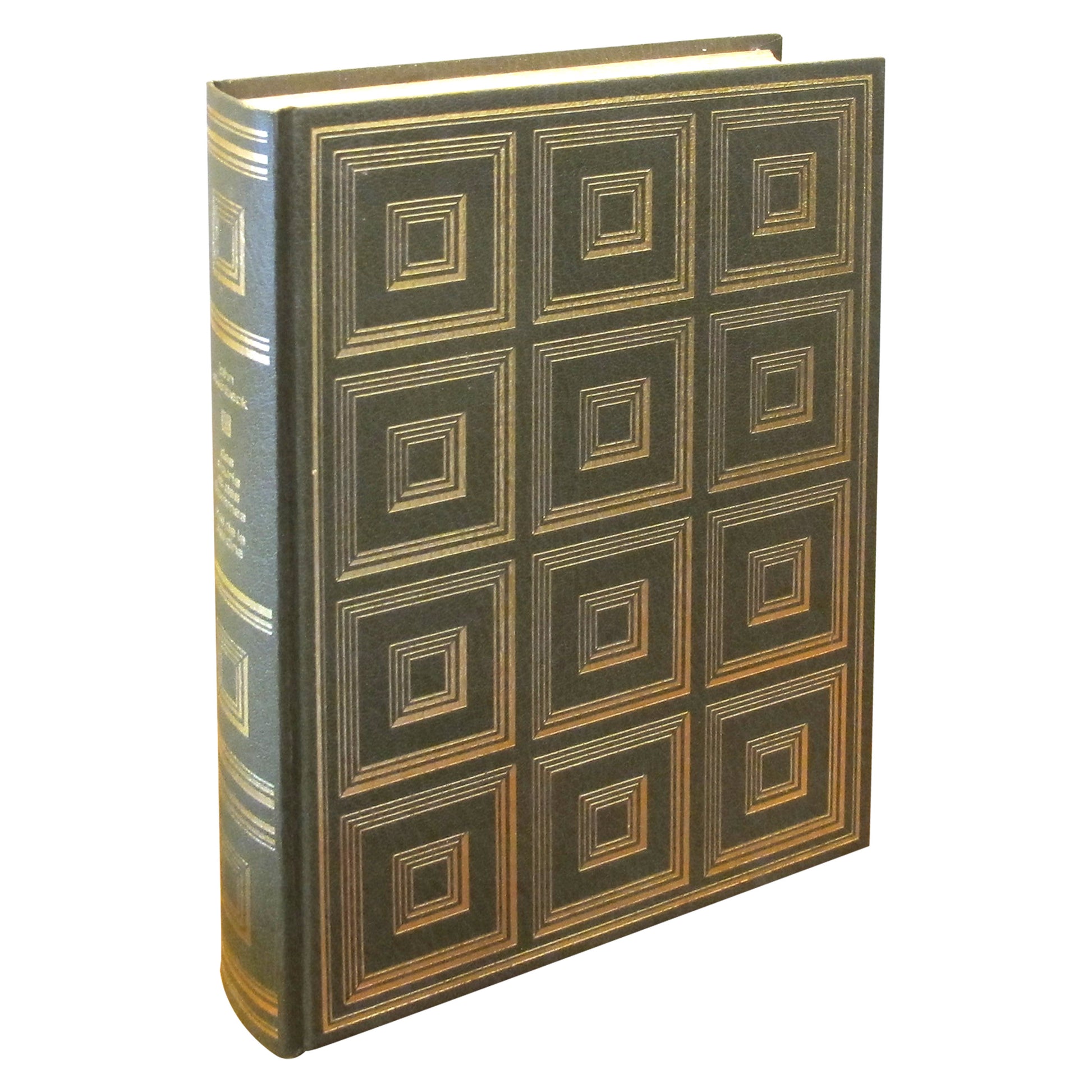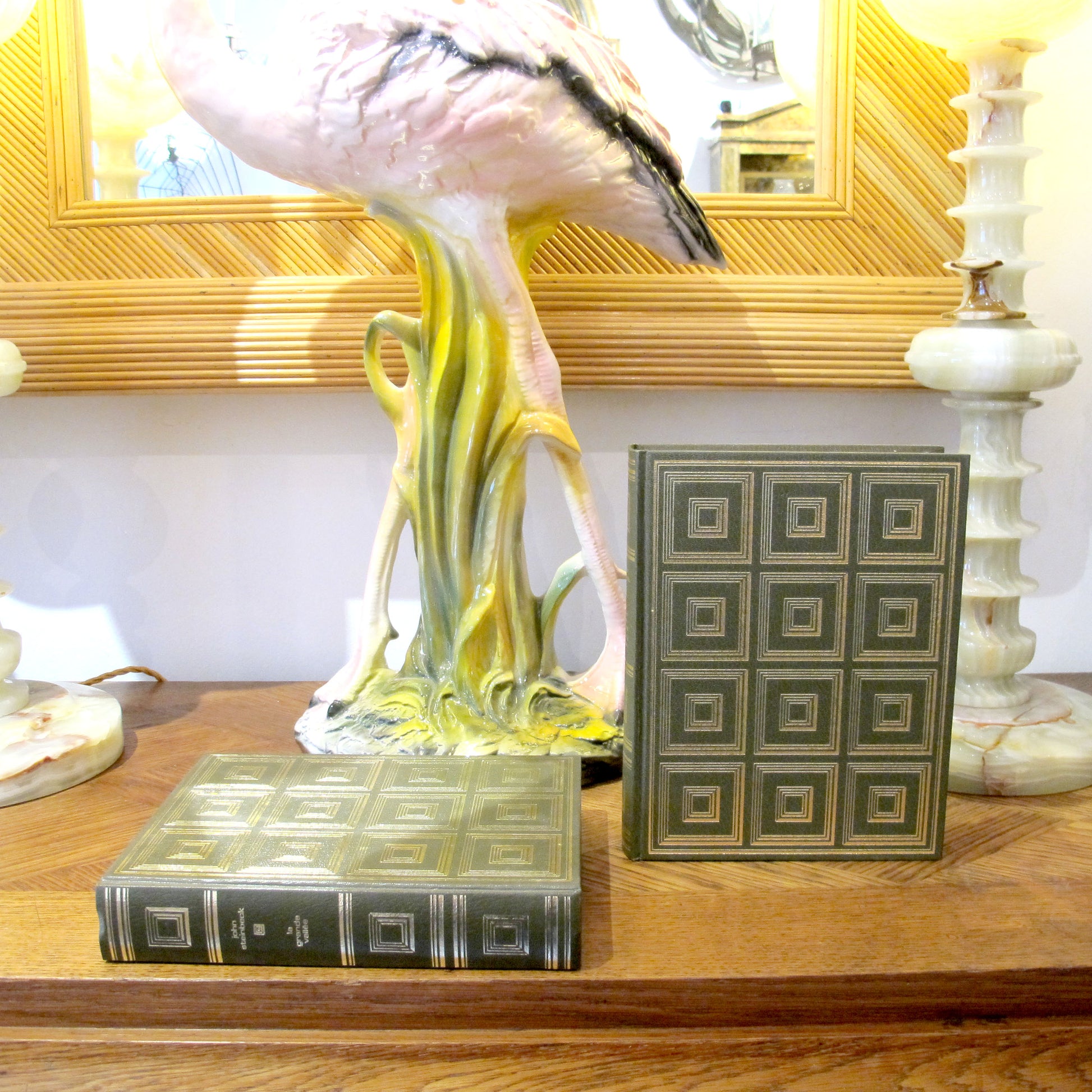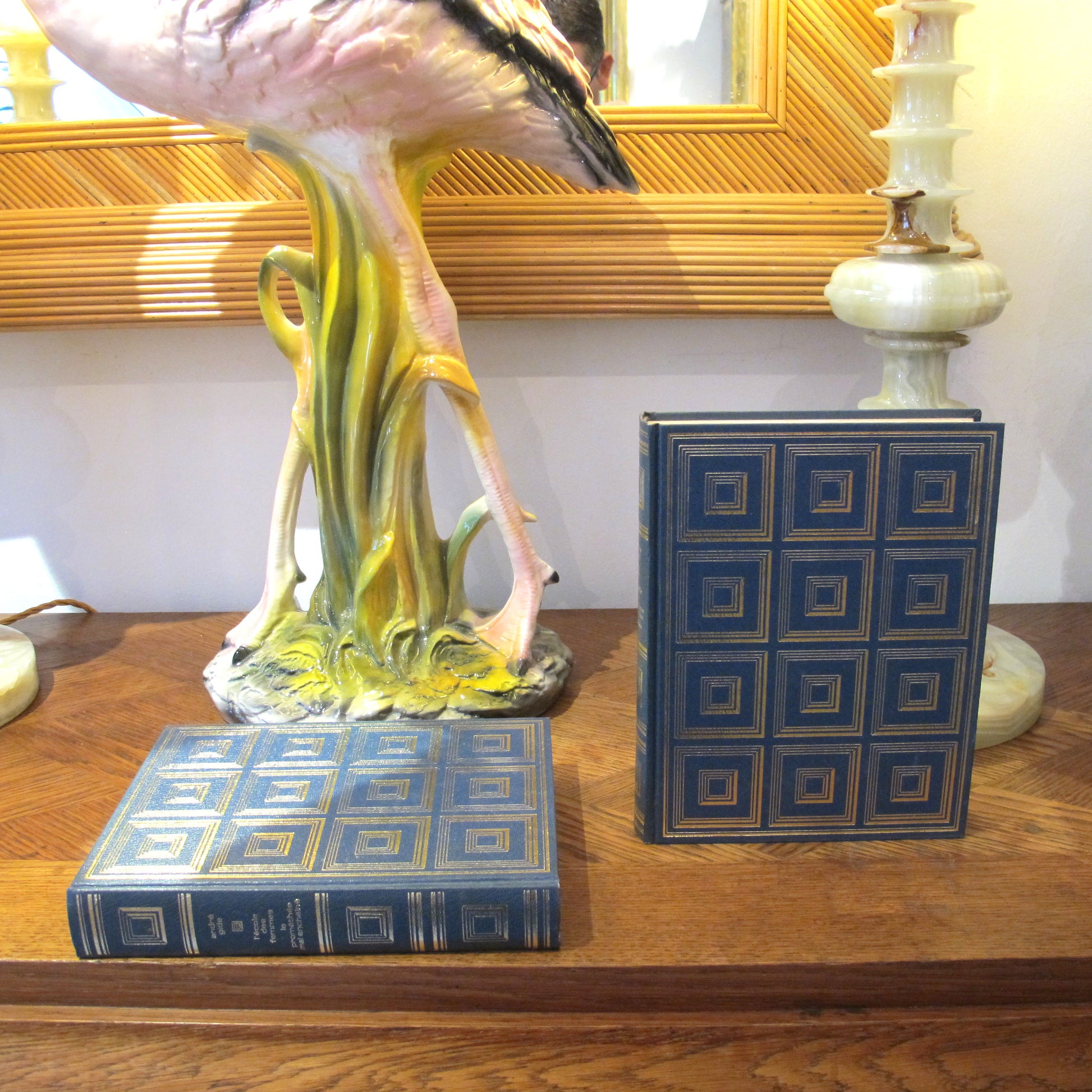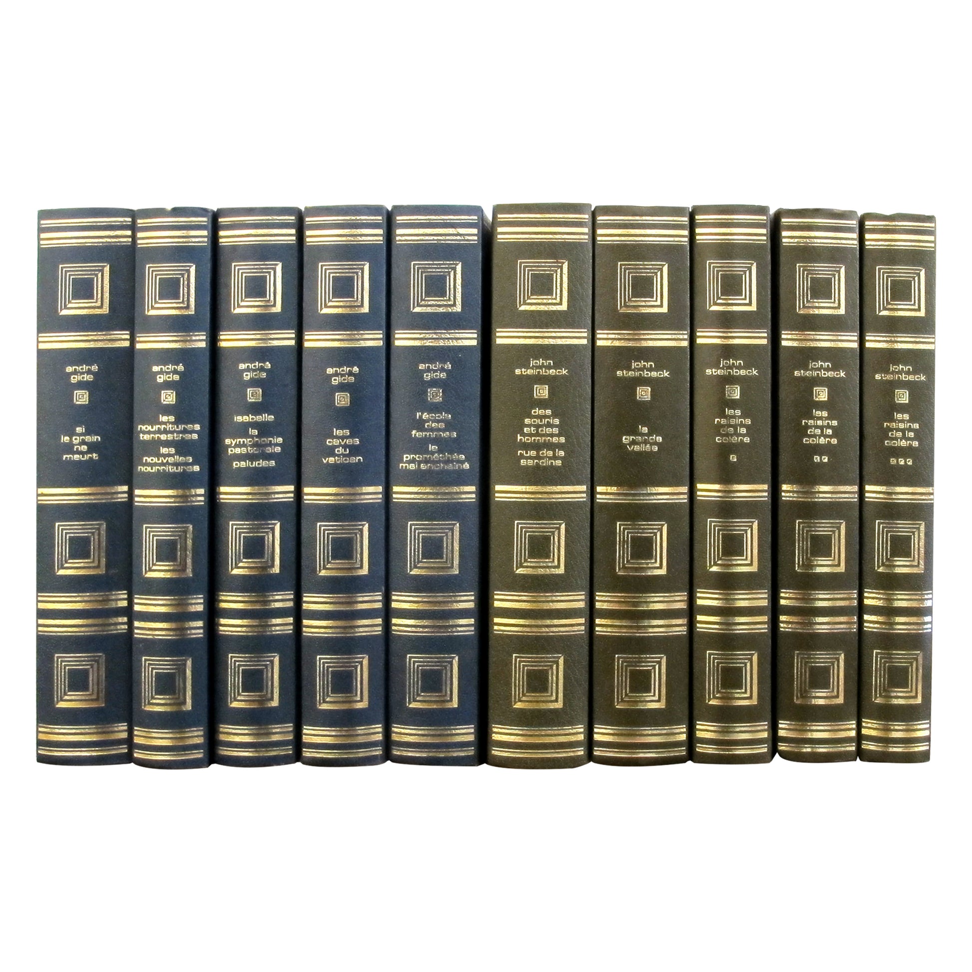 A collection of 10 attractively bound vintage hardback volumes, early 1970s, presented in uniform decorative bindings with gilt-stamped spines and geometric cover motifs. Five works by André Gide in blue covers, and five by John Steinbeck in green covers.