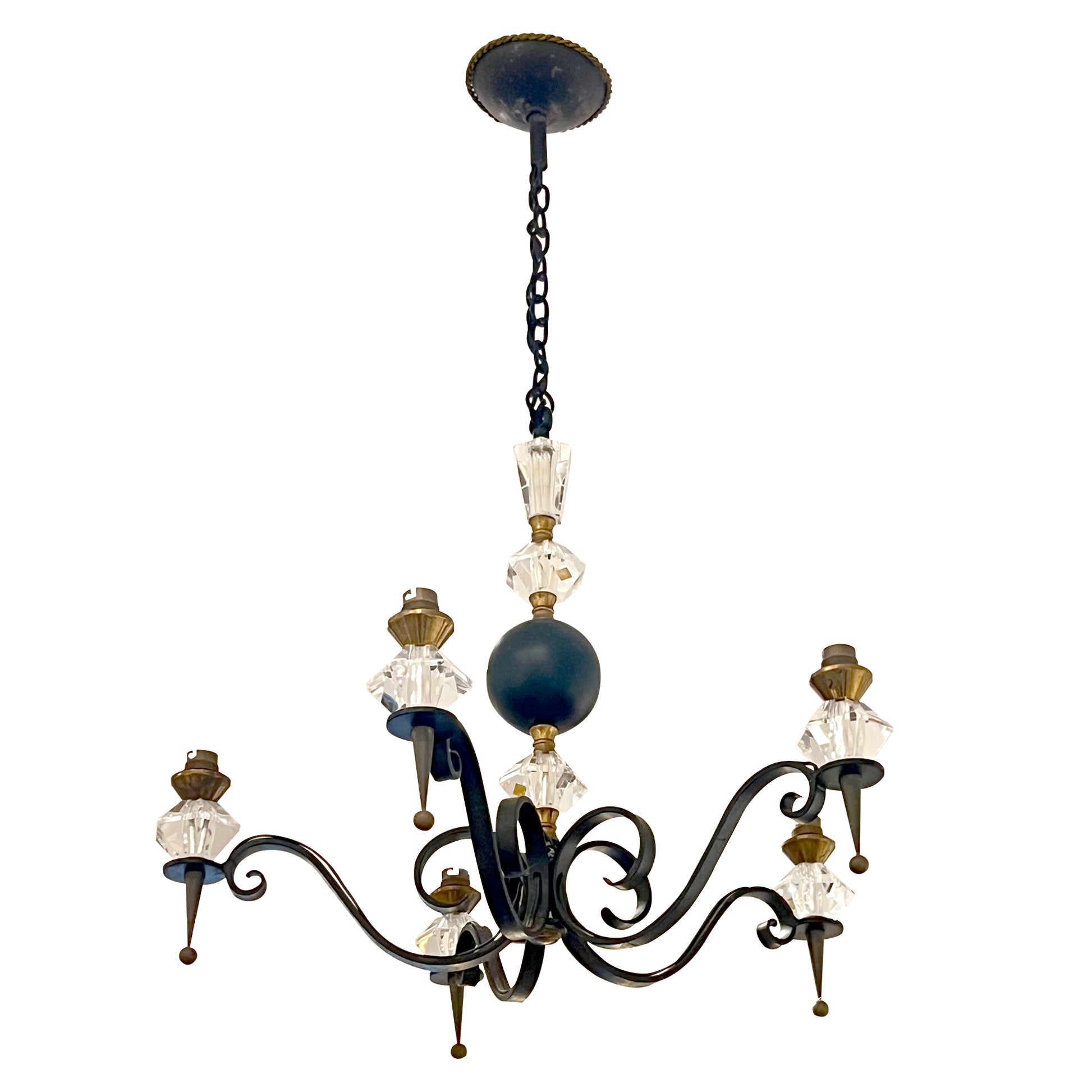 Mid-Century French Wrought Iron and Cristal de Sèvres Five-Branch Chandelier