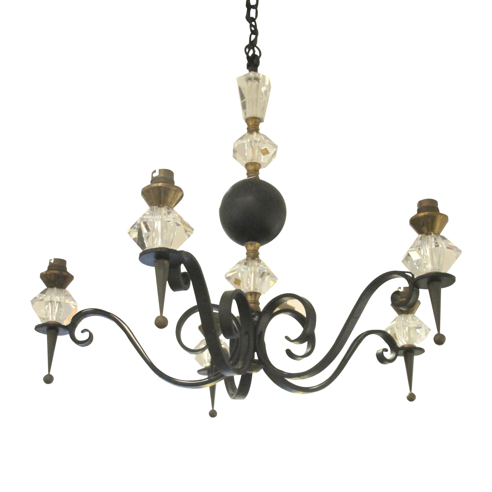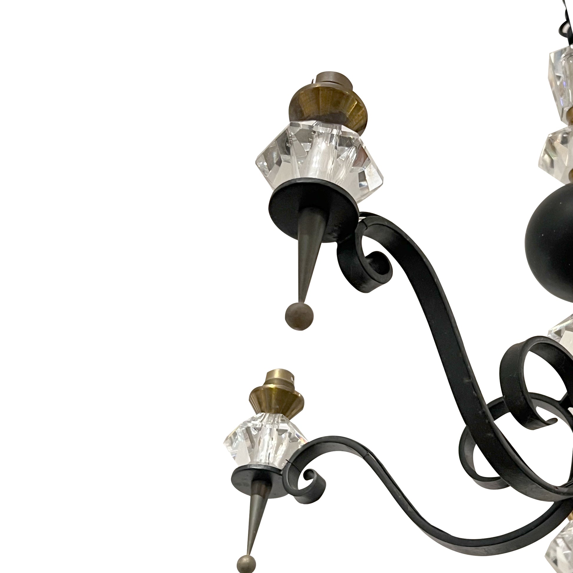 This is an elegant mid-20th-century chandelier featuring a harmonious blend of wrought iron, bronze accents, and fine Cristal de Sèvres glass elements. The chandelier is designed with five gracefully scrolling arms, each terminating in a candle-style light fixture set atop faceted crystal glass bobeches.