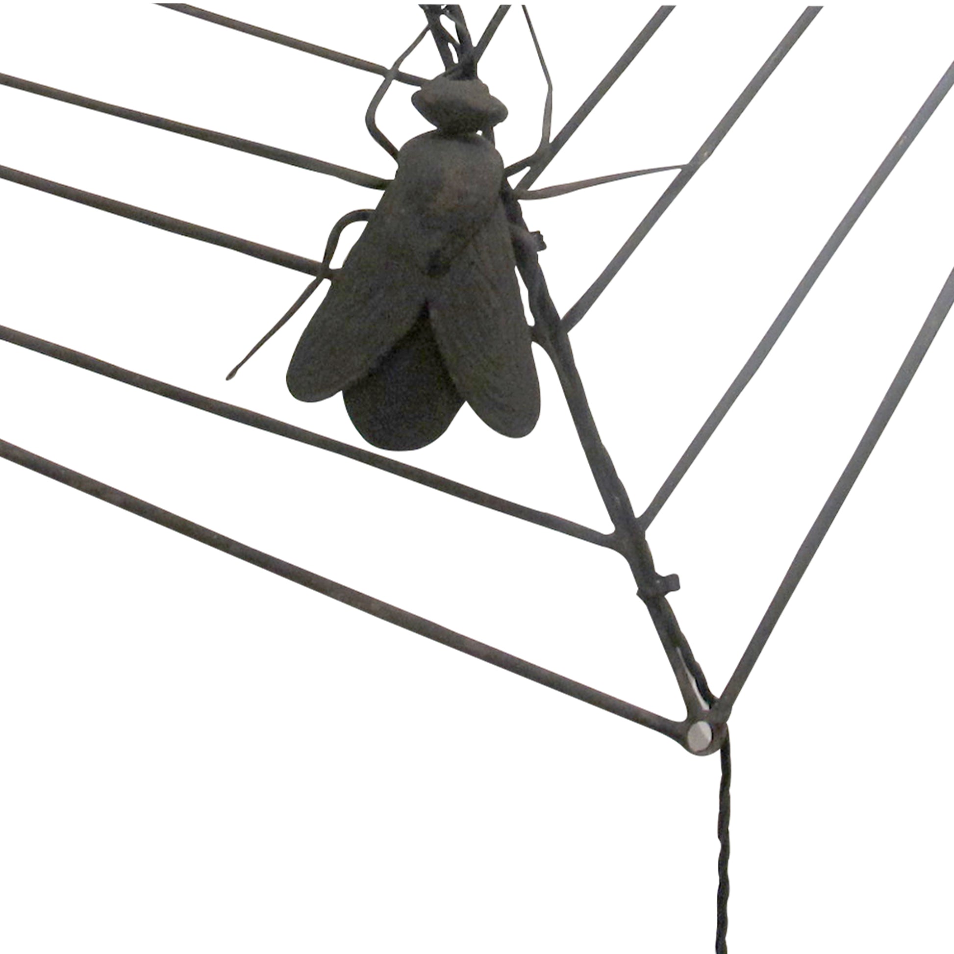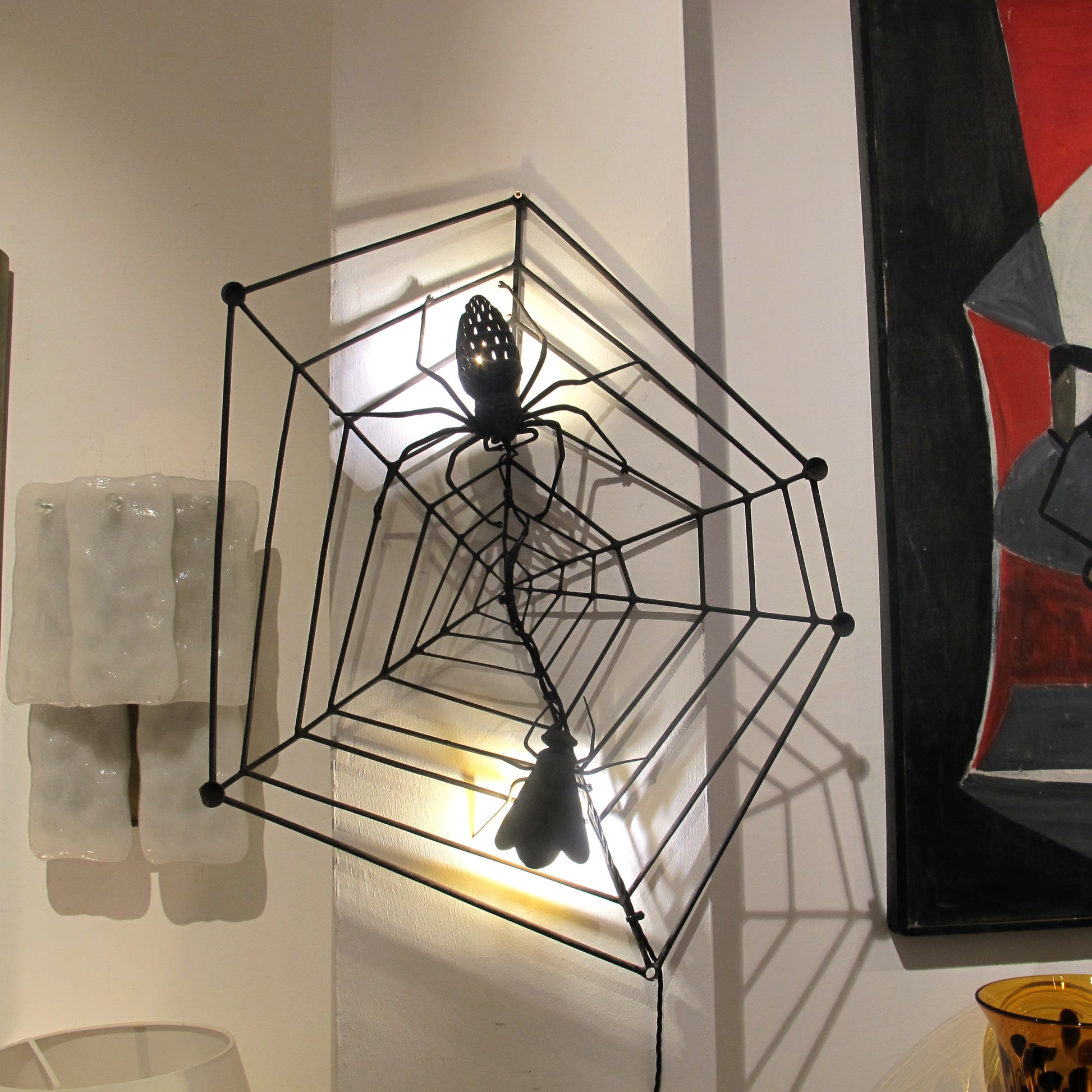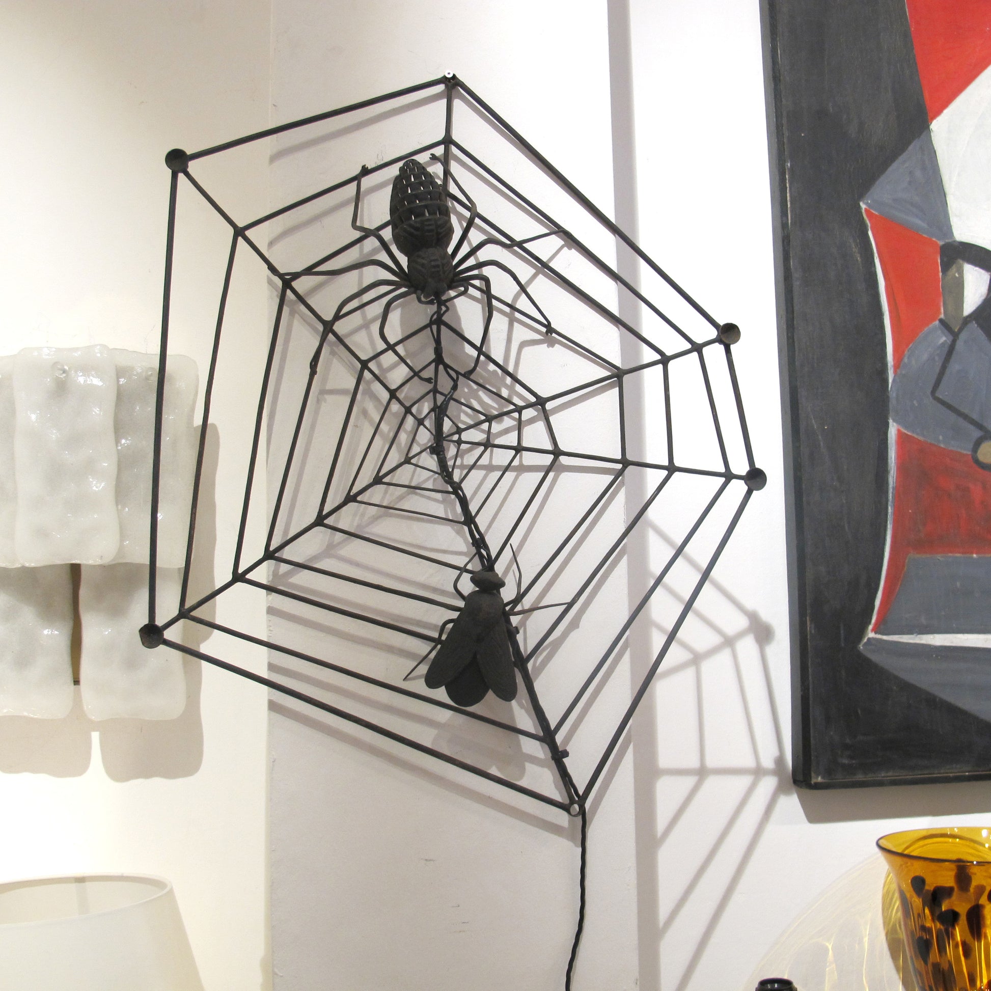 An unusual and striking wrought iron wall light, French circa 1950, featuring a dramatic spider and fly motif. The piece is crafted with a geometric web structure, centered by a stylised spider poised above a captured fly, both rendered in dark metal. The web is cleverly integrated with a light source mounted to the wall, casting intricate shadows that enhance the three-dimensional effect of the design.