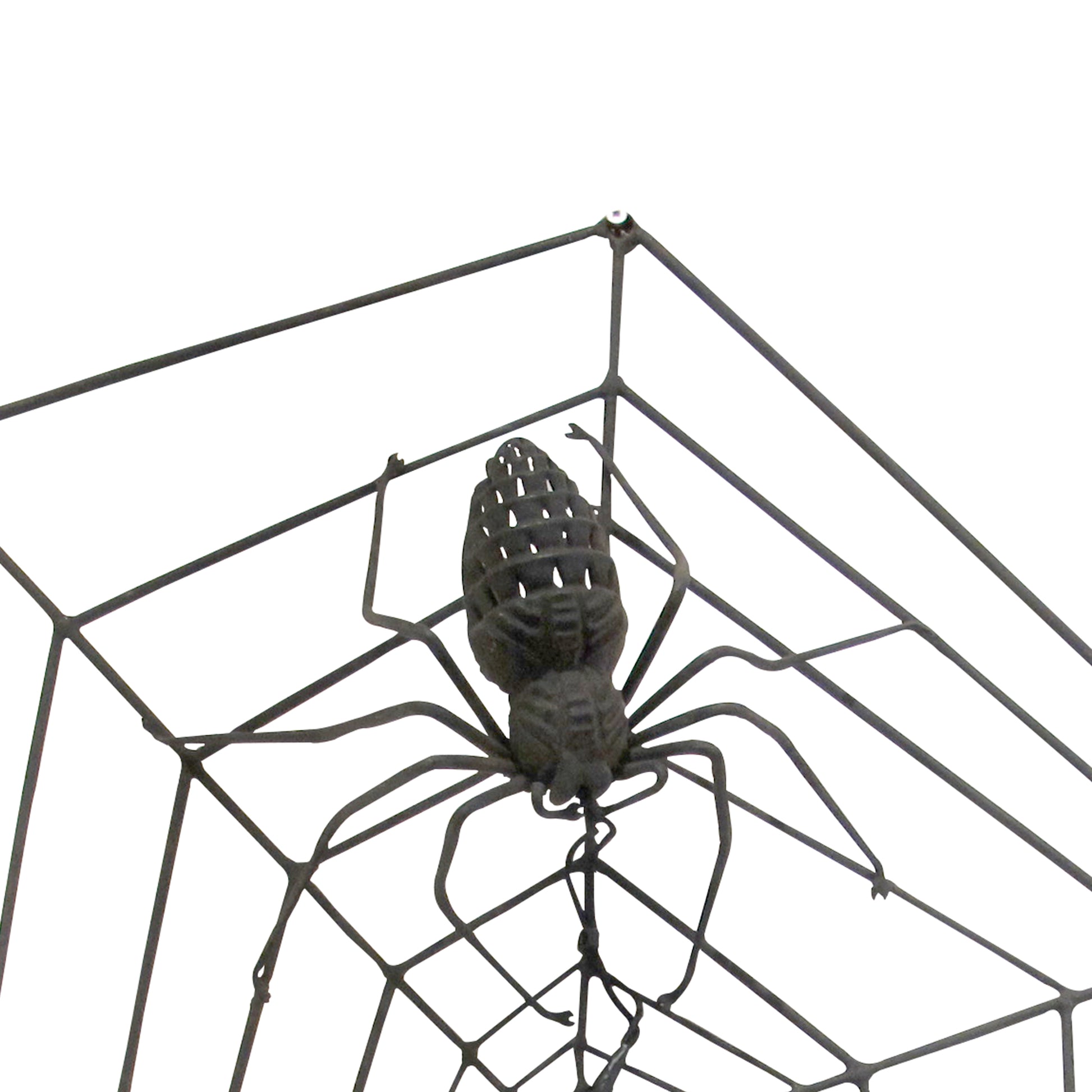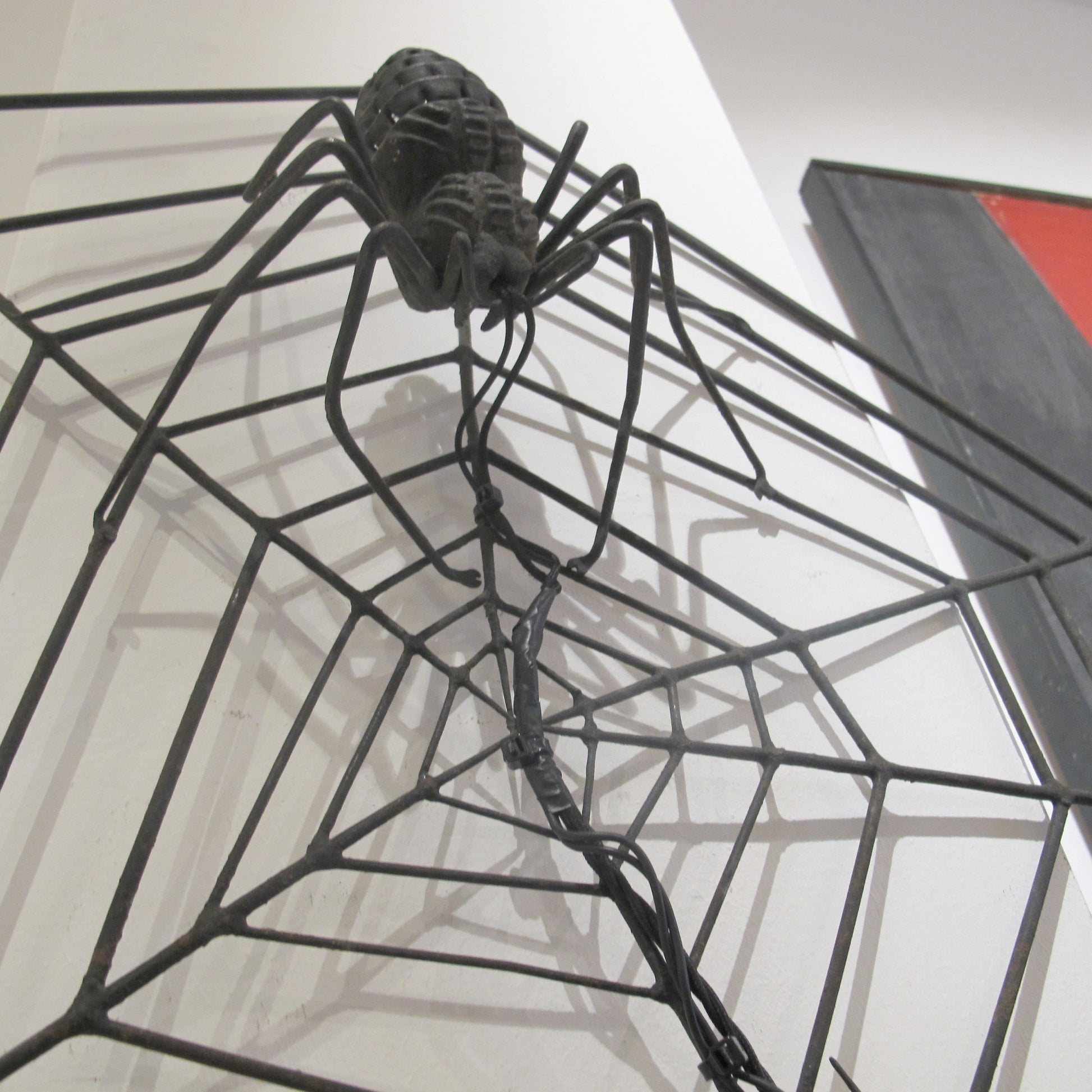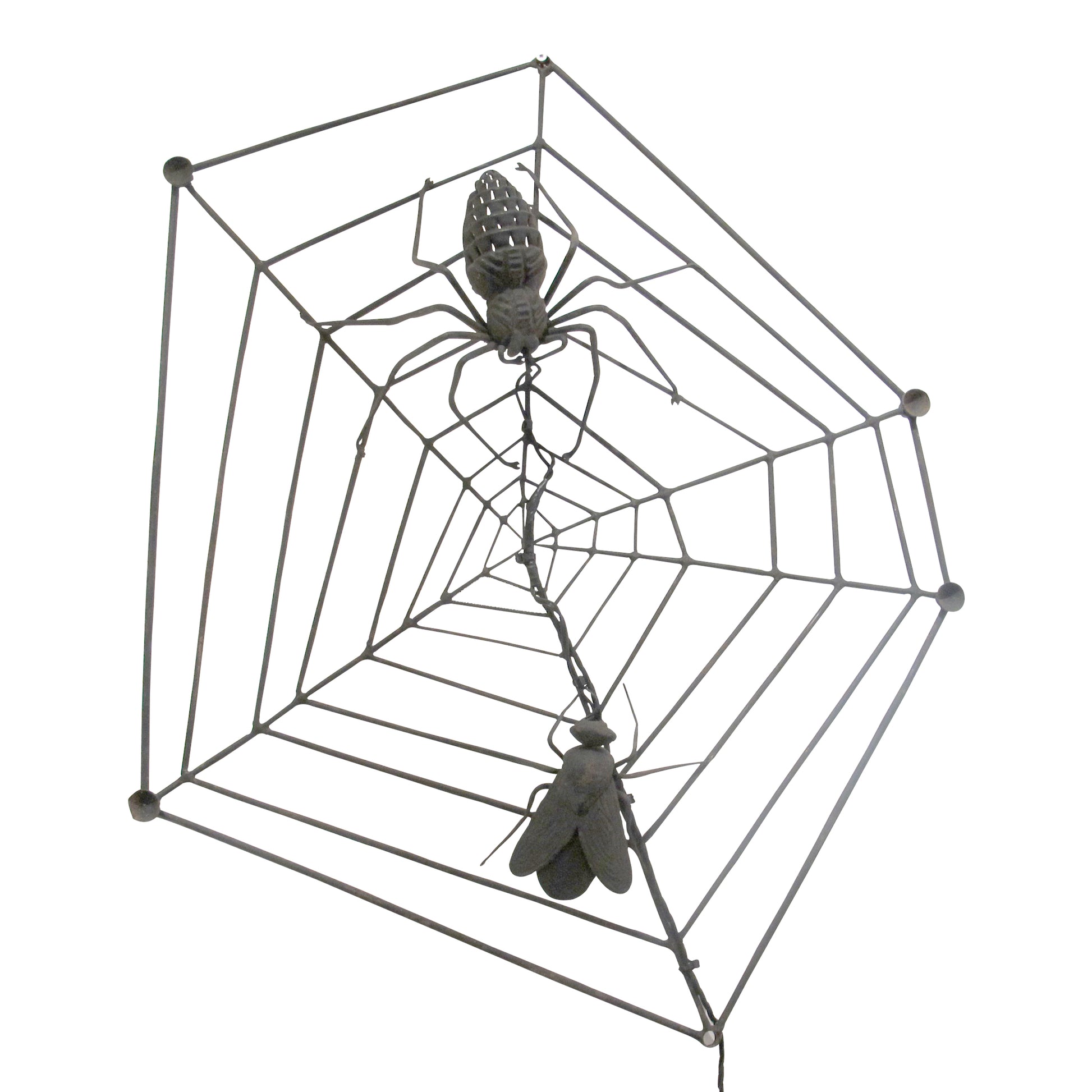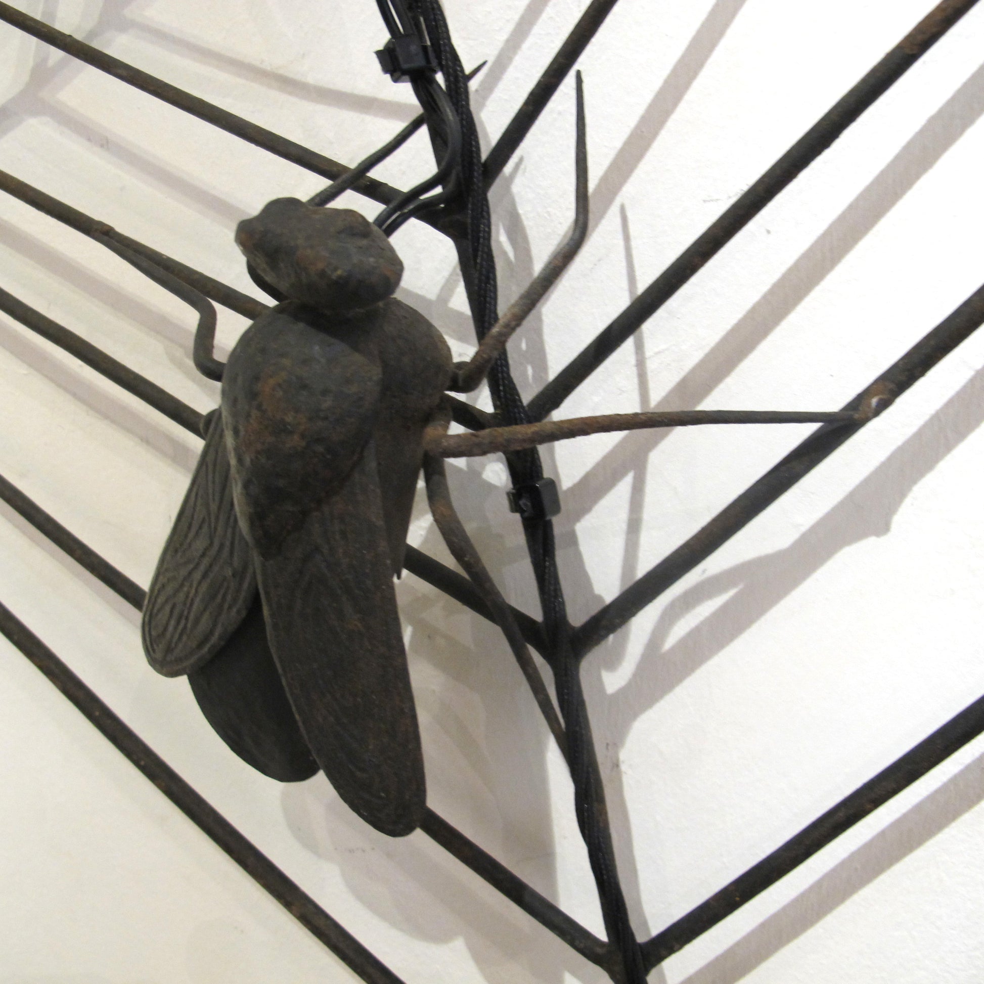 An unusual and striking wrought iron wall light, French circa 1950, featuring a dramatic spider and fly motif. The piece is crafted with a geometric web structure, centered by a stylised spider poised above a captured fly, both rendered in dark metal. The web is cleverly integrated with a light source mounted to the wall, casting intricate shadows that enhance the three-dimensional effect of the design.