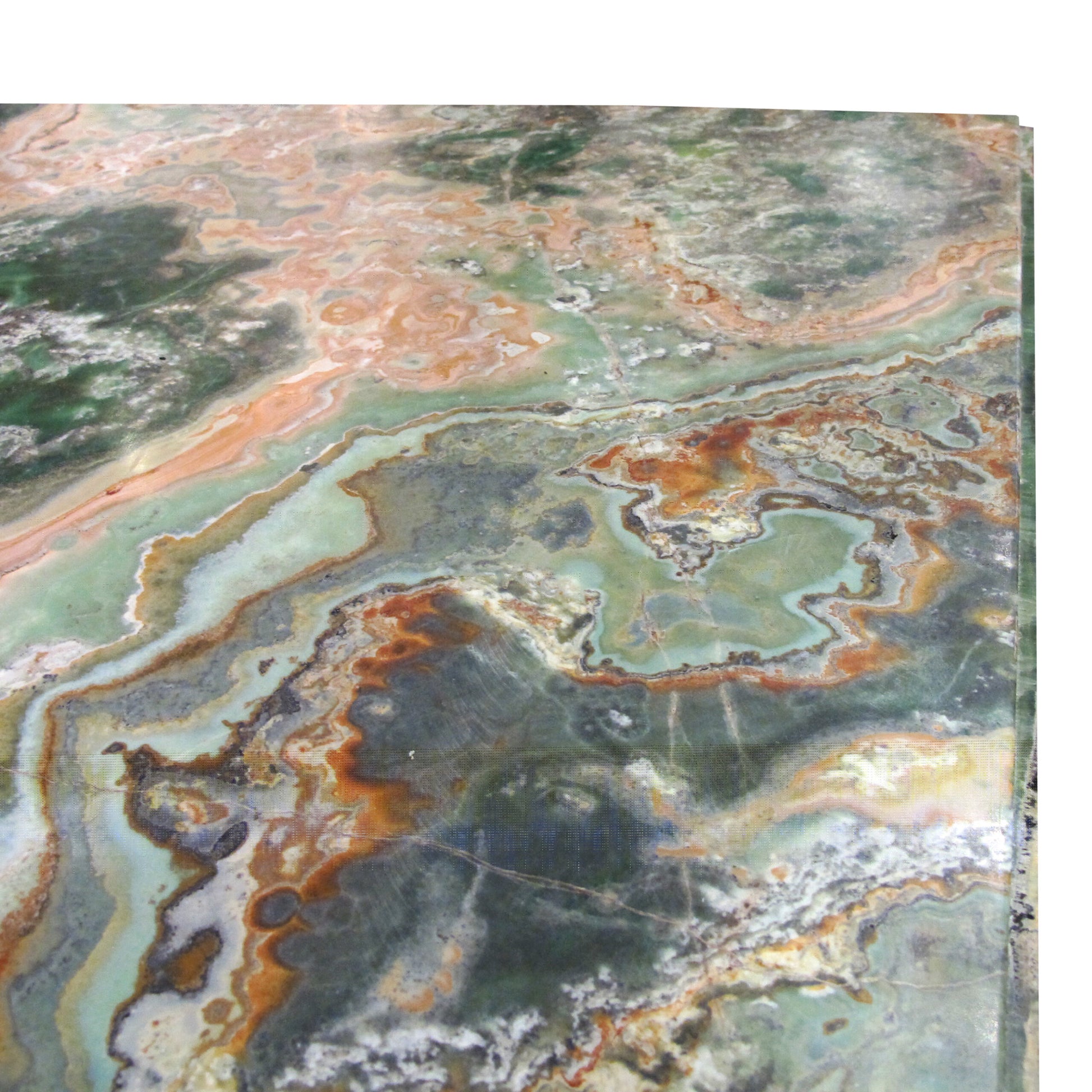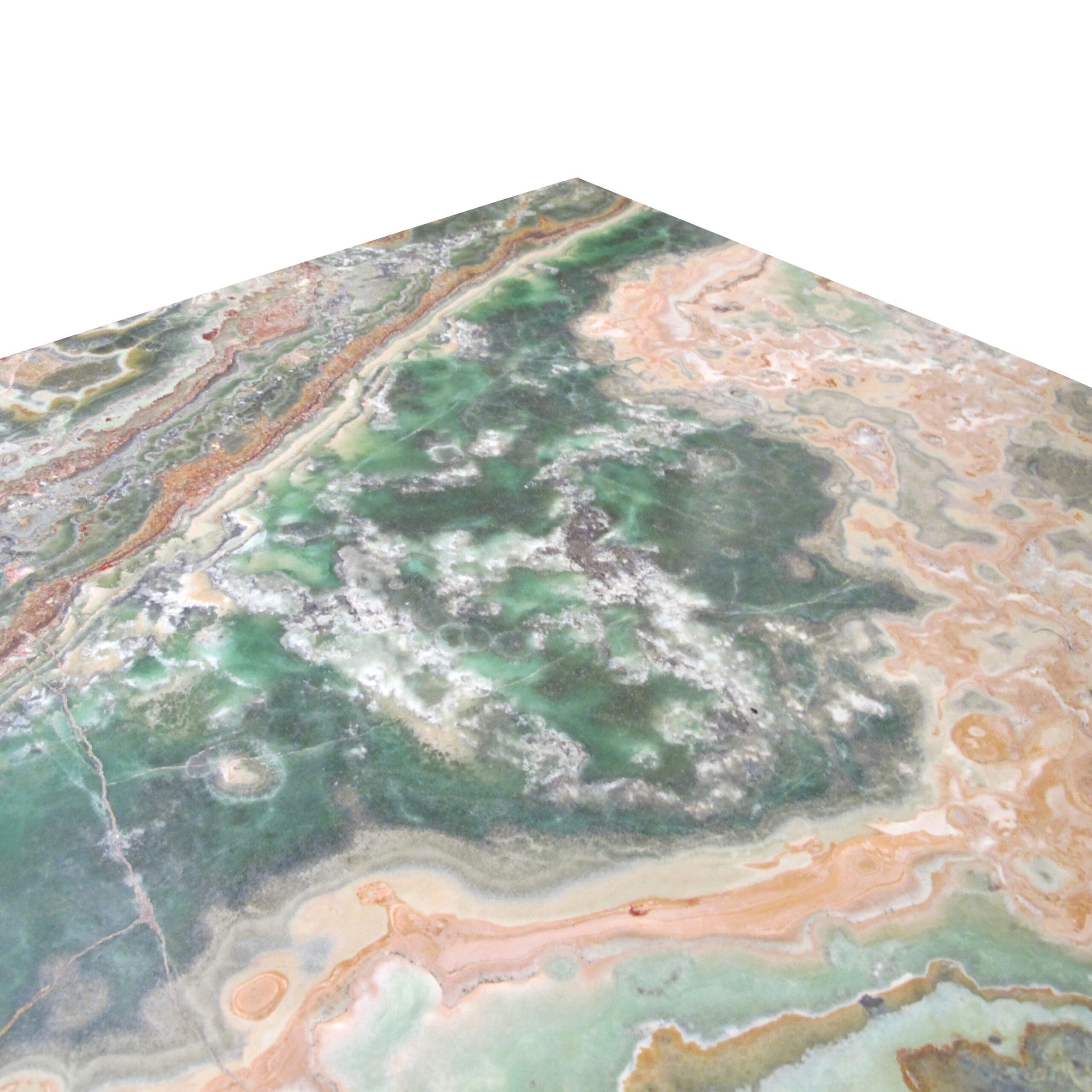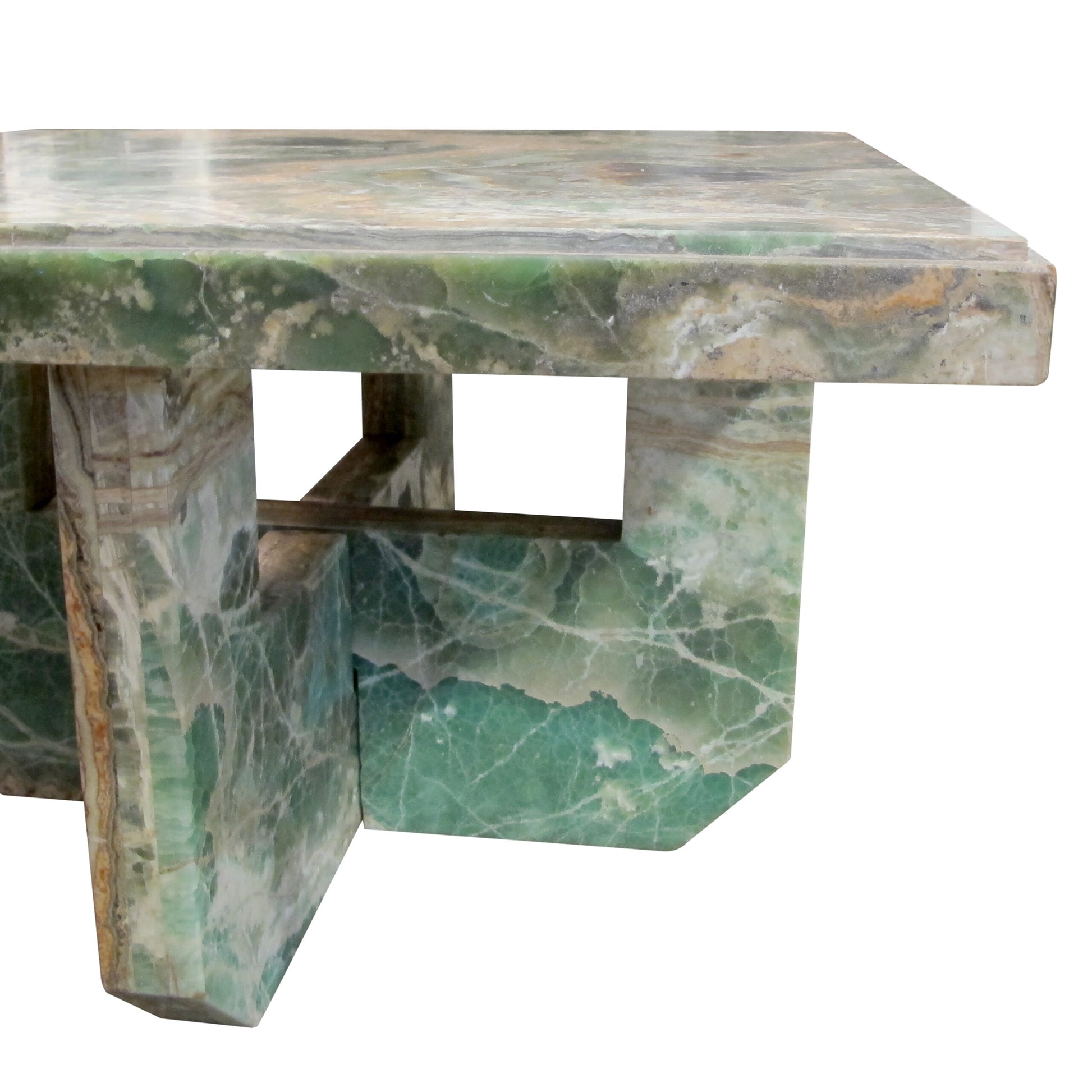 Mid-century Italian square coffee table crafted from green marble. The table features a striking square top with natural, intricate veining in shades of green, white, and hints of brown, giving it an elegant and timeless appeal. The base consists of two intersecting slabs of marble with open spaces between them, providing a visually dynamic and sculptural look.