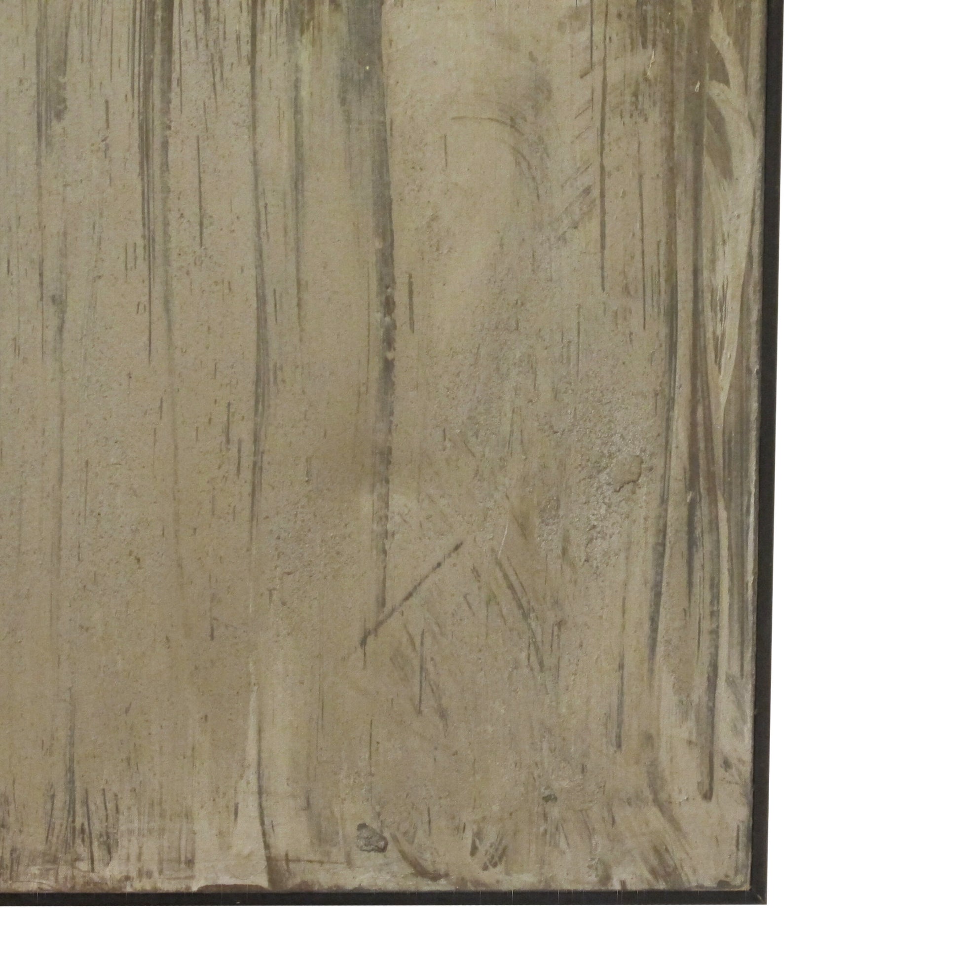 This is a large oil-on-canvas artwork with a distinctly mid-century French aesthetic. The composition emphasises earthy tones, primarily muted greys with subtle textures that create a sense of depth and movement. Accents of ochre, burnt orange, and mustard yellow are concentrated in the upper right corner, adding contrast and warmth to the otherwise subdued palette. The brushwork is expressive yet controlled, with vertical and sweeping gestures that give the piece an abstract, contemplative quality. Not signed.