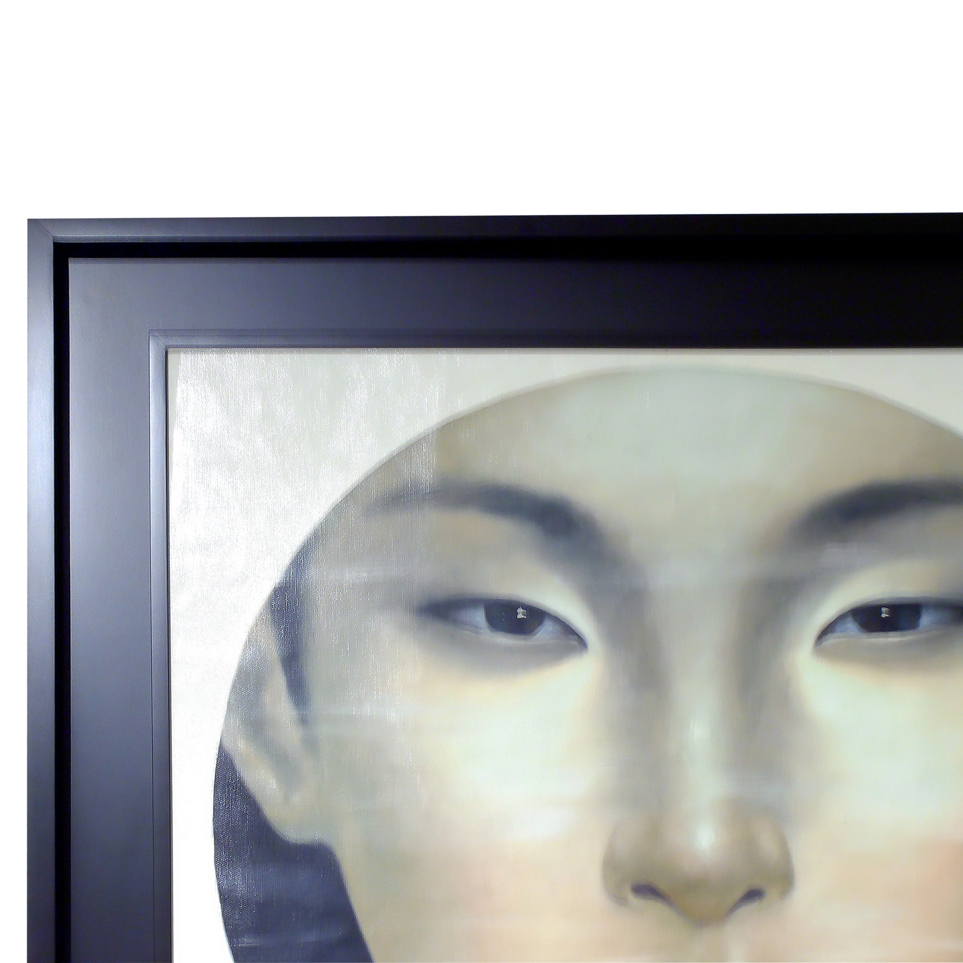 This oil-on-canvas portrait features an Oriental girl, likely from the mid-century period, depicted with a striking blend of realism and abstraction. Her face is softly illuminated, with delicate shading that enhances the serene yet enigmatic expression. The composition is centred around a circular motif that frames her face, adding a sense of balance and harmony to the artwork. Her almond-shaped eyes, subtly arched brows, and softly painted lips create a mesmerizing focal point. The colour palette is muted, with smooth transitions between tones, lending an ethereal quality to the portrait. Recently double-framed, the artwork now sits within two layers of framing an inner sleek border that enhances the contrast of the painting and an outer, more substantial frame that gives it a contemporary and sophisticated presentation.