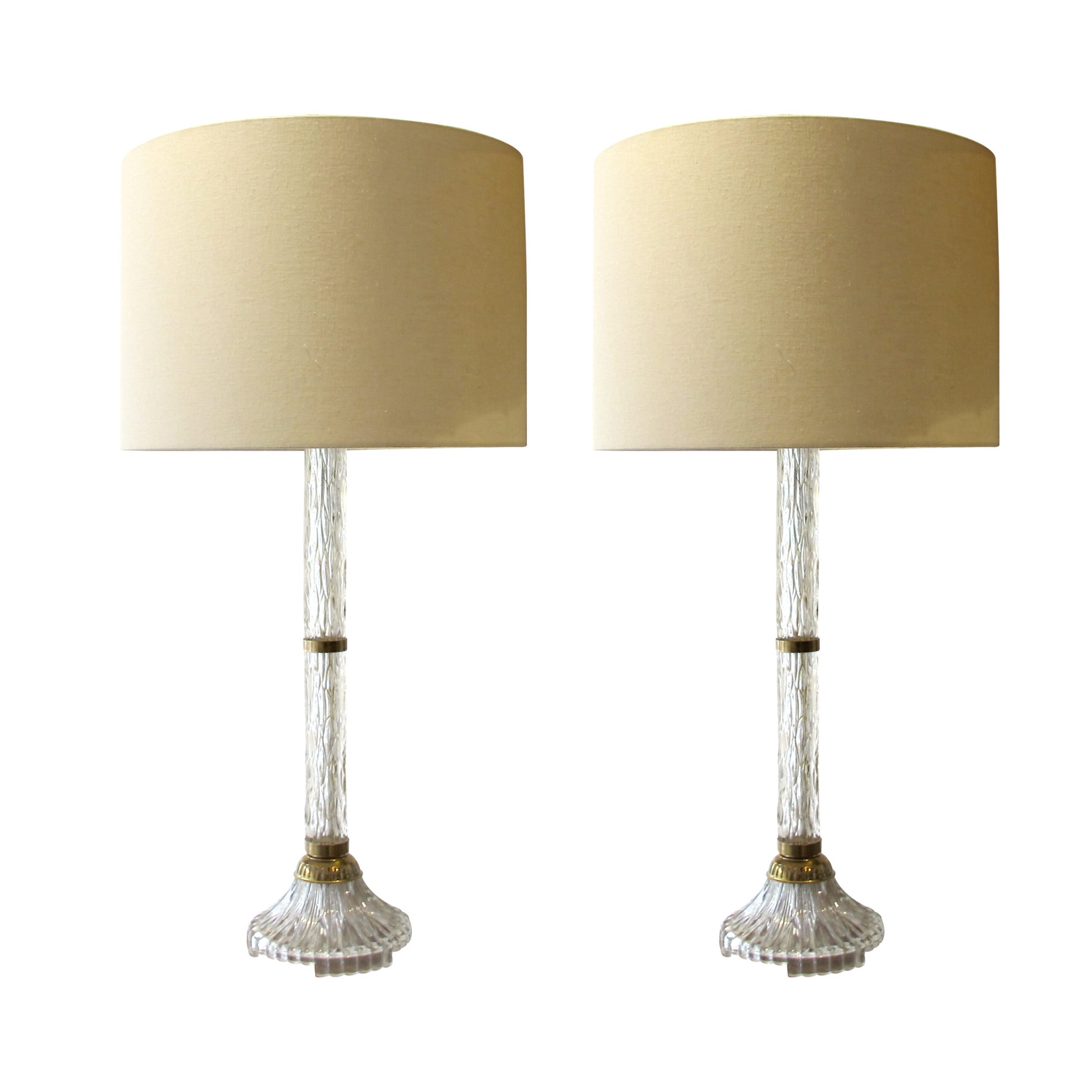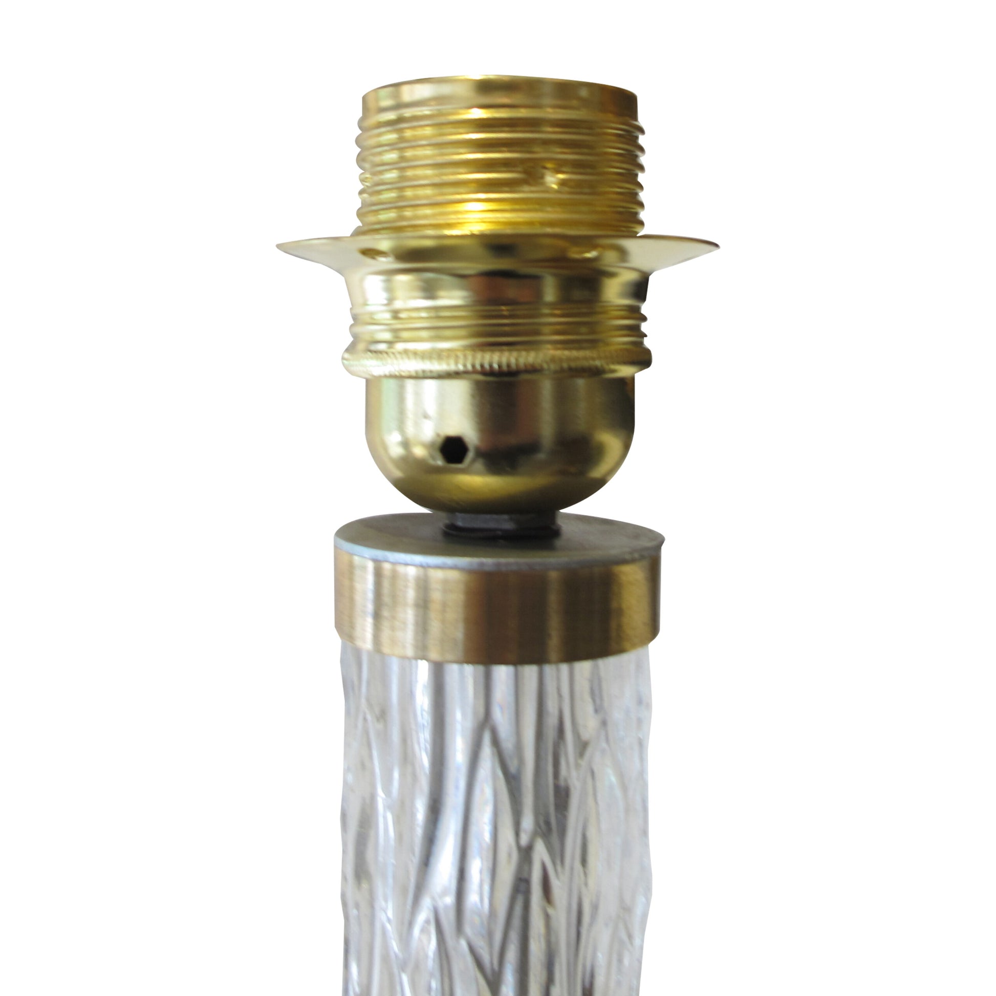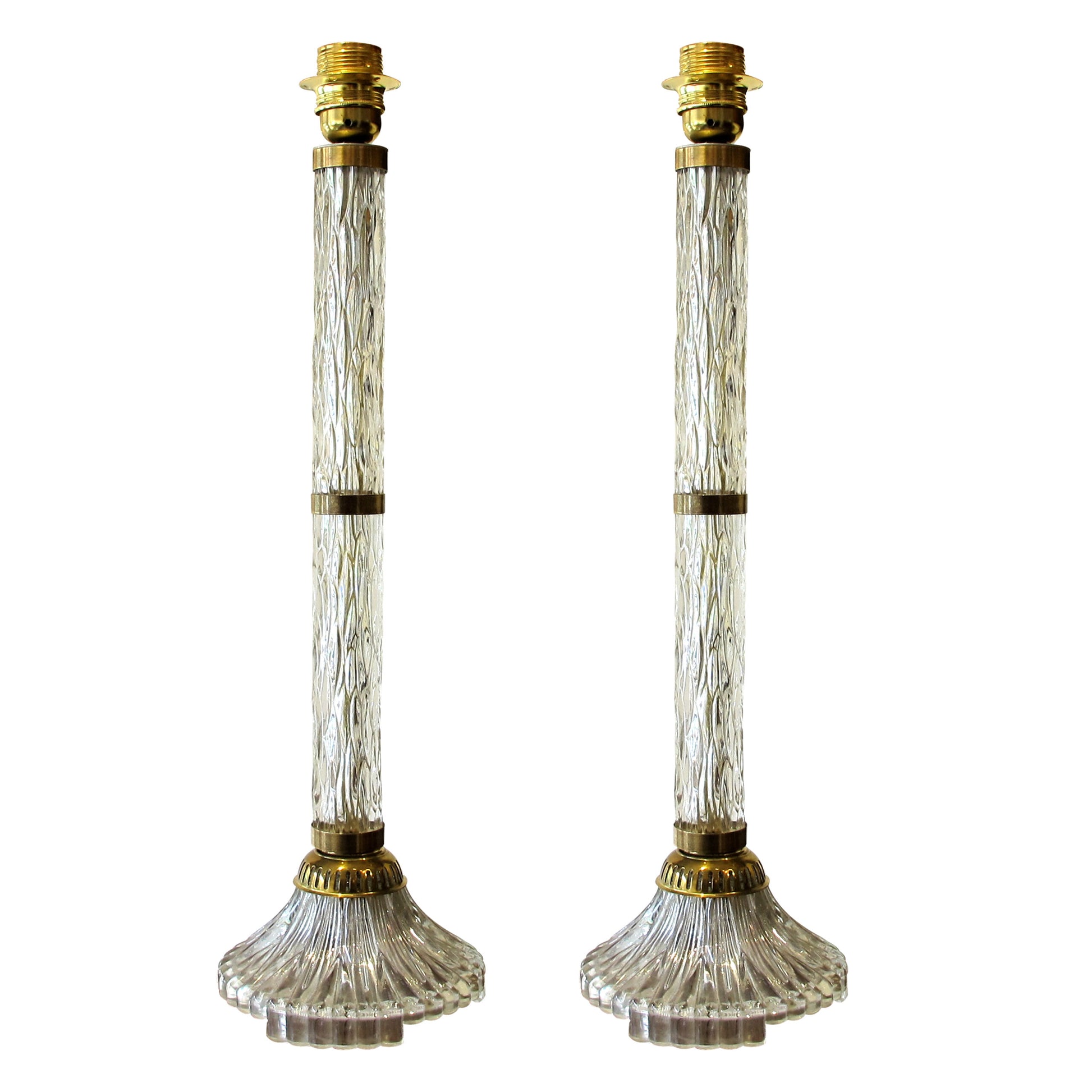 1960s German, elegant pair of glass table lamps with a brass accent at the base of the lamps and at the centre of the columns and featuring a structured glass. The lamps have been rewired to the UK standard with an inline switch and E27 large screw bulb fitting.