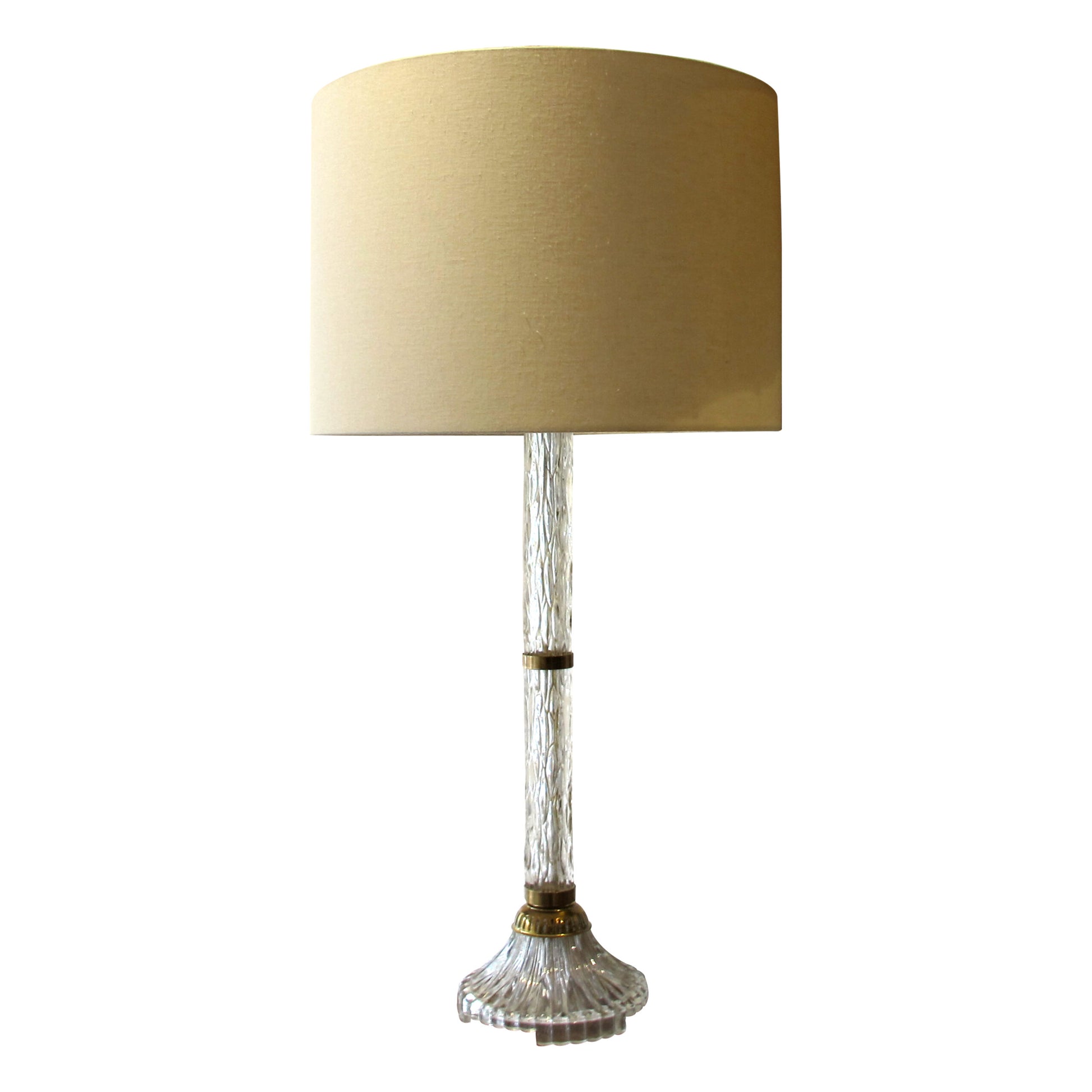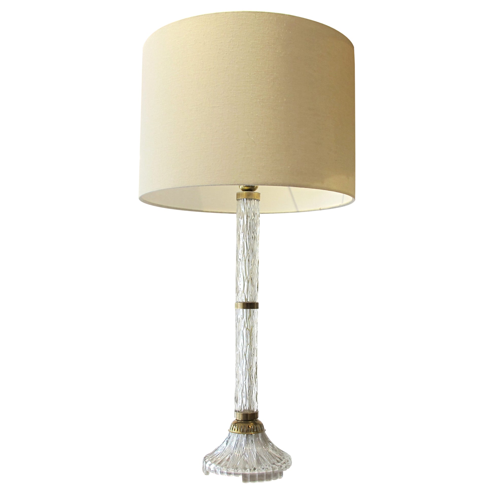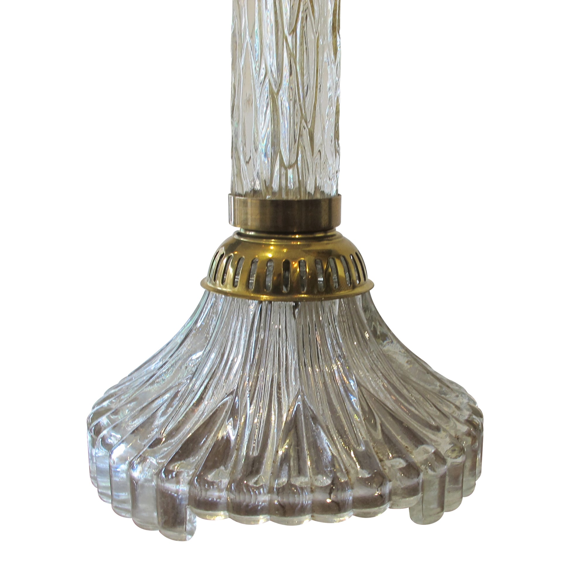 1960s German, elegant pair of glass table lamps with a brass accent at the base of the lamps and at the centre of the columns and featuring a structured glass. The lamps have been rewired to the UK standard with an inline switch and E27 large screw bulb fitting.