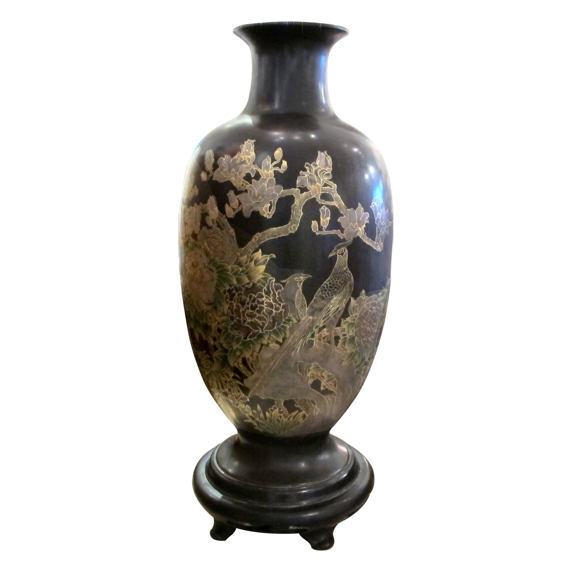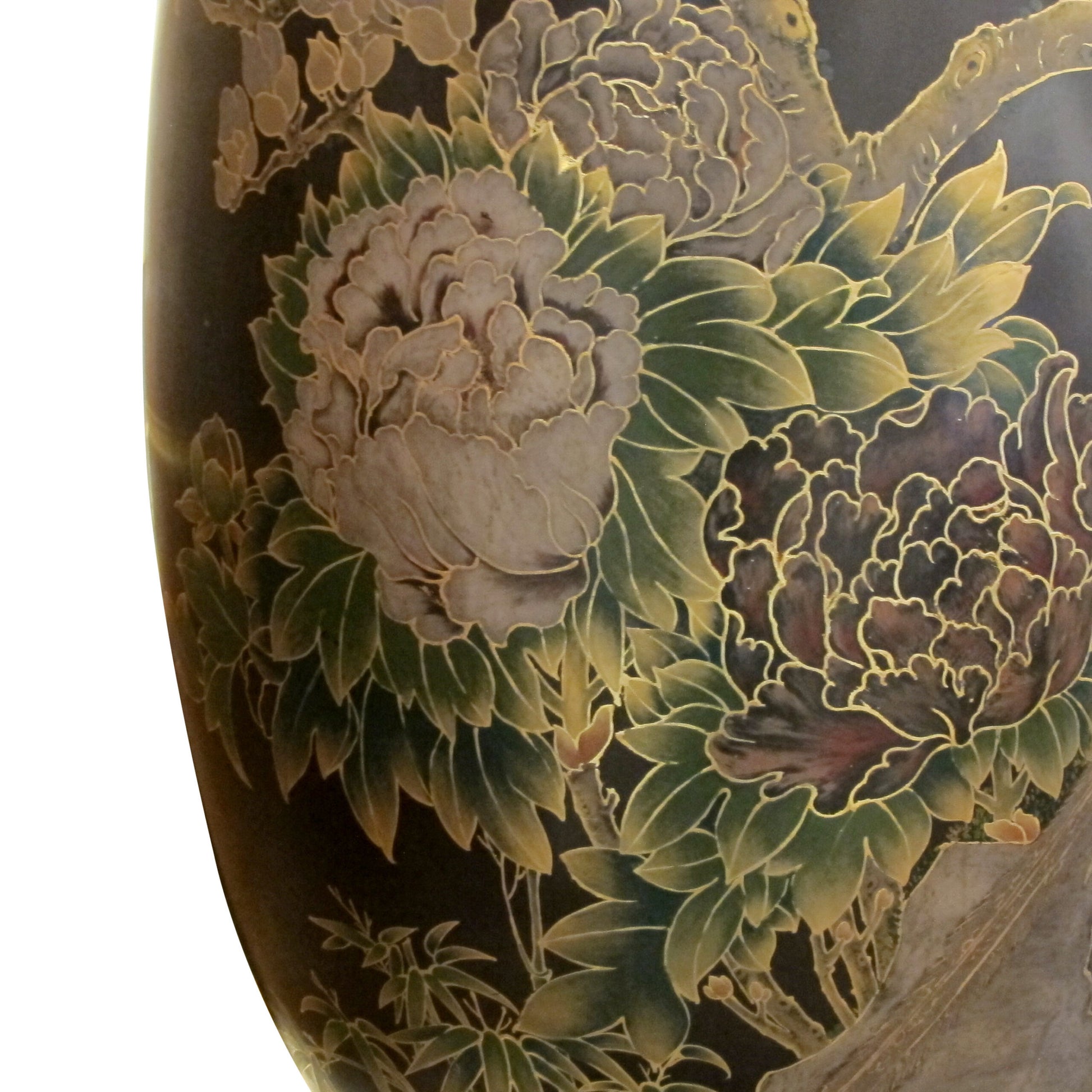 Pair of oversized Chinese vases crafted from papier-mâché, featuring elegant reliefs of pheasants and floral motifs. The vases display a classic, mid-century style, with intricate details in the birds and flowers, possibly peonies, set against a dark background. The artwork is delicately painted in muted tones with touches of gold and green, emphasising the scene’s natural beauty, handmade during the early 20th-century Chinese export period. Each vase is mounted on a round wooden base enhancing the traditional aesthetic.