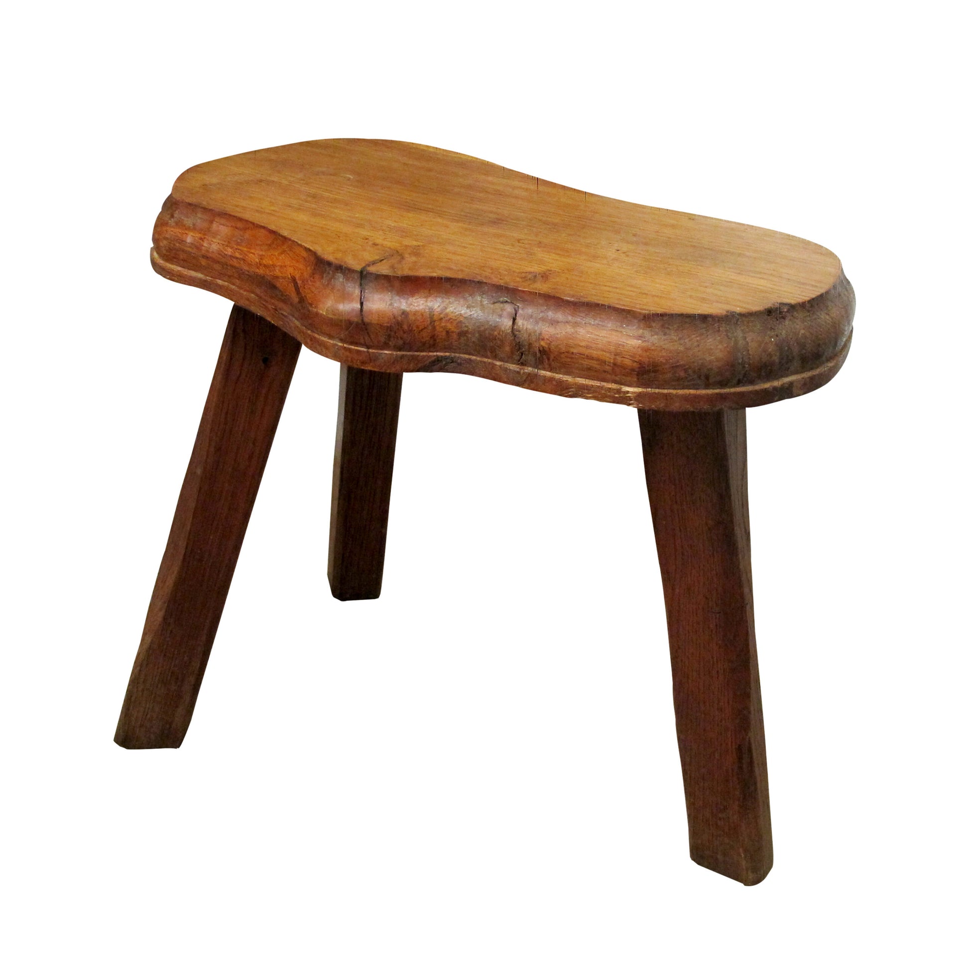 French set of four oak milking stools from the 1940s/50s, hand-carved in a rustic style. The stools feature sturdy, thick legs made from solid oak and irregularly shaped seats that retain a natural, organic appearance. The craftsmanship highlights the grain and texture of the wood, emphasising its handmade quality.