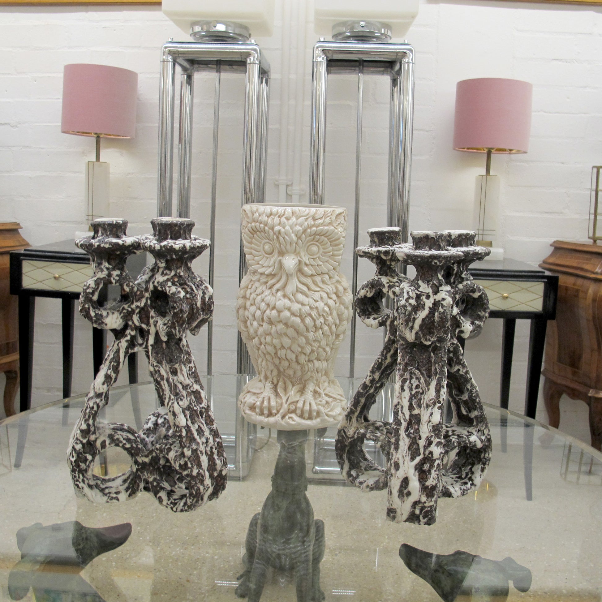 This is a pair of collectable French fat lava ceramic candlesticks from the 1950s, made in Vallauris by Marius Giuge. Each piece features a sculptural, textured design with a bold, organic form typical of the mid-century style from the region. The dark glaze with white accents gives them a striking contrast and a handmade feel. Vallauris is a village in the south of France which was greatly influence by Picasso whom established a workshop in that village. Each candlestick is stamped.