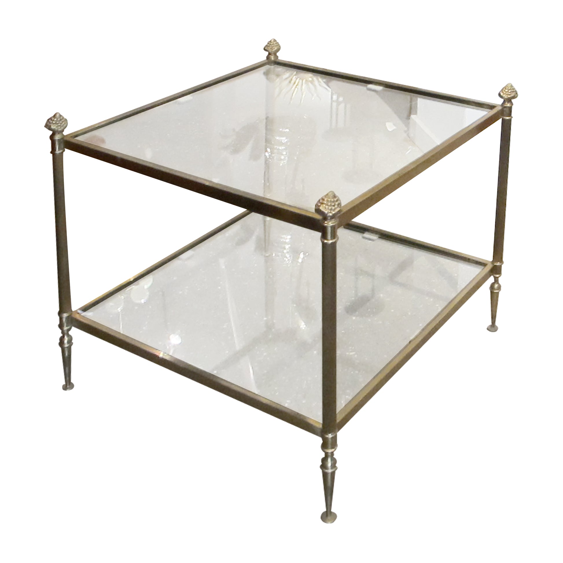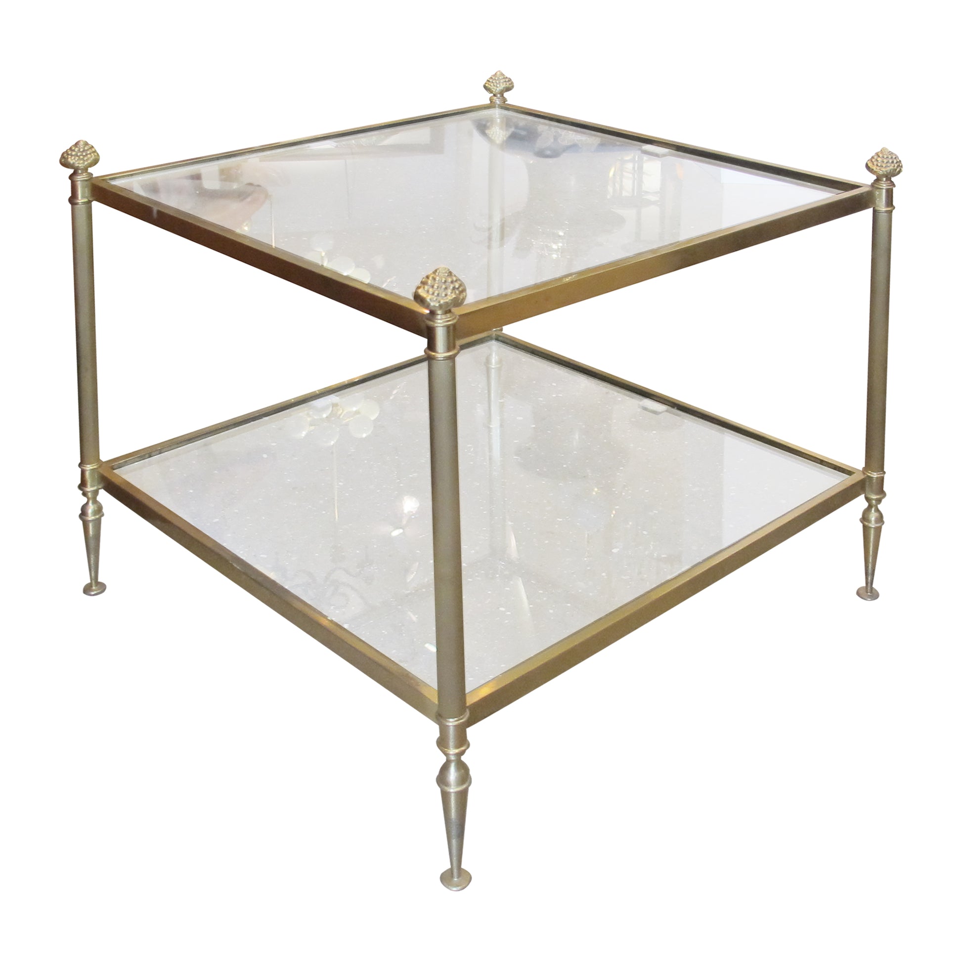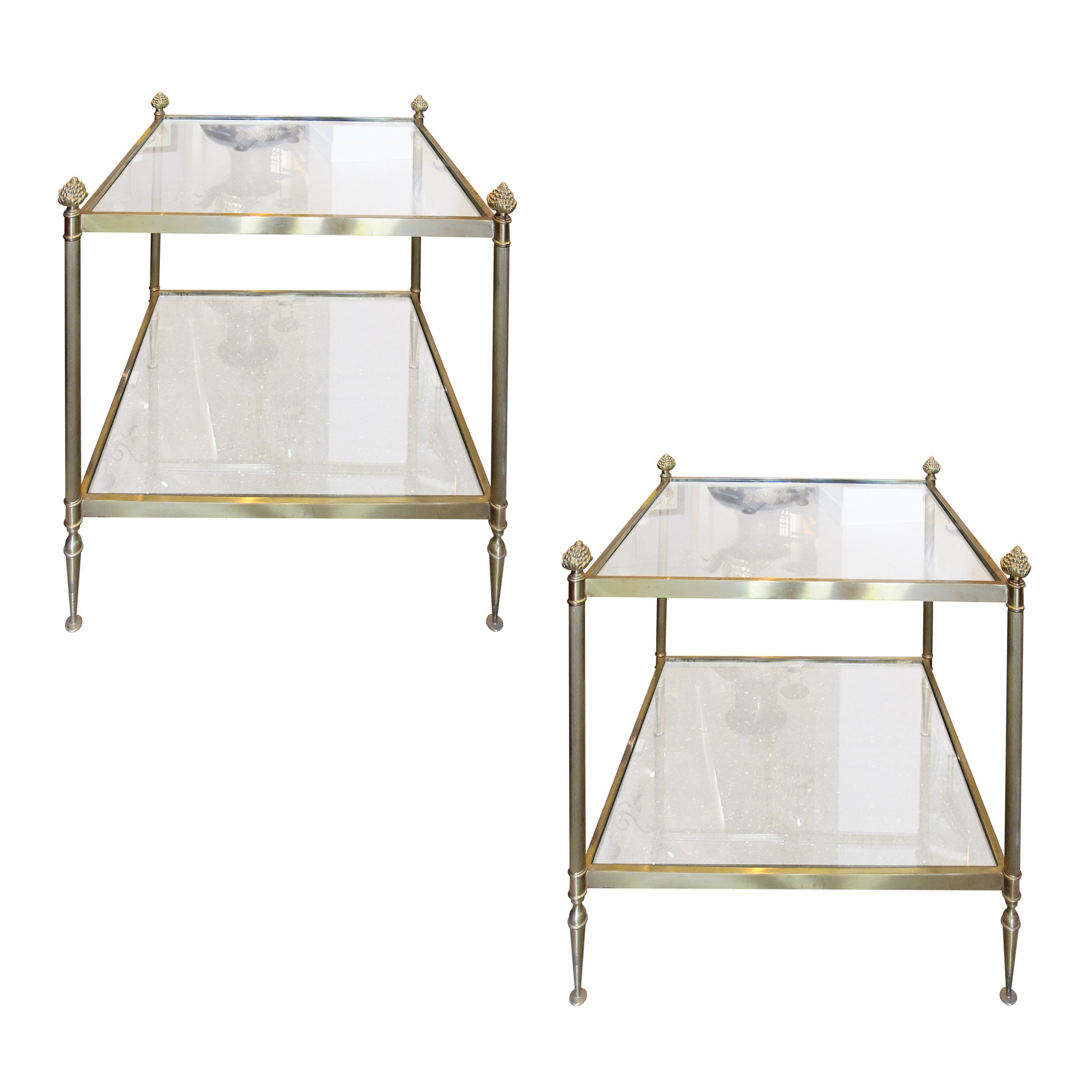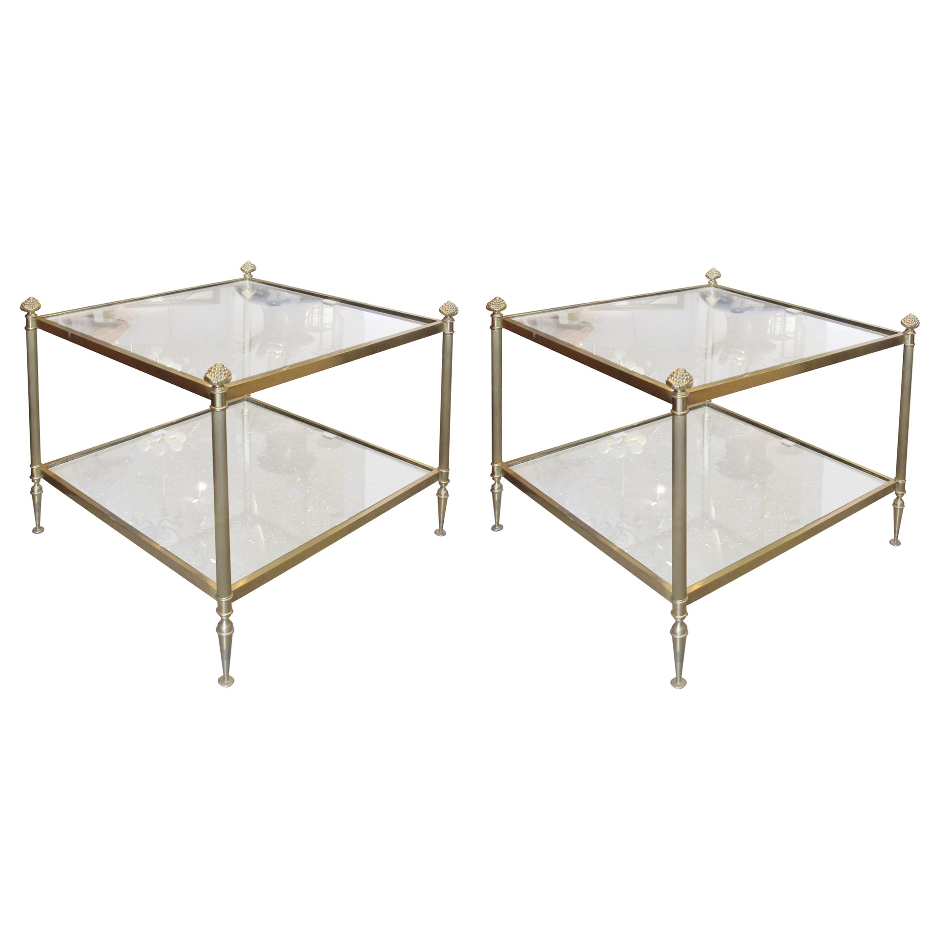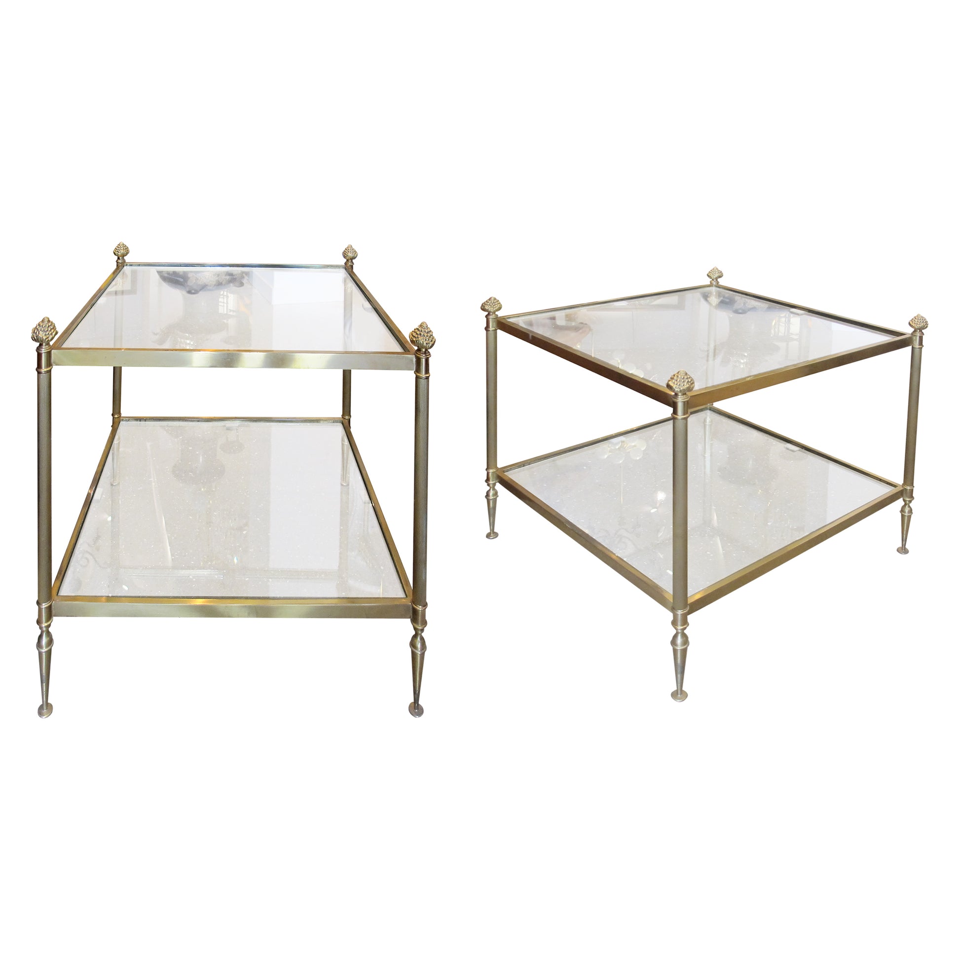 Elegant pair of mid-century French side tables in the style of Maison Bagues featuring brass frames with refined neoclassical details. Each table is designed with two tiers of glass shelving, supported by slender fluted legs capped with decorative finials in the form of stylised pinecones.