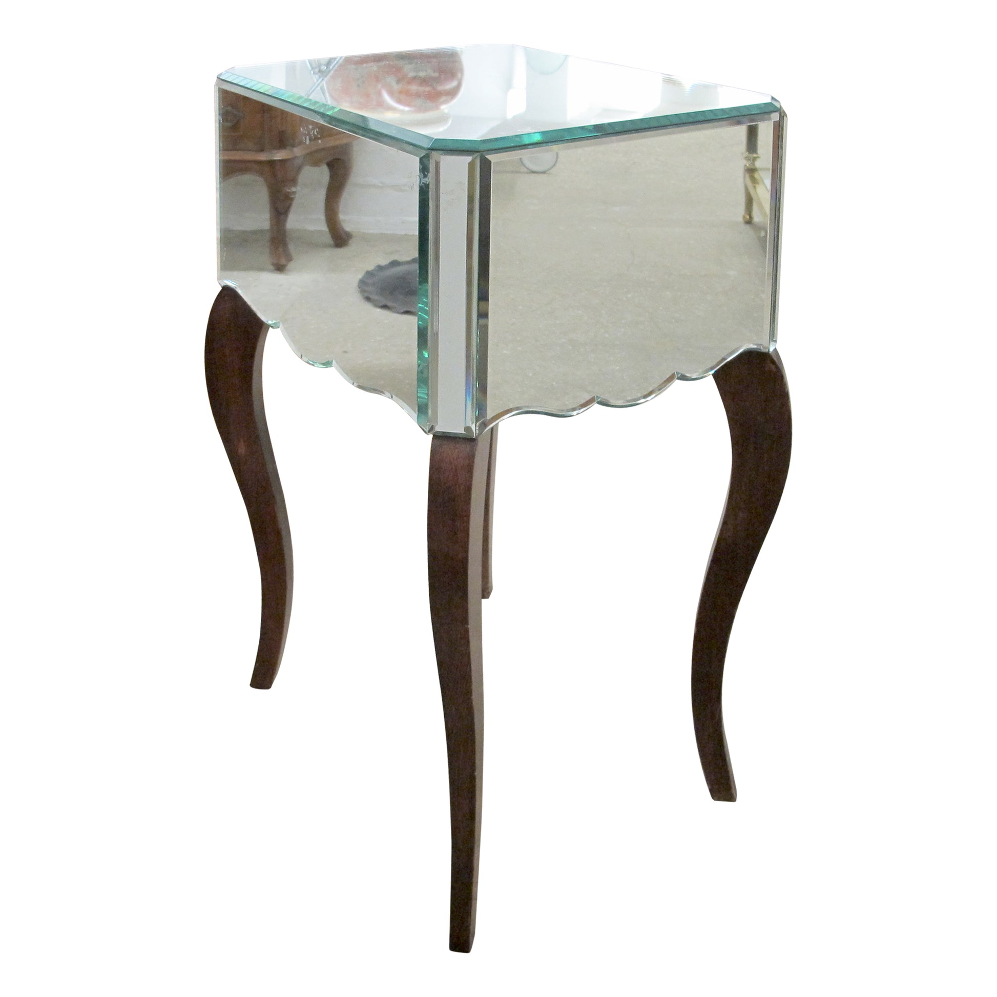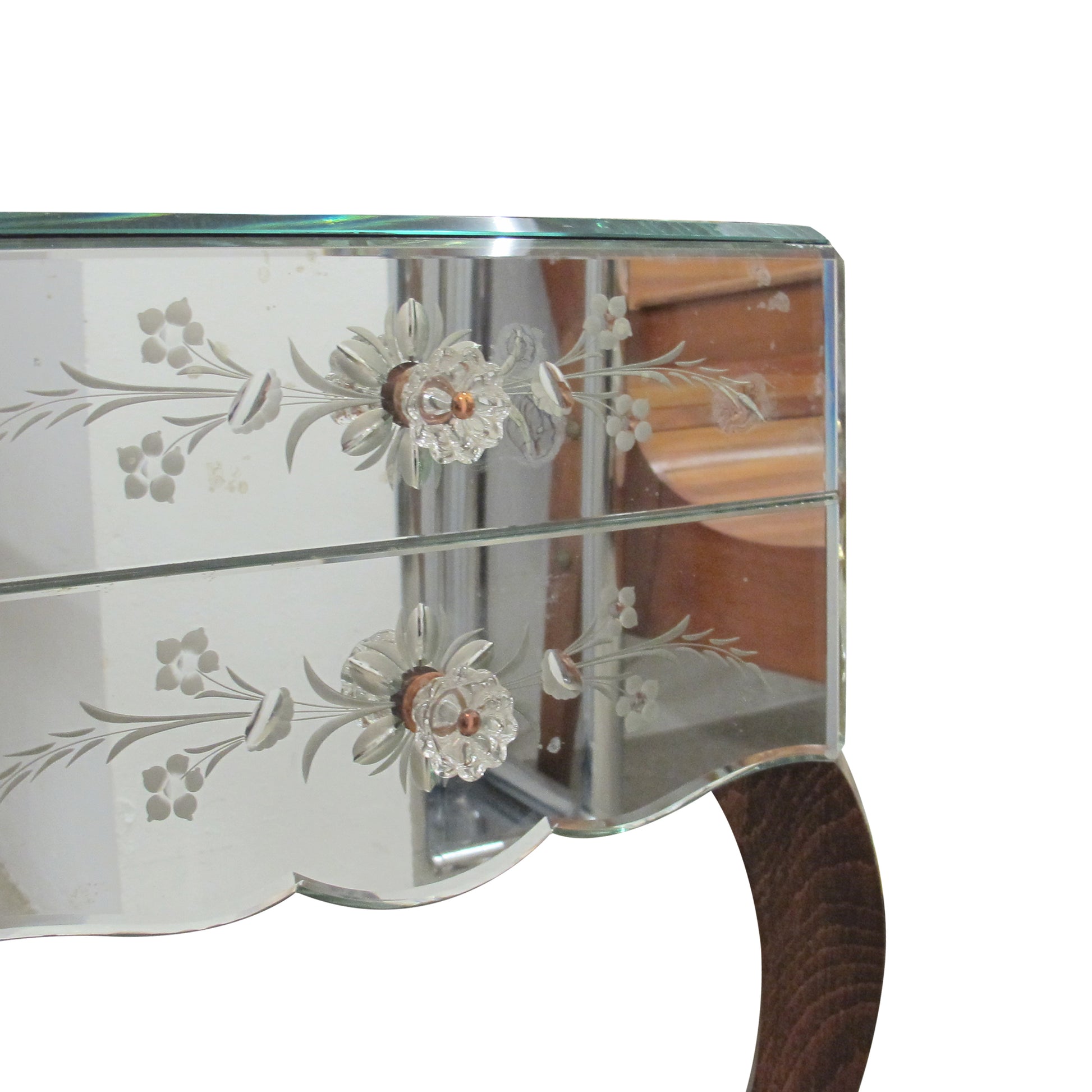 A pair of French bedside tables from the 1950s, with mirrored glass panels showing light age-related foxing. Each table has two drawers with simple floral detailing. They stand on curved wooden legs with a warm finish, giving a light, slightly elevated look. The fronts have a subtle scalloped edge, typical of mid-century French design. Compact and functional, they work well as bedside or side tables, adding a clean vintage touch without feeling overly decorative. The mirrors show signs of foxing commensurate with age.