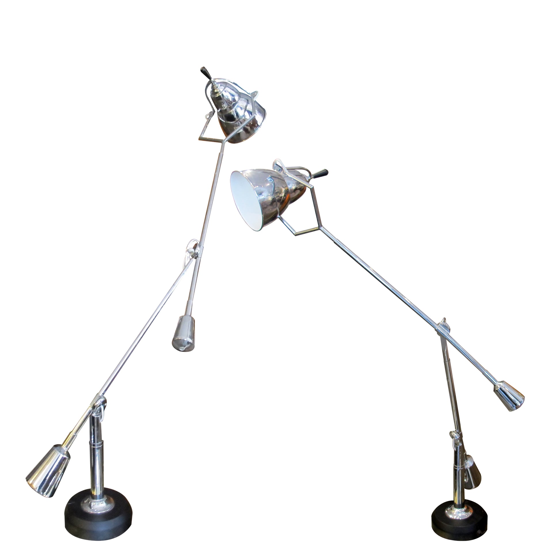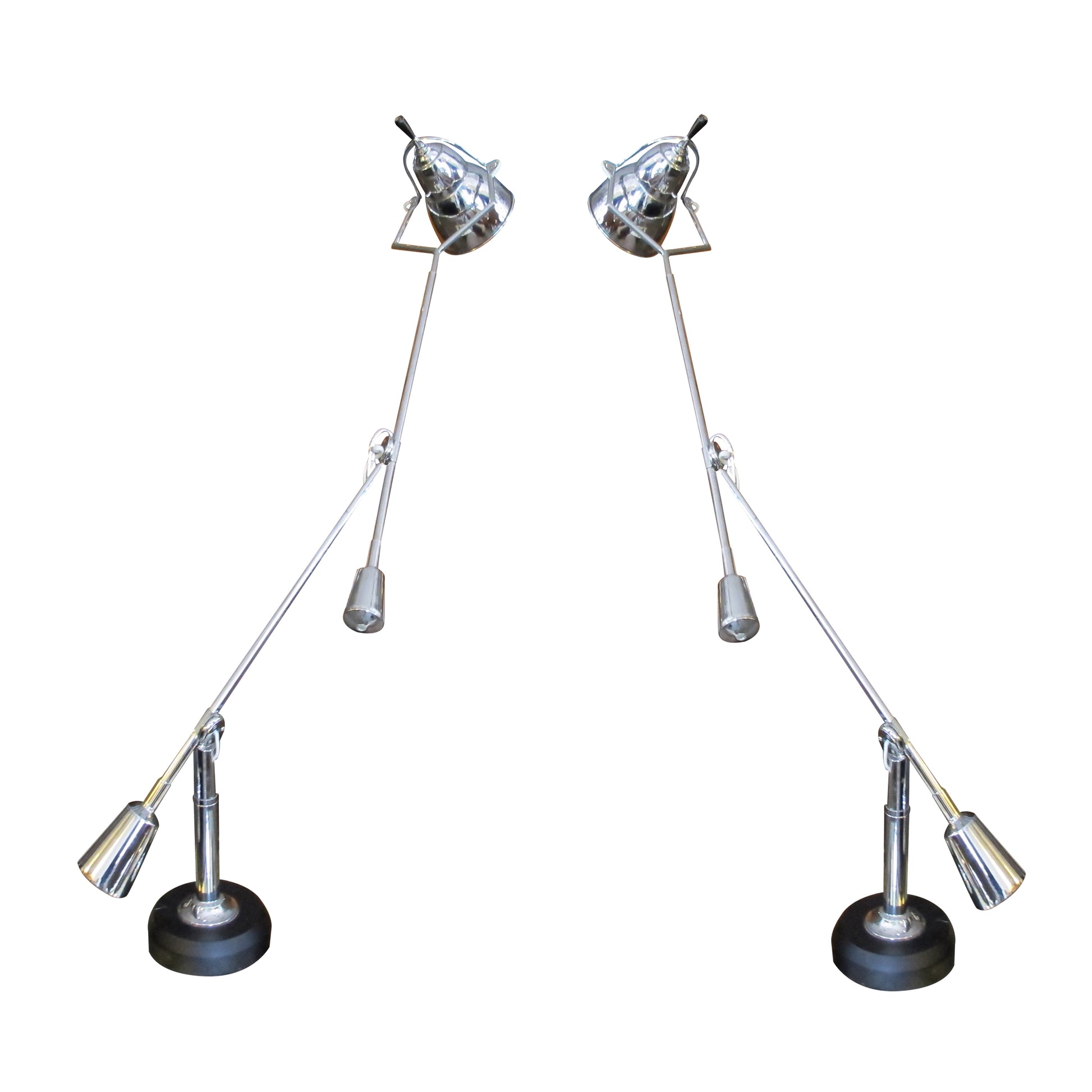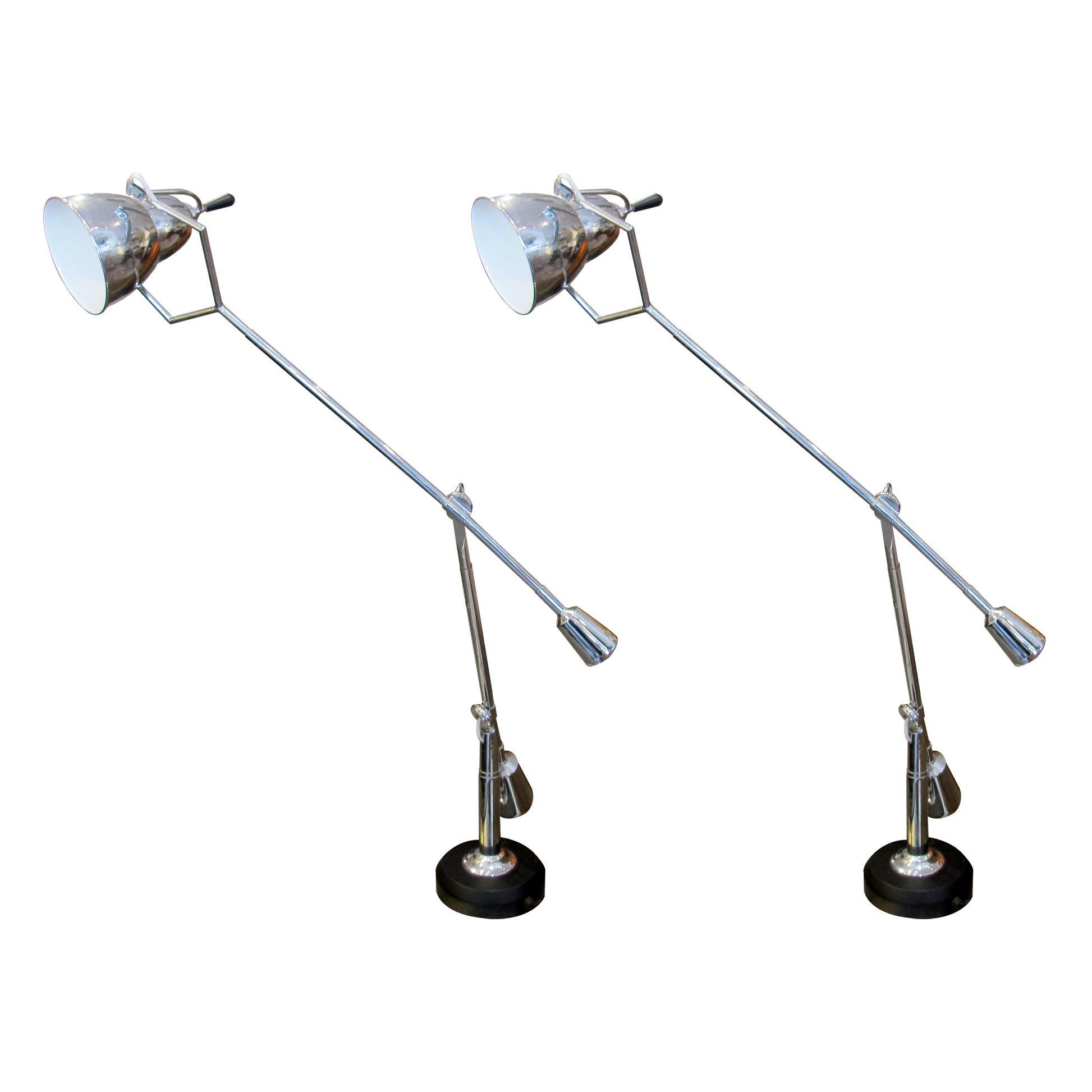 Inspired by the iconic designs of Édouard-Wilfred Buquet, this striking pair of Italian desk lamps is a faithful re-edition from the late 1970s. Featuring a sculptural double-arm configuration, each lamp is finely crafted in chrome-finished metal and features fully adjustable arms that pivot with remarkable precision. The counterweight balance system ensures optimal positioning and seamless movement, offering both functionality and elegance.