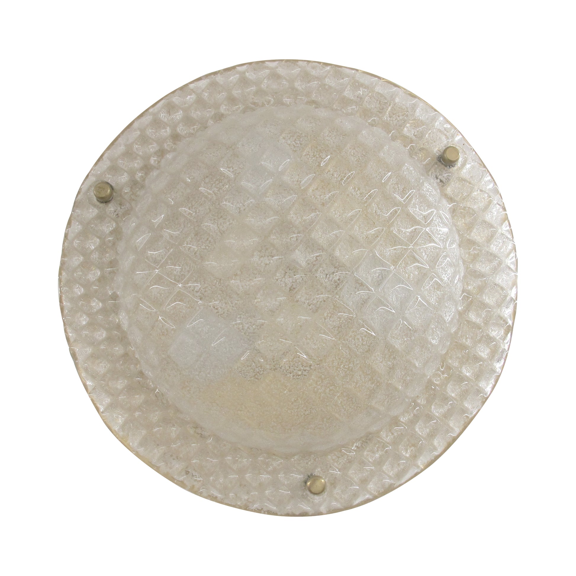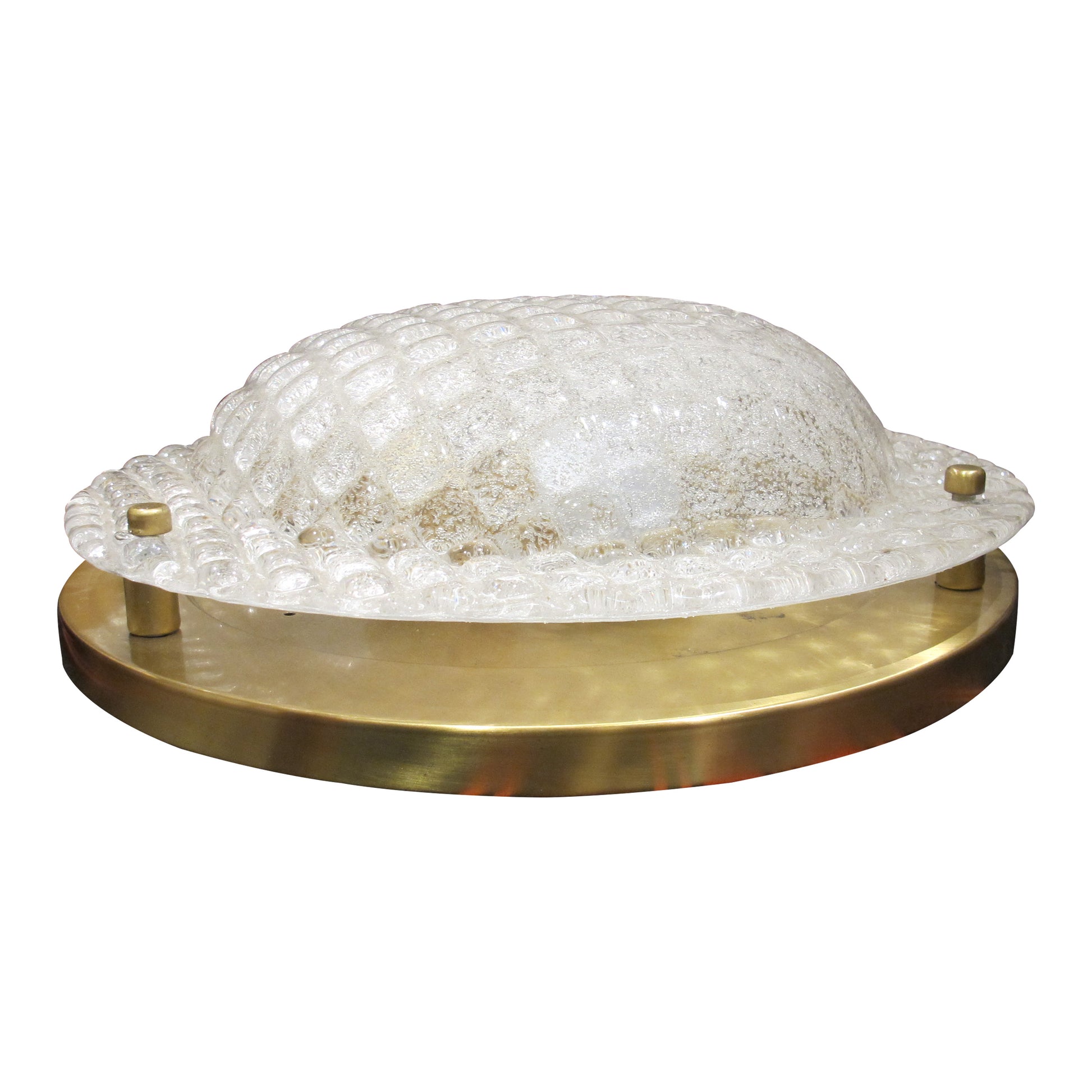 Elegant pair of wall or ceiling lights from Germany, dating to the 1970s. Each fixture features a textured, dome-shaped glass shade with a diamond pattern that softly diffuses the light, creating a warm and inviting glow. The glass is mounted on a circular brass base, secured with matching brass fittings, combining subtle luxury with timeless mid-century design.