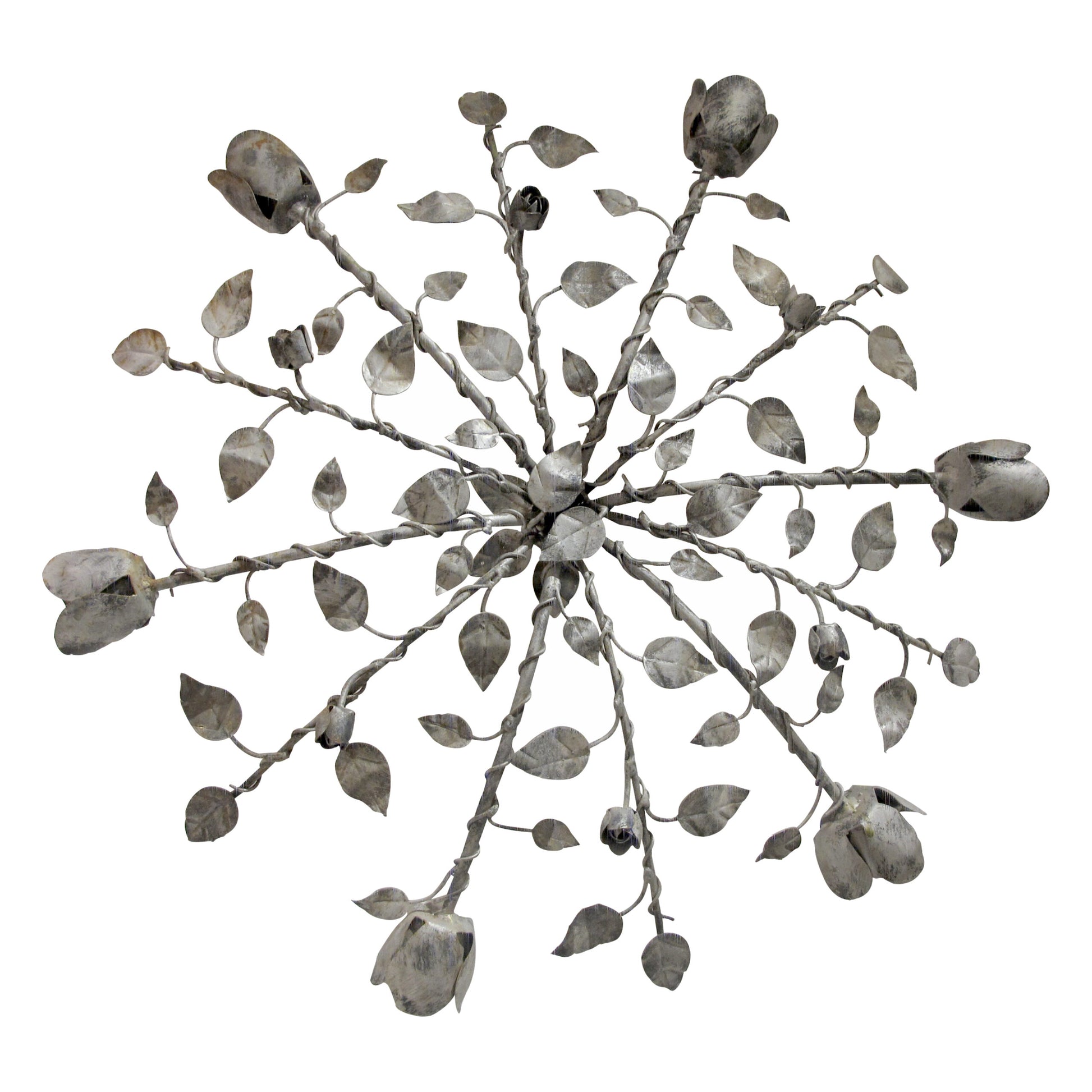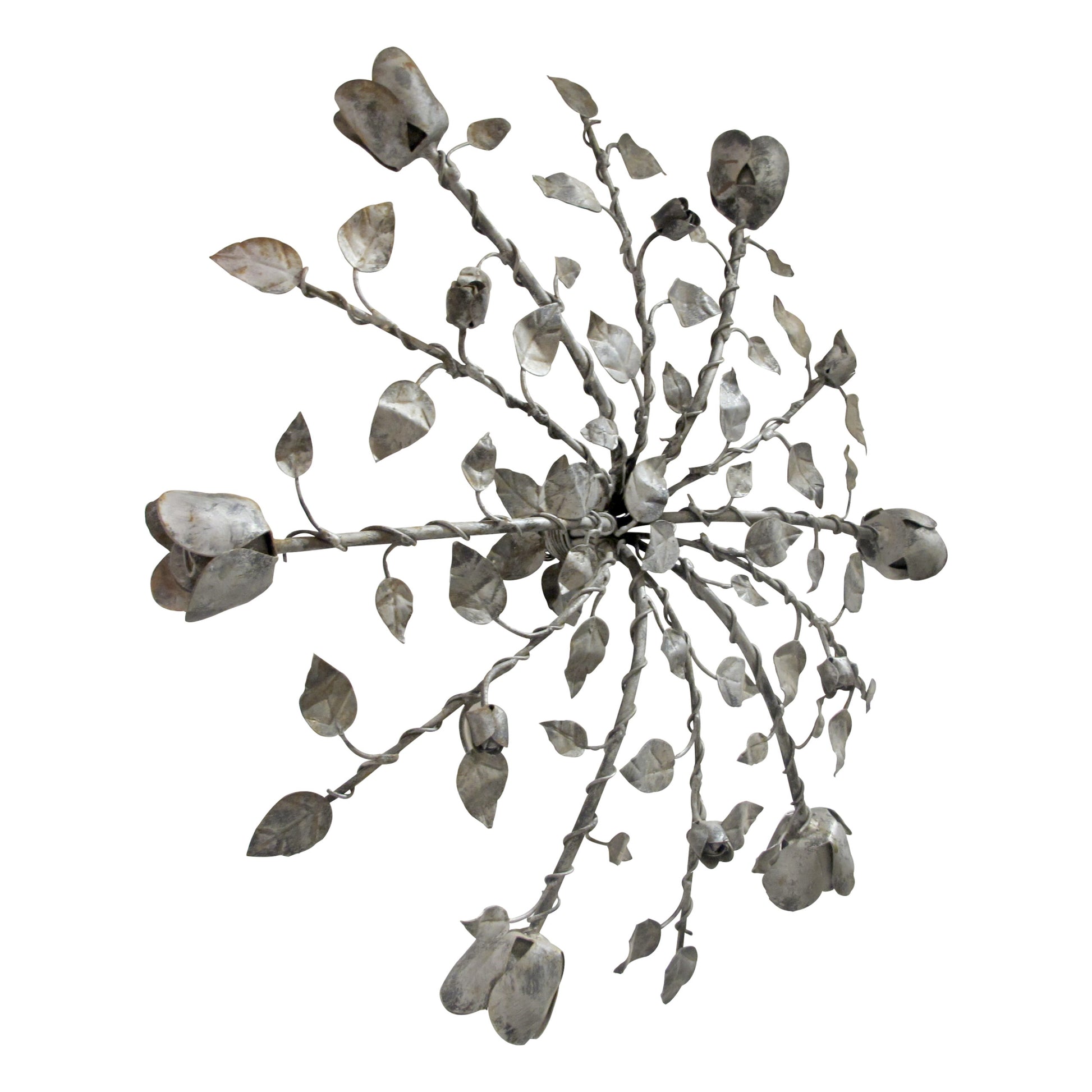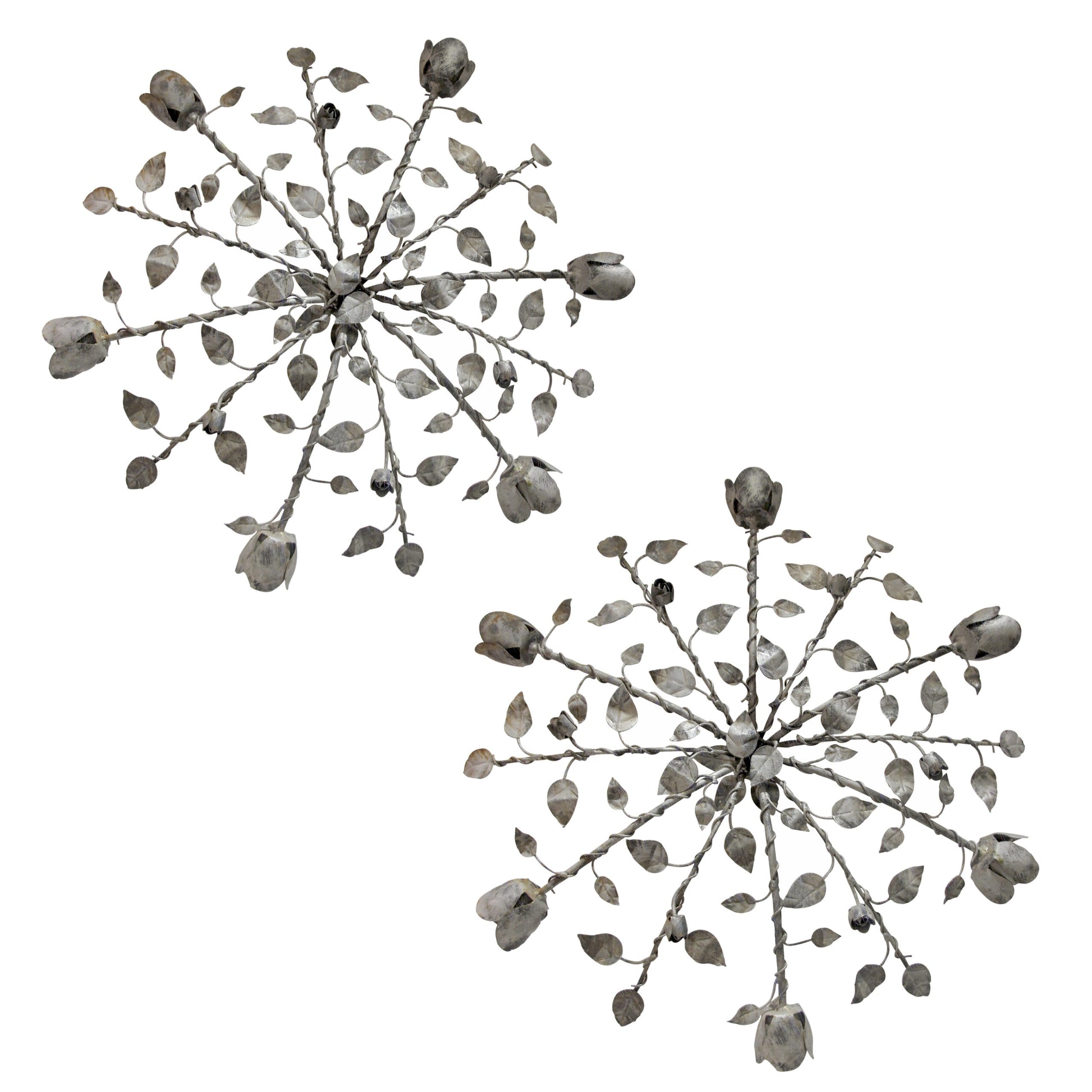 Pair of Large Silver-Painted Iron Floral Plafonniers / Wall Lights, Spanish 1950s