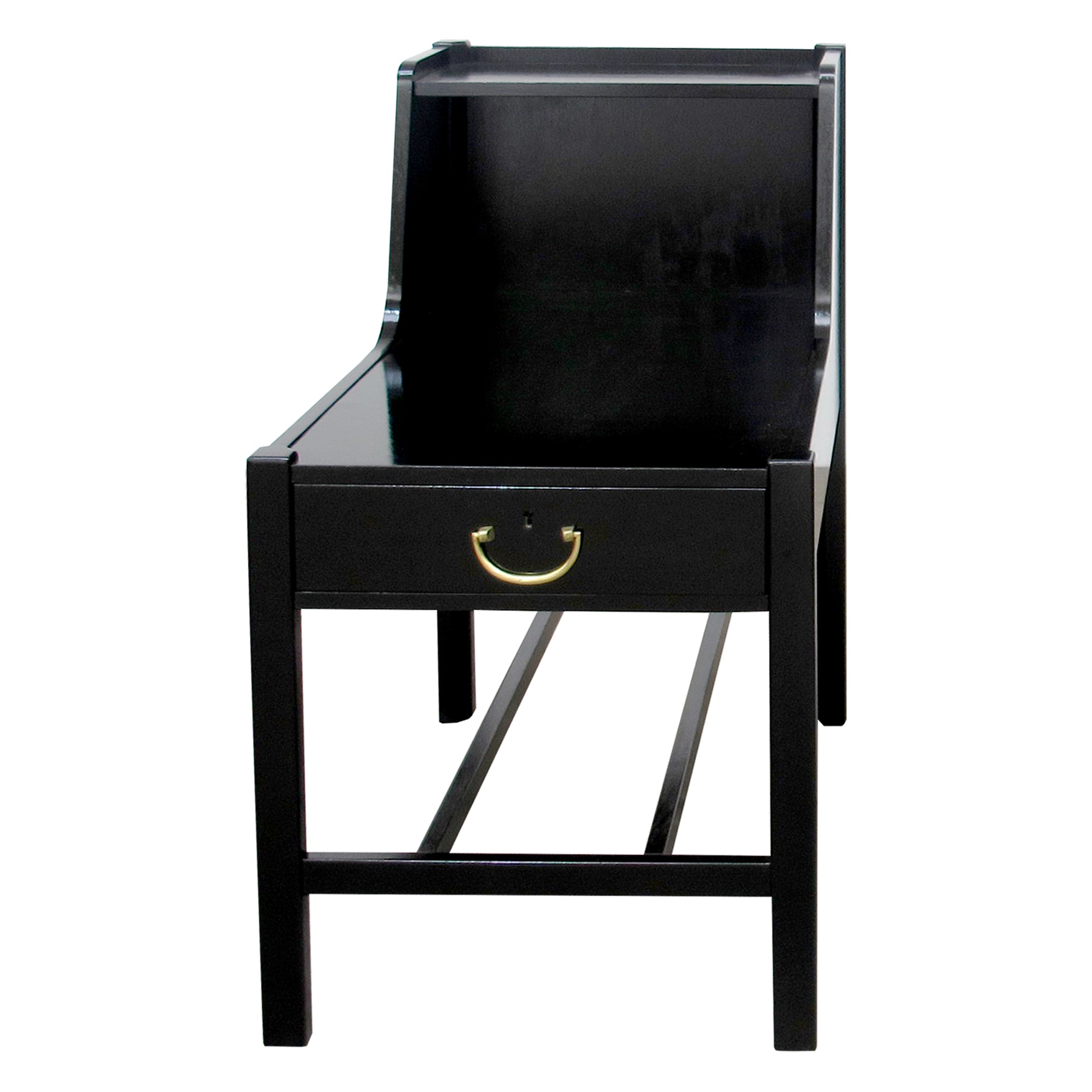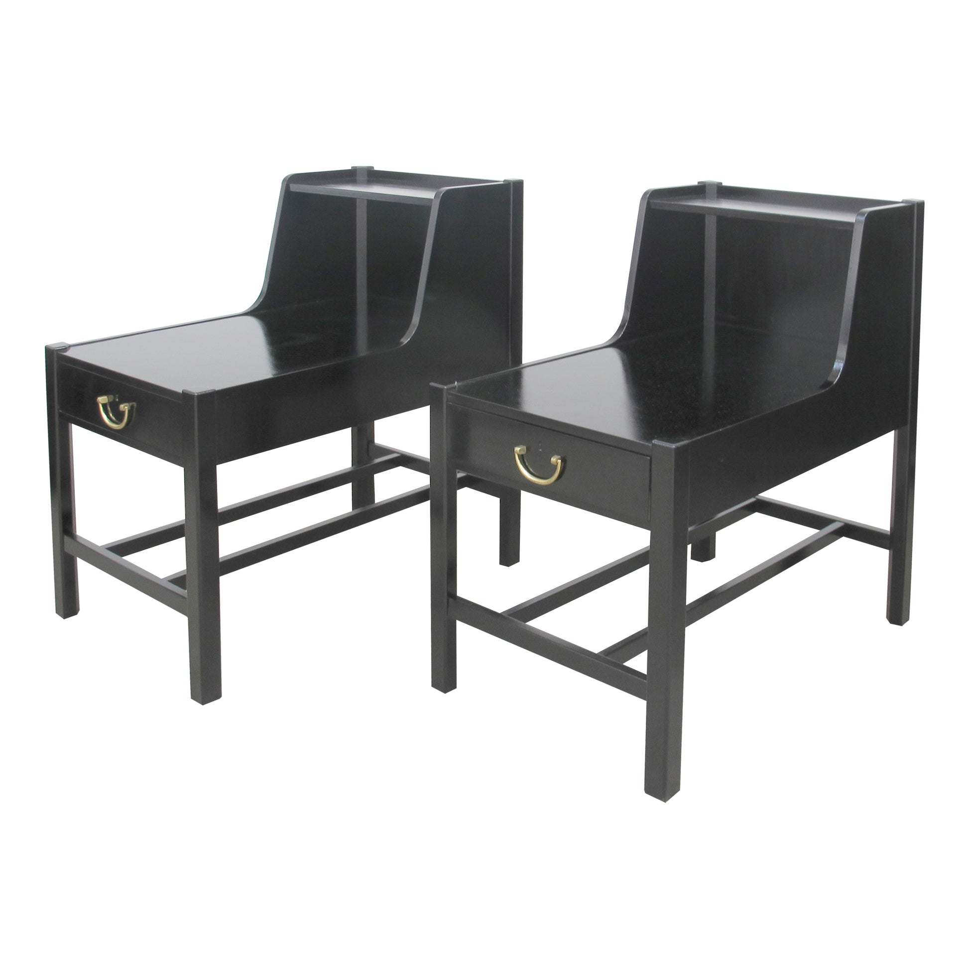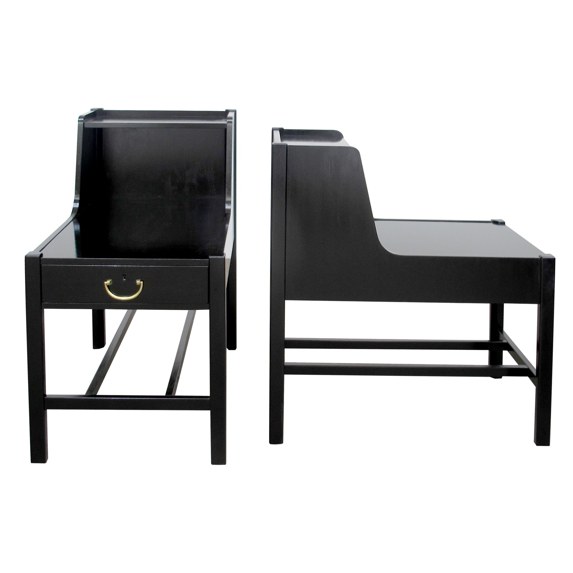 Elegant pair of Swedish bedside tables from the 1950s, showcasing the restrained functionality and clean lines characteristic of Scandinavian mid-century design. Each table has been polished to a black finish in recent years. Both tables feature a single front drawer with its original brass drop handle, providing convenient storage while maintaining the minimalist aesthetic. Versatile in use, these tables work beautifully as bedside tables, sofa side tables, or occasional pieces. Their understated elegance and well-balanced proportions make them an excellent fit for both modern and traditional interiors.