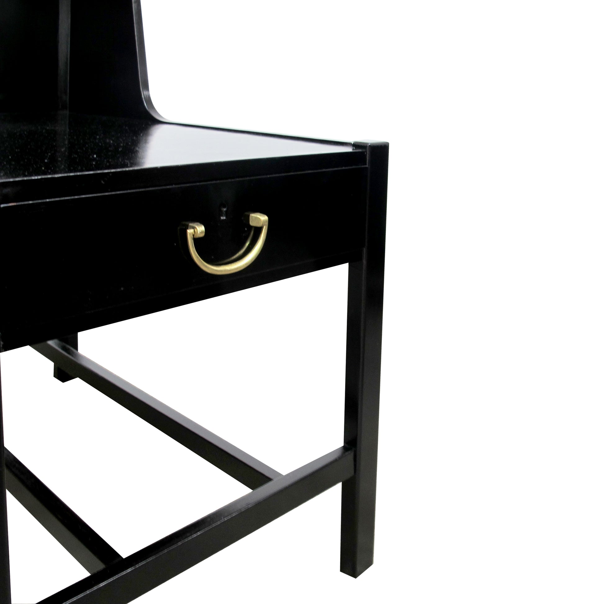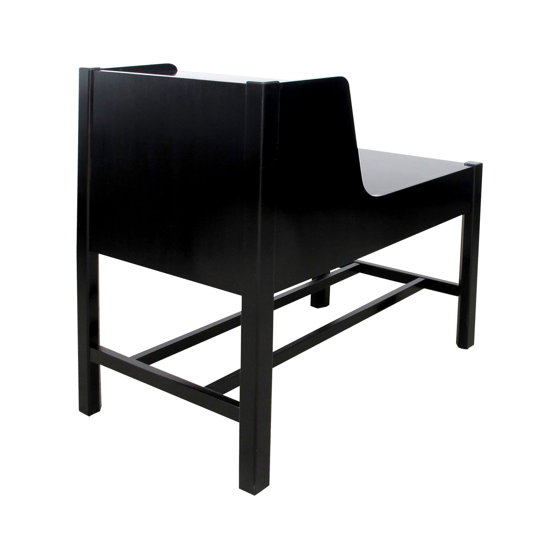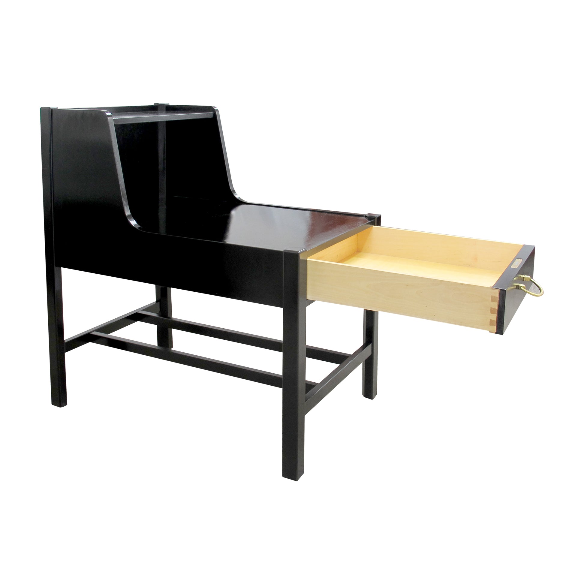 Elegant pair of Swedish bedside tables from the 1950s, showcasing the restrained functionality and clean lines characteristic of Scandinavian mid-century design. Each table has been polished to a black finish in recent years. Both tables feature a single front drawer with its original brass drop handle, providing convenient storage while maintaining the minimalist aesthetic. Versatile in use, these tables work beautifully as bedside tables, sofa side tables, or occasional pieces. Their understated elegance and well-balanced proportions make them an excellent fit for both modern and traditional interiors.