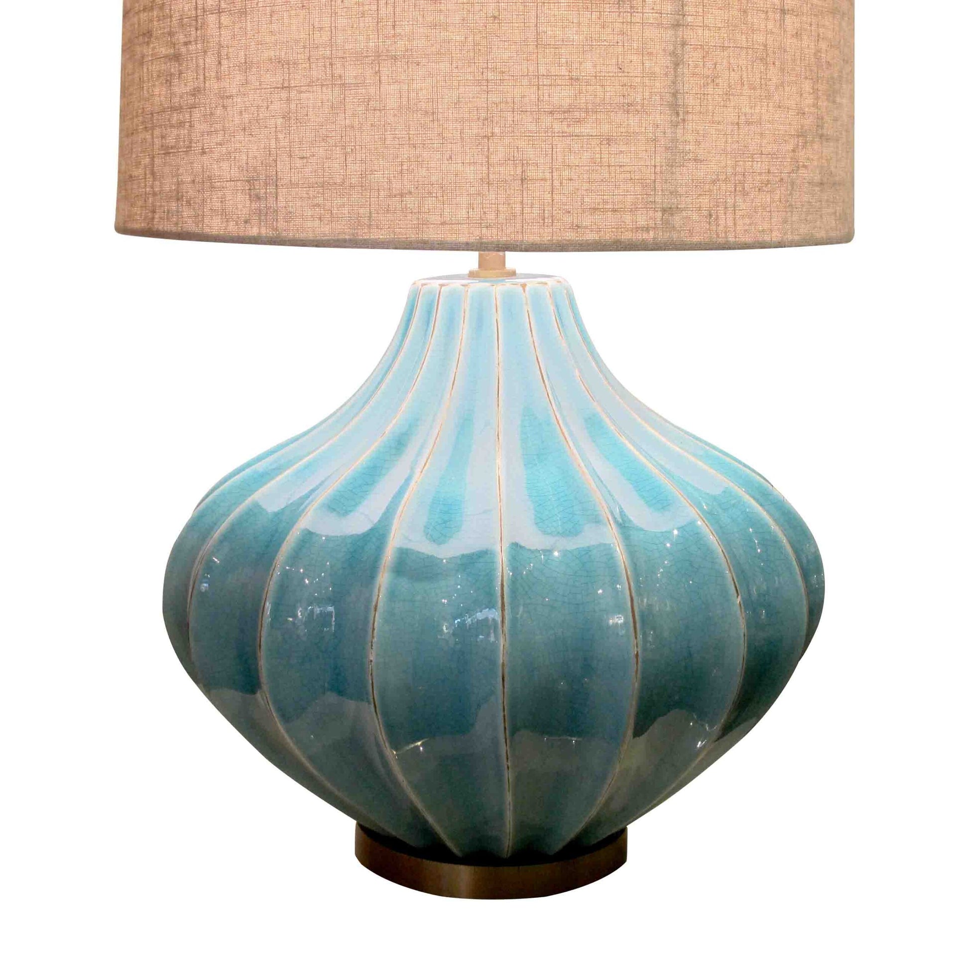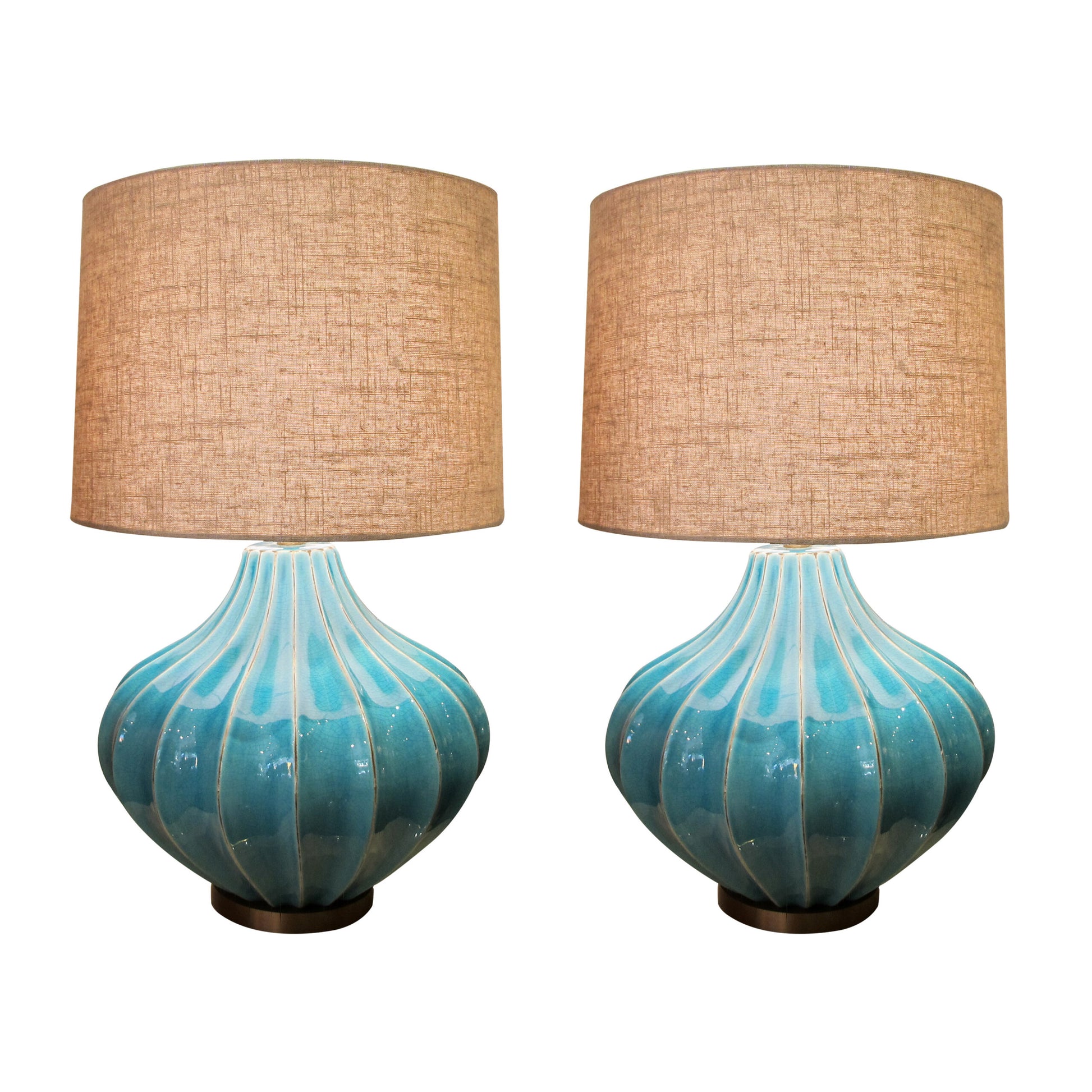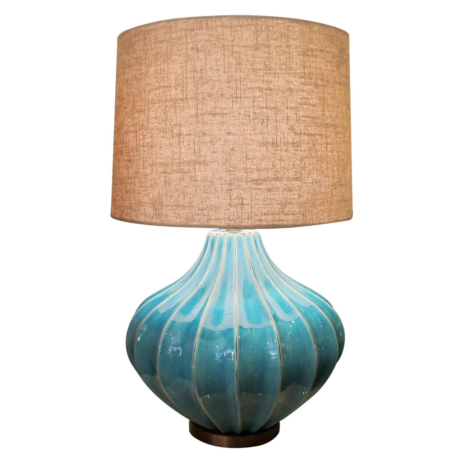Pair of English table lamps from the 1980s, featuring a vibrant turquoise crackled ceramic glaze that adds a unique texture and depth to each lamp. The ceramic parts are designed in a rounded, fluted shape, showcasing an elegant and flowing silhouette that draws the eye. Each lamp is mounted on a round brass base, providing a subtle contrast to the ceramic and adding a touch of warmth and vintage charm.