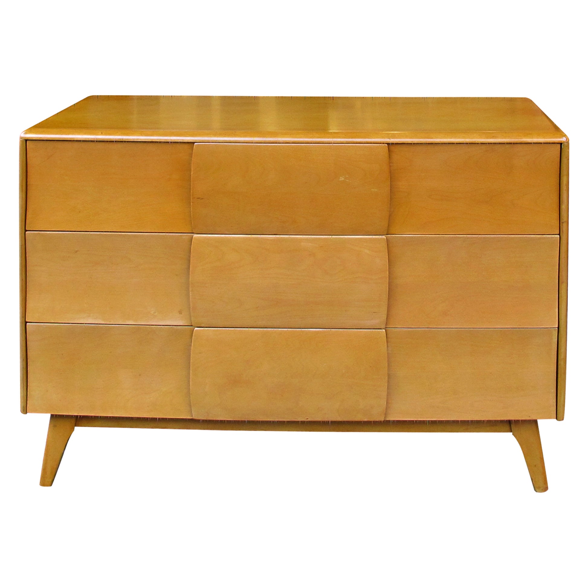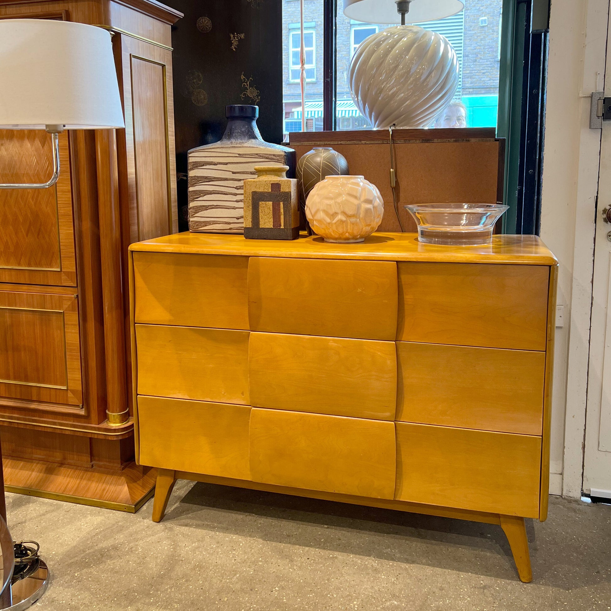 This pair of mid-century modern chests of drawers, crafted by the iconic American furniture manufacturer Heywood Wakefield, comes from the Kohinoor collection, dating to the 1960s. Constructed from solid blonde maple wood, these pieces boast clean lines and timeless elegance characteristic of the mid-century era. Each chest features three spacious drawers with sculptural, curved-front panels highlighting the brand’s craftsmanship and innovative design. The subtle curvature of the drawer fronts creates a dynamic and visually appealing façade.